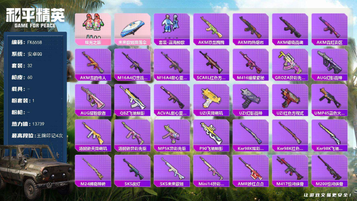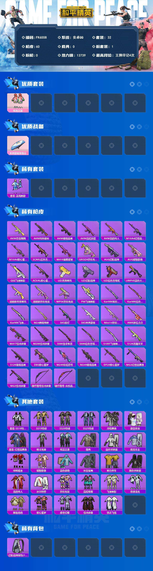 级55-地铁48点满天赋-粉装-炫光之旅-M416-暗星紫秘-AUG-幻影战神-身法素材号】 安卓 手Q-1粉装-0特效枪-0载具-0粉色飞行器-13739热力值-4王牌印记-32套装-60枪皮 【粉色套装】:粉装-炫光之旅 【粉色降落伞】:未来歌姬降落伞 【稀有套装】:套装-蓝海鲸歌 【稀有枪皮】:AKM-恐龙拽拽,AKM-灼热熔岩,AKM-破晓战魂,AKM-霓虹街区,AKM