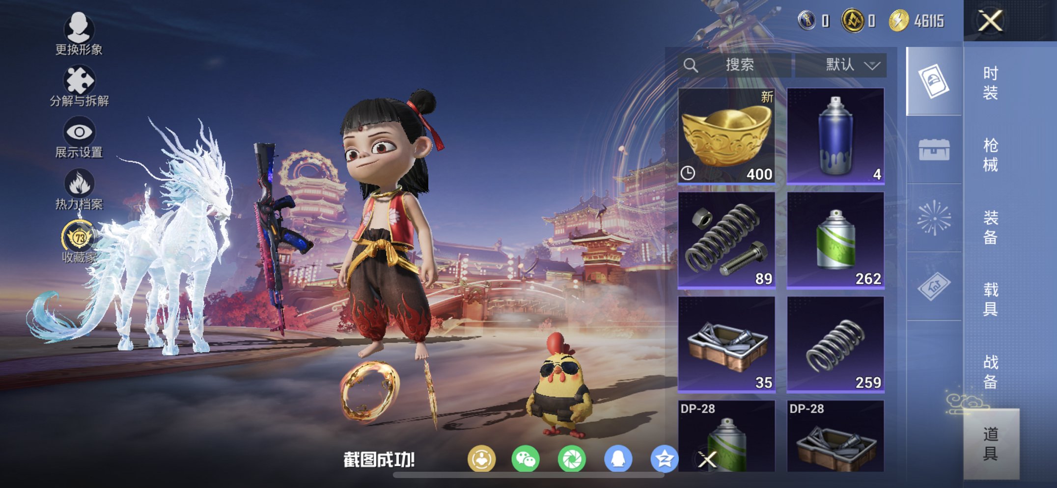 【4级哪吒黄螳螂8粉装5特效枪1载具1集结舱身法素材号 秒换绑不用等】 苹果Q区-88622热力值-17印记-206套装-281枪皮 【1红装】 魔童闹海-哪吒(4级)【1载具】 冰绡玉鳞【8粉装】 零号机款机体服(黄螳螂) 星之彼岸 绝对恒星 金曜白虎 PEL轰鸣竞梦者 角色-异瞳寒姬 角色-羊梦糖心 金丰海韵【5特效枪】 M249-绝对恒星(1级) AUG-星之彼岸(7级) Kar98K-巳巳如意(5级) DP-28-豹影疾电(5级) SCAR-L-魔童闹海 哪吒(3级)【256热门】 雪山