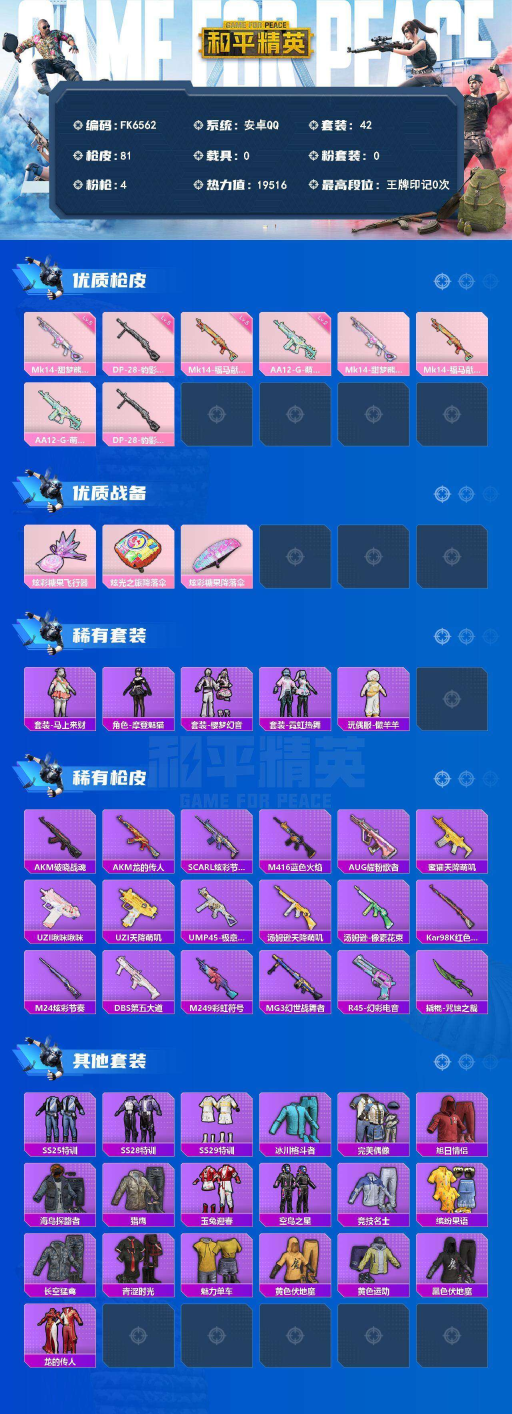 8点满天赋-4特效枪-五级Mk14-甜梦熊击-角色-摩登魅猫-樱梦幻音-精品女号】 安卓 手Q-0粉装-4特效枪-0载具-1粉色飞行器-19516热力值-1王牌印记-42套装-81枪皮 【粉色枪皮等级】:Mk14-甜梦熊击(五级),Mk14-福马献瑞(五级),AA12-G-萌骑幻想(二级),DP-28-豹影疾电(五级) 【粉色枪皮】:Mk14-甜梦熊击,Mk14-福马献瑞,AA
