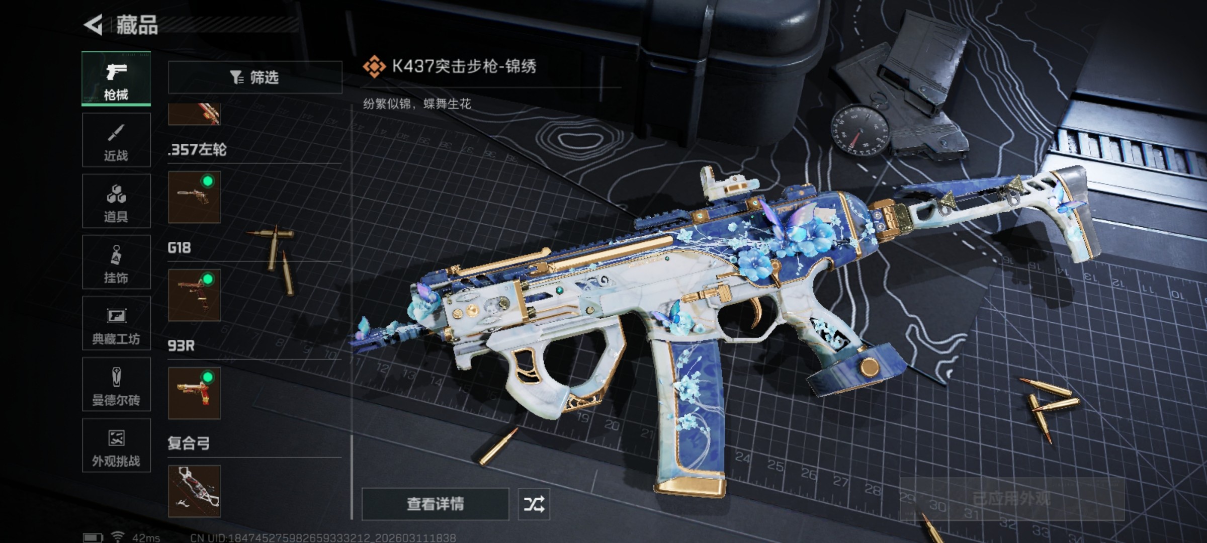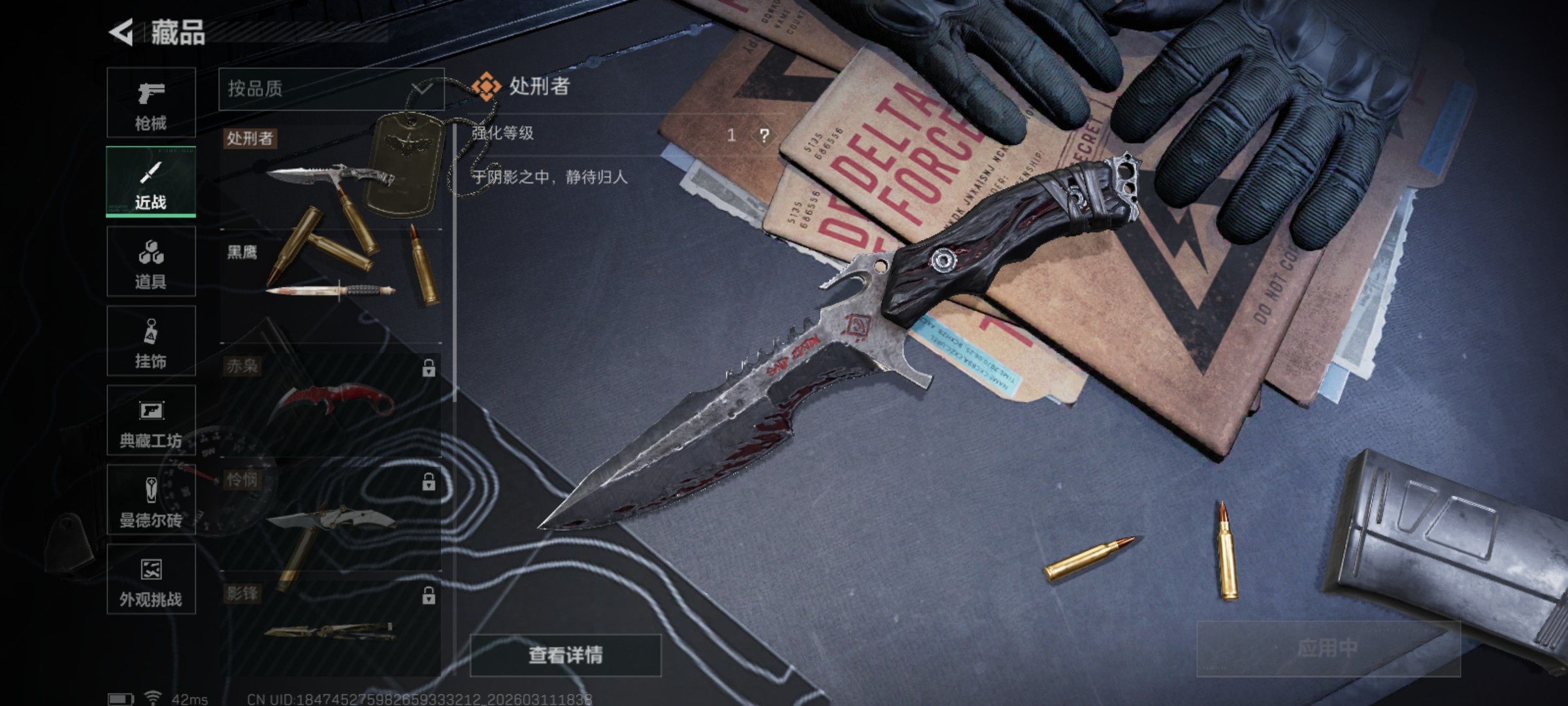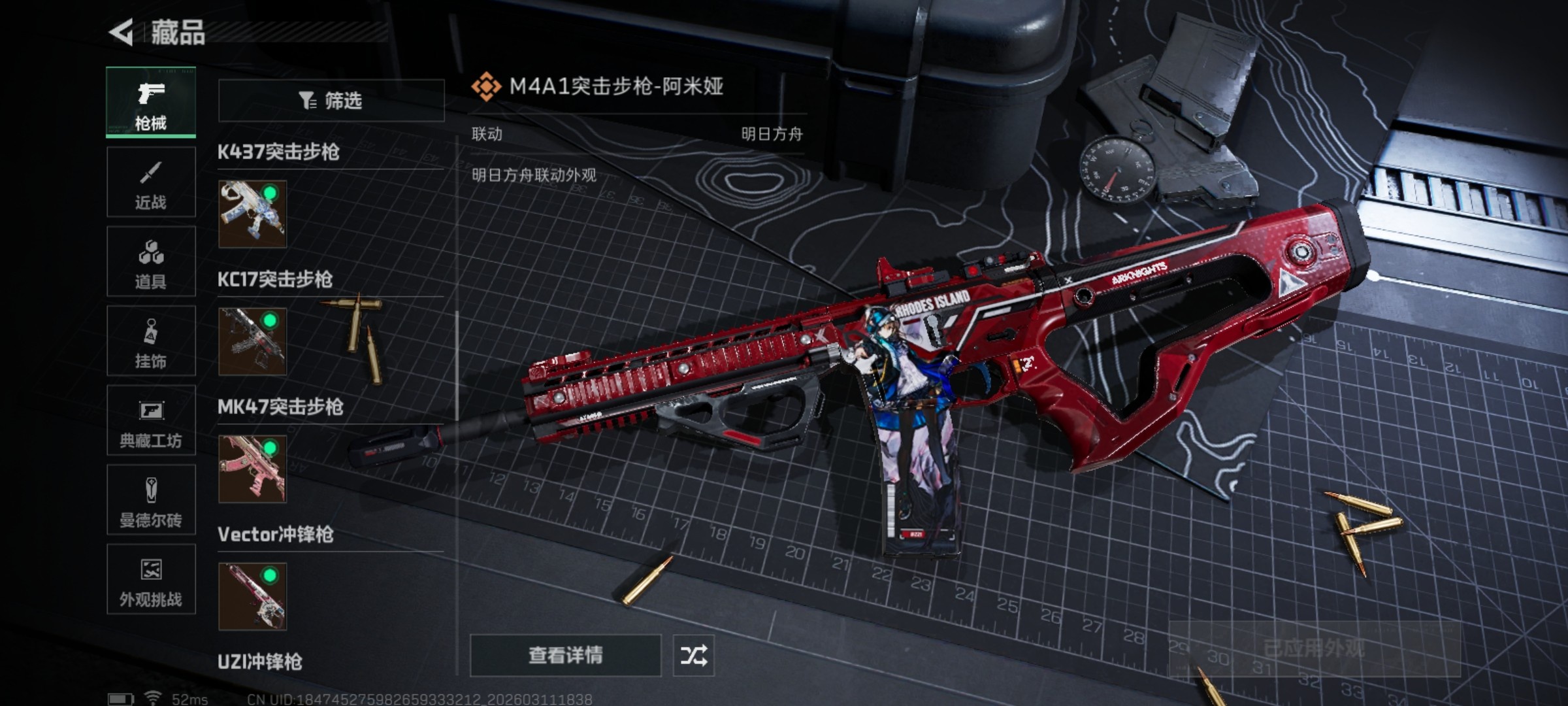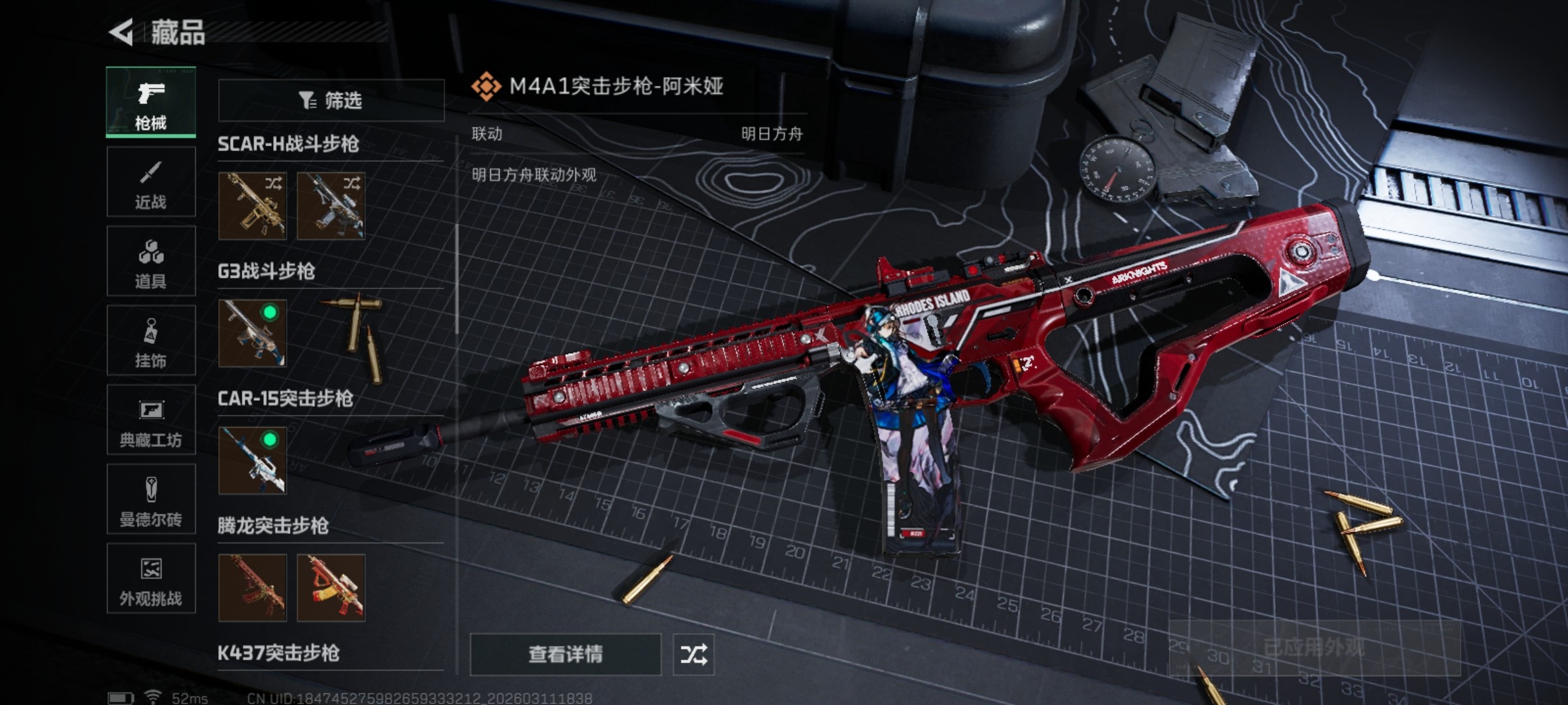 QQ区 哈夫币:171082981 干员外观数:3 近战数:1 枪械数:124 载具数:11 烽火地带等级:60 全面战场等级:25 烽火地带段位:铂金 全面战场段位:列兵 特勤处:技术中心Lv.3|工作台Lv.2|制药台Lv.3|防具台Lv.3 捆绑包:特斯拉线圈捆绑包|捞点薯条捆绑包 干员外观:露娜-黑·天际线|骇爪-水墨云图|红狼-电锯惊魂 近战:黑鹰 枪械:KC17突击步枪-电锯惊魂|腾龙突击步枪-捞点薯条|CAR-15突击步枪-阿米娅|G3战斗步枪-骑士|SCAR-H战斗步枪-水墨云图
