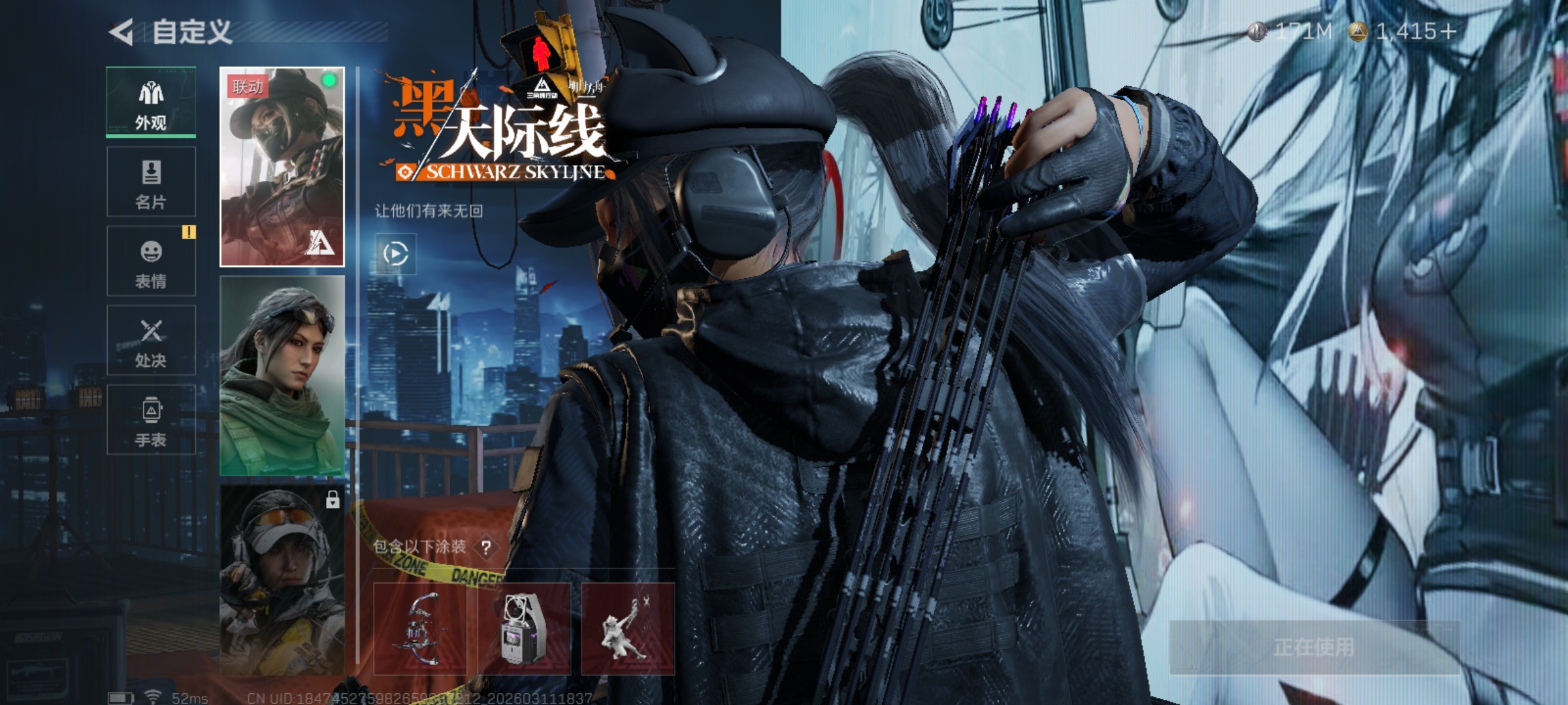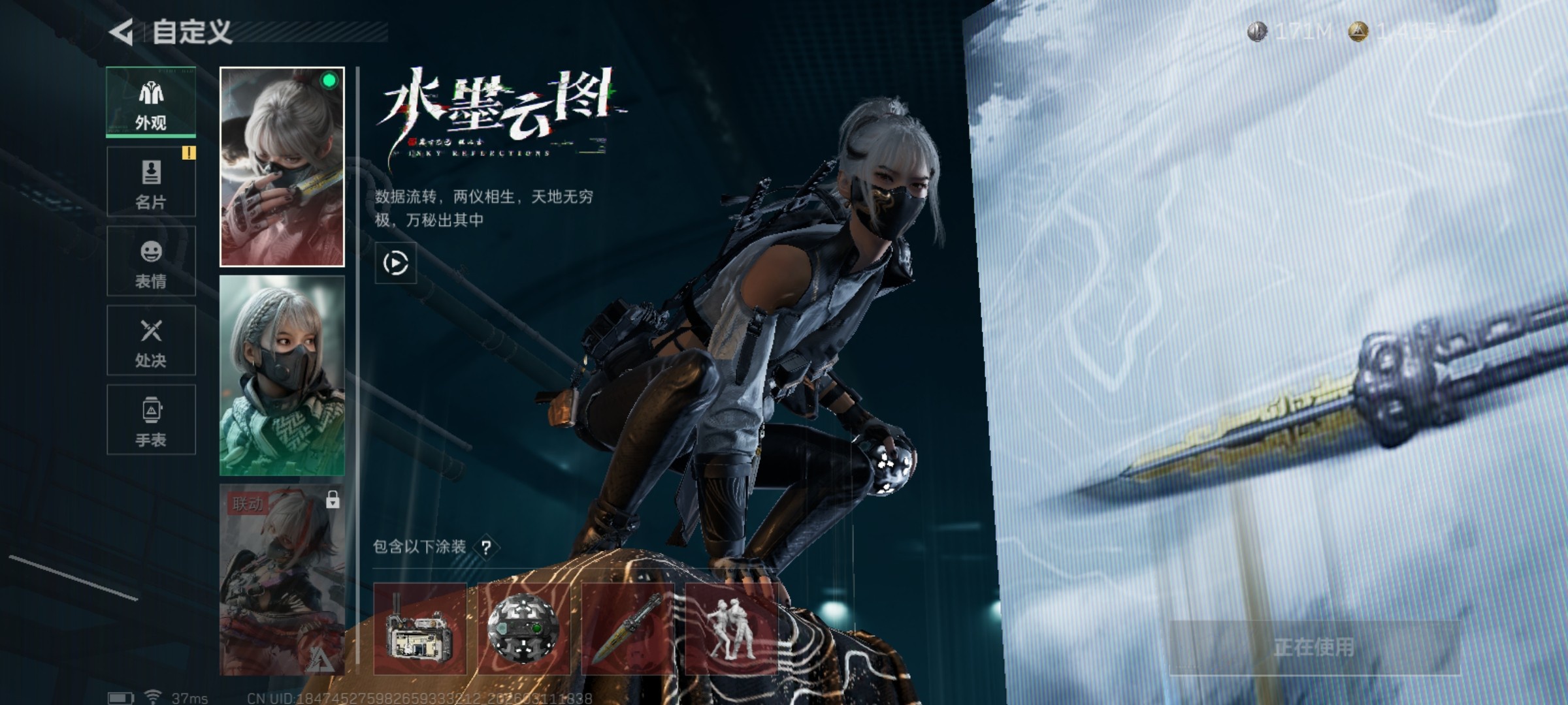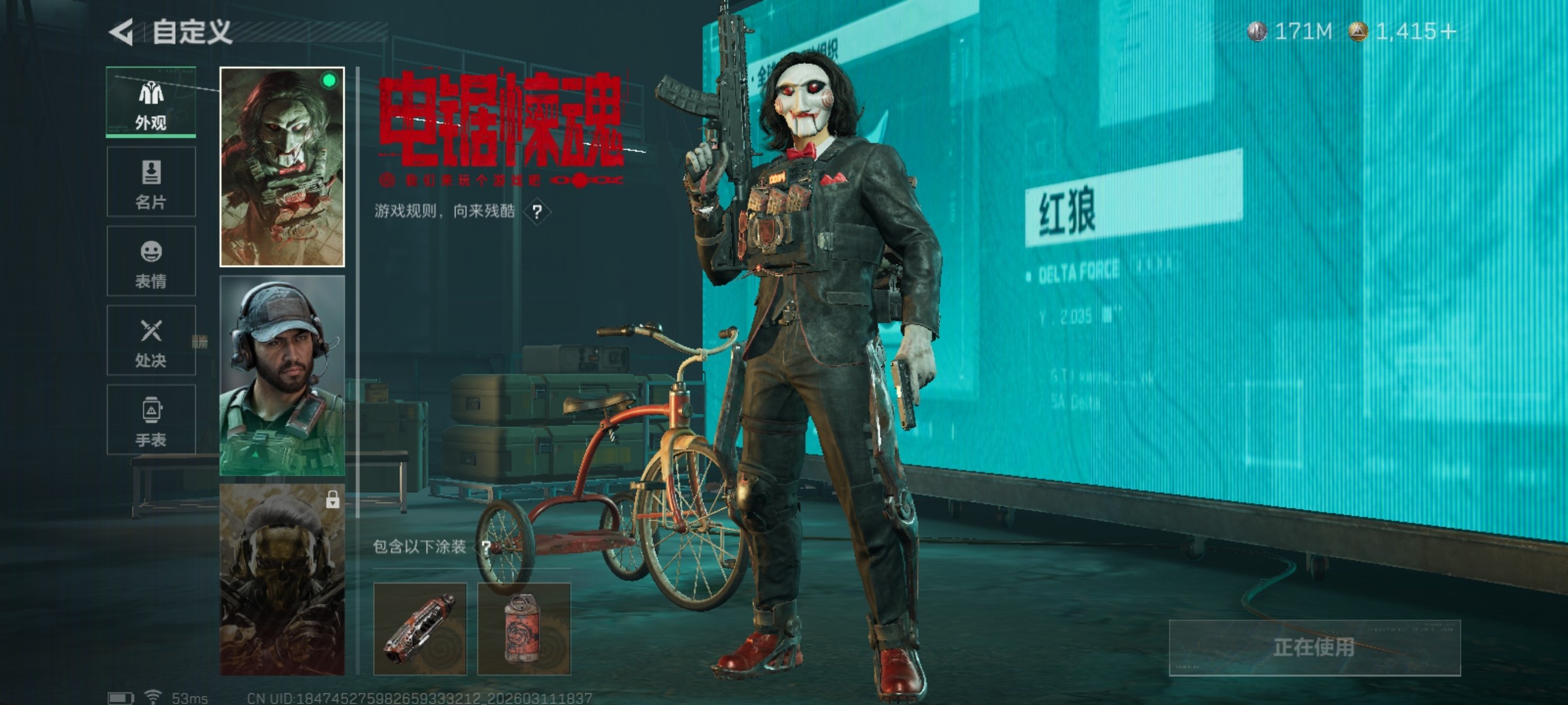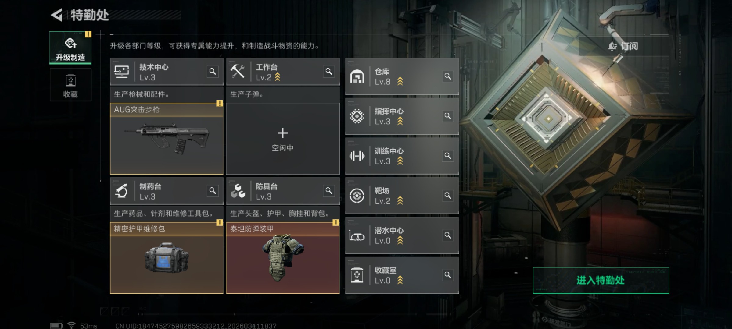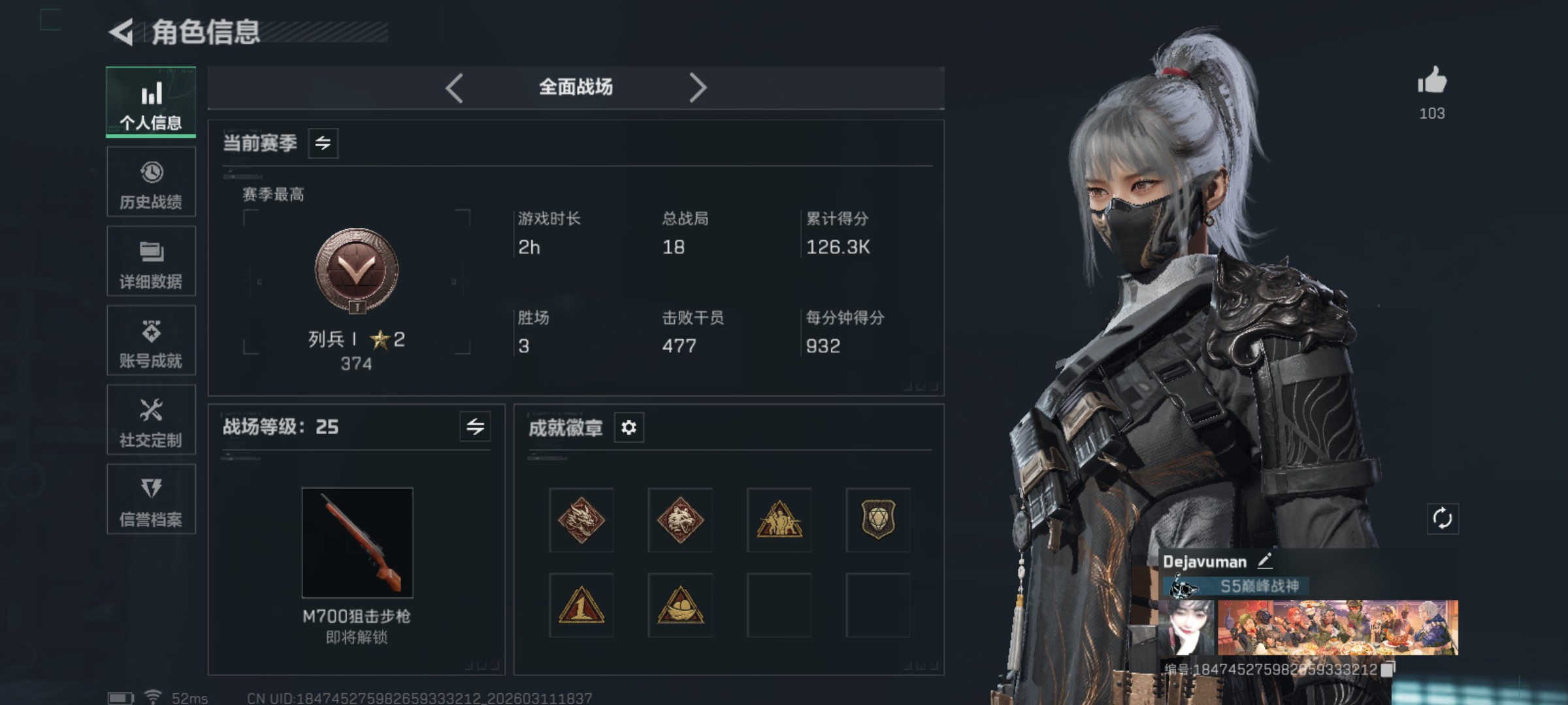 QQ区 哈夫币:171082981 干员外观数:3 近战数:1 枪械数:124 载具数:11 烽火地带等级:60 全面战场等级:25 烽火地带段位:铂金 全面战场段位:列兵 特勤处:技术中心Lv.3|工作台Lv.2|制药台Lv.3|防具台Lv.3 捆绑包:特斯拉线圈捆绑包|捞点薯条捆绑包 干员外观:露娜-黑·天际线|骇爪-水墨云图|红狼-电锯惊魂 近战:黑鹰 枪械:KC17突击步枪-电锯惊魂|腾龙突击步枪-捞点薯条|CAR-15突击步枪-阿米娅|G3战斗步枪-骑士|SCAR-H战斗步枪-水墨云图