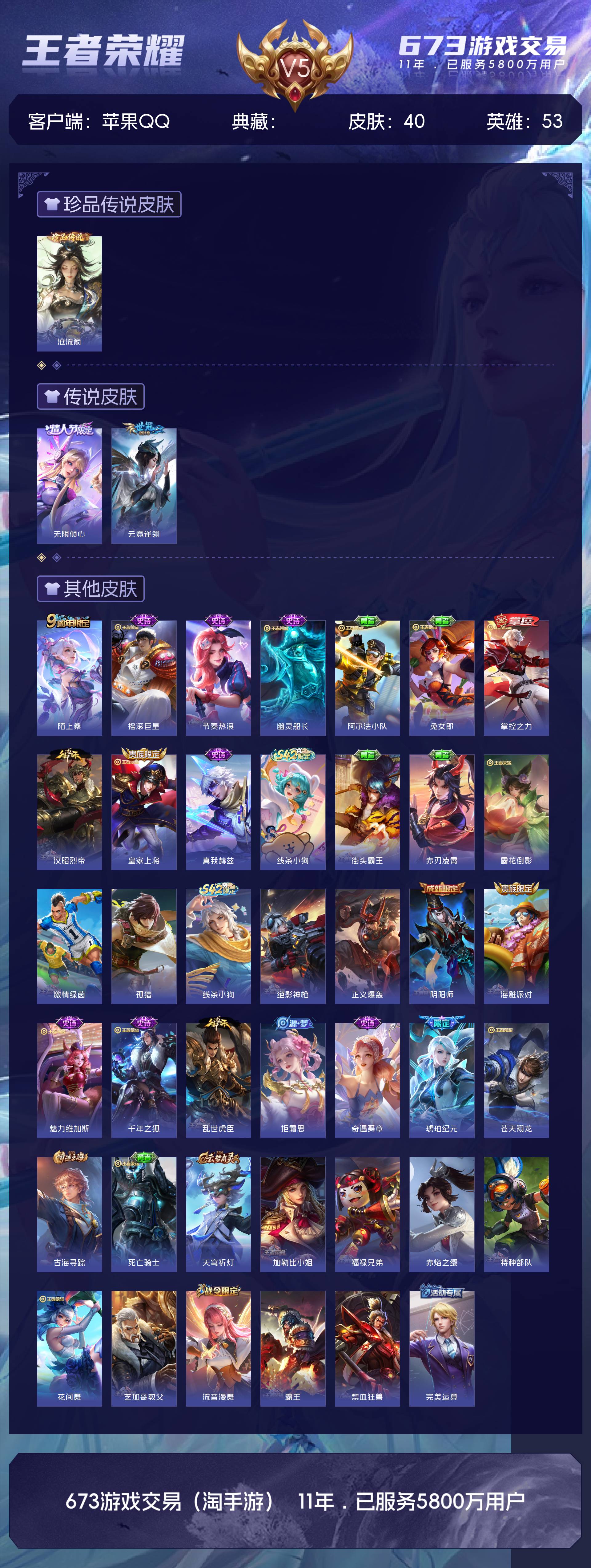 V5 皮肤40 英雄53 至圣王者 珍品传说1 星传说1 传说2 其他皮肤41