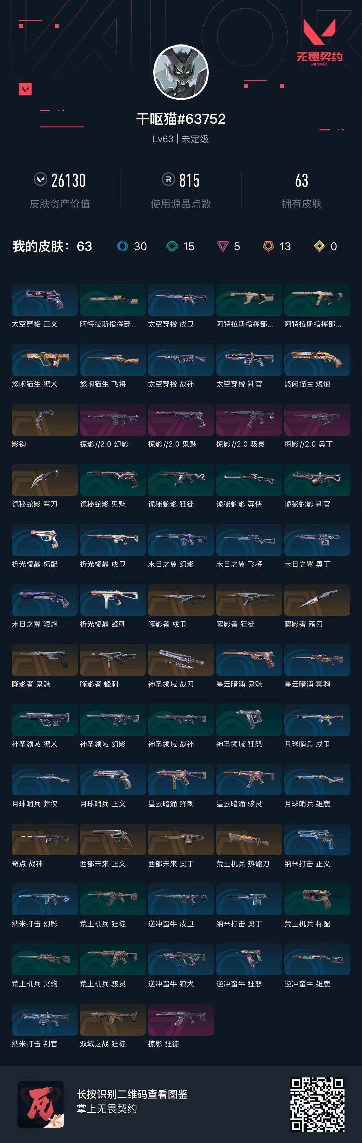 终极*13/卓越*5/皮肤*63/等级*63/段位:未定级/噬影者