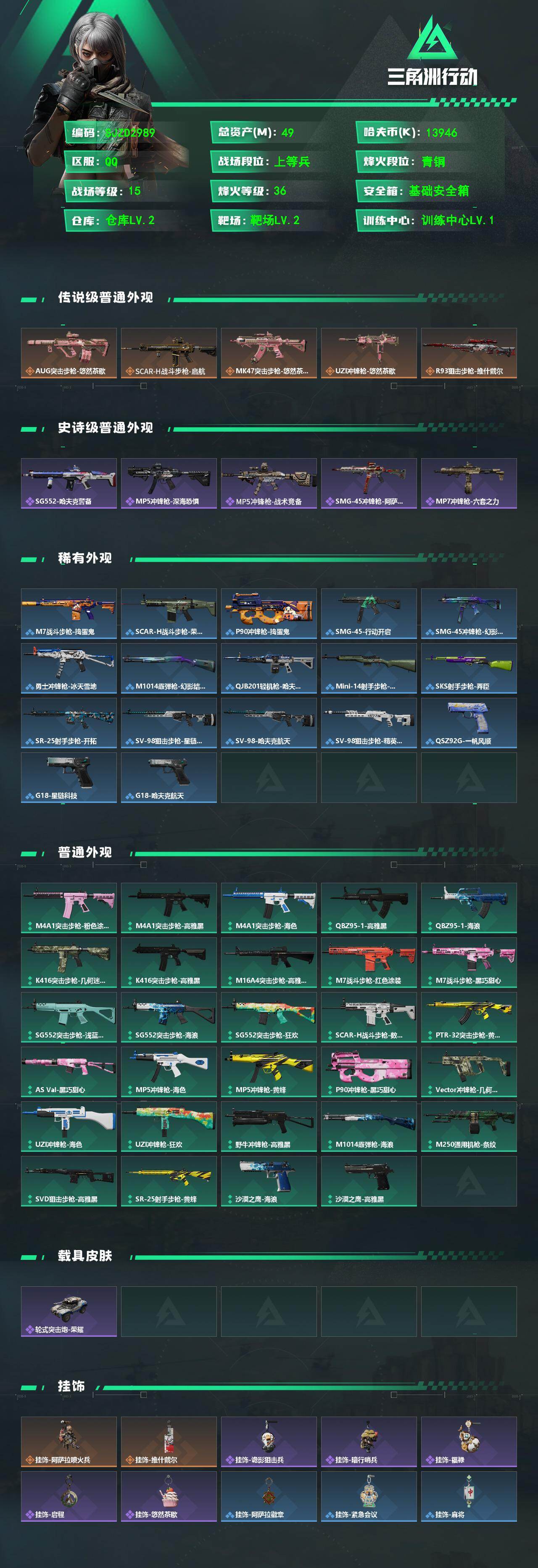 【SJZD2989】总资产(M):49M/哈夫币(K):13946K/哈夫币(K):13946K/传说枪皮数:5/全面战场等级:15_段位:上等兵/烽火地带等级:36_段位:青铜/AUG突击步枪-悠然茶歇/SCAR-H战斗步枪-启航/MK47突击步枪-悠然茶歇/UZI冲锋枪-悠然茶歇/R93狙击步枪-维什戴尔/SG552突击步枪-哈夫克警备/MP5冲锋枪-深海恐惧/MP5冲锋枪-战术竞备/SMG-45冲锋枪-阿萨拉特攻/MP7冲锋枪-六套之力/M7战斗步枪-捣蛋鬼/SCAR-H战斗步枪-荣耀列队