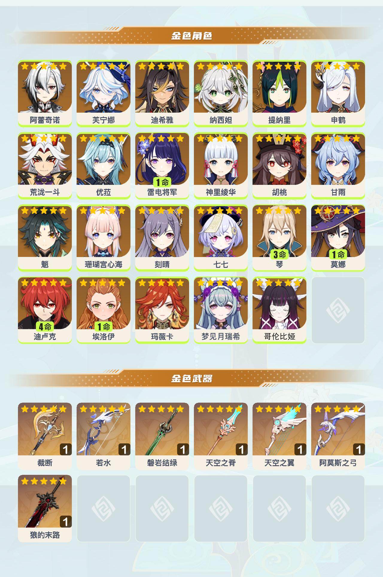 【YSYT1037】59级/40黄/女主/23个五星角色/8个五星武器/玛薇卡/1命雷电将军/纳西妲/荒泷一斗/魈/3命琴/优菈/甘雨/神里绫华/胡桃/4命迪卢克/1命莫娜/申鹤/七七/珊瑚宫心海/芙宁娜/迪希雅/0命埃洛伊/刻晴/阿蕾奇诺/梦见月瑞希/提纳里/0命哥伦比娅/阿莫斯之弓/天空之翼/天空之脊/裁断/磐岩结绿/狼的末路/若水