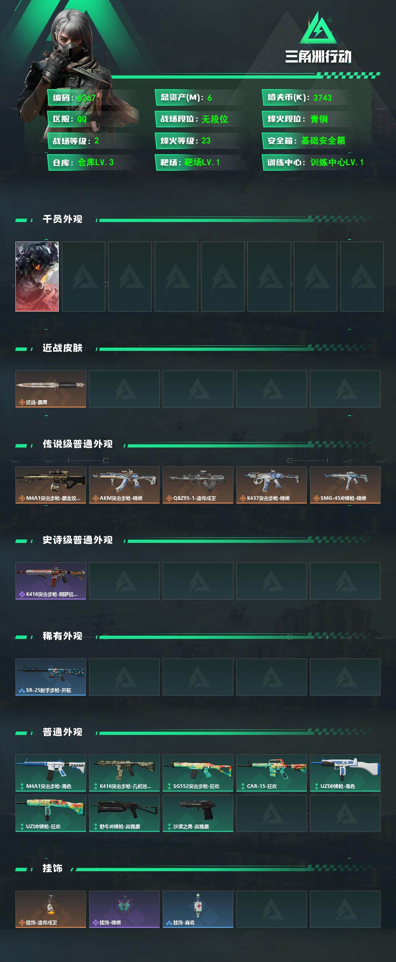 {特价出售}{可二次实名}等级:23总资产:6.6M 纯币3743K 红皮:威龙-凌霄戍卫 特勤处:仓库3,训练1,靶场1 部门11111