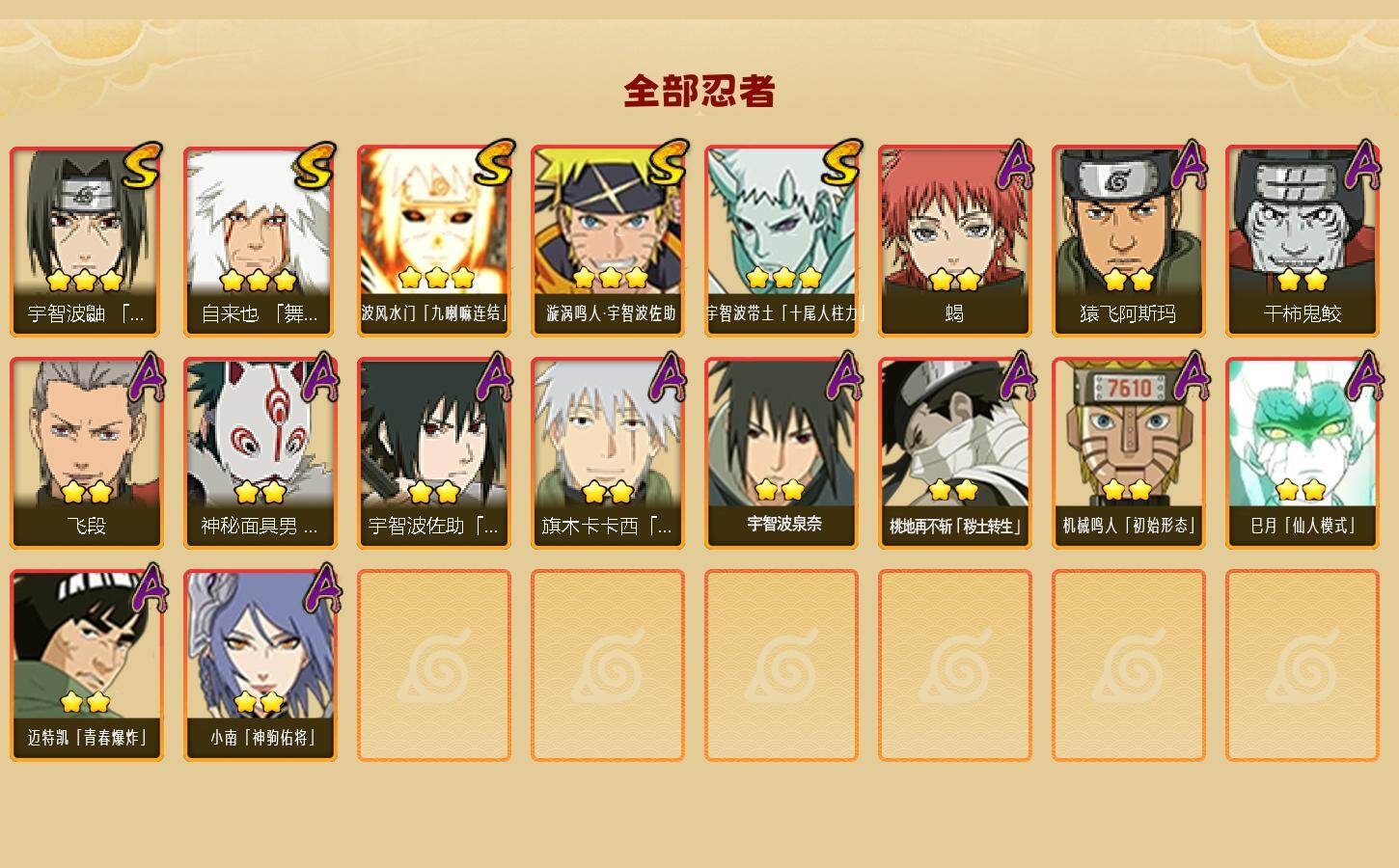 【HY4044】V5/战力318W/S忍5/A忍13/舞之豪杰-自来也/2星桃地再不斩「秽土转生」/3星波风水门「九喇嘛连结」/3星宇智波带土「十尾人柱力」/2星小南「神驹佑将」/蝎/飞段/3星漩涡鸣人·宇智波佐助/猿飞阿斯玛/2星宇智波泉奈/幻之真容-旗木卡卡西/2星巳月「仙人模式」/干柿鬼鲛/2星迈特凯「青春爆炸」/须佐能乎-宇智波佐助/忍者之路-神秘面具男/2星机械鸣人「初始形态」/须佐能乎-宇智波鼬