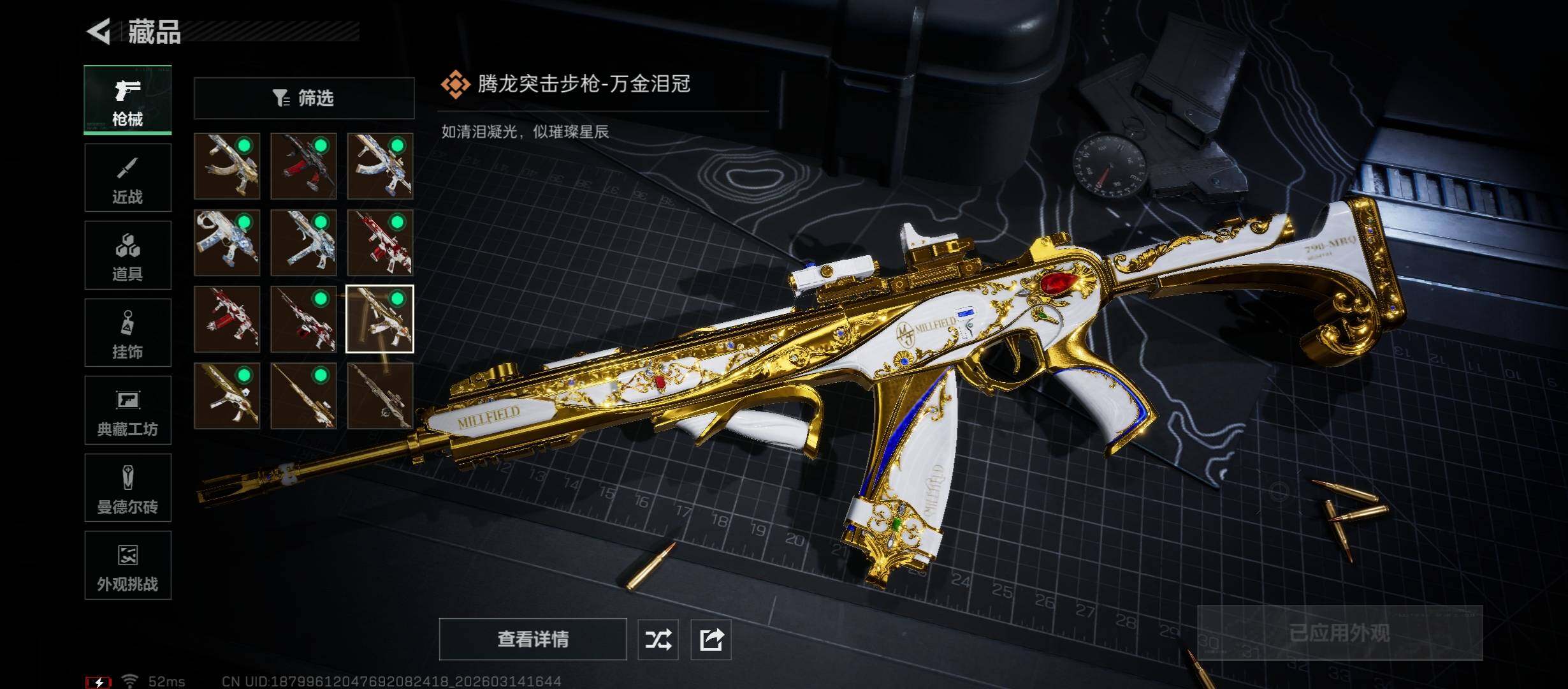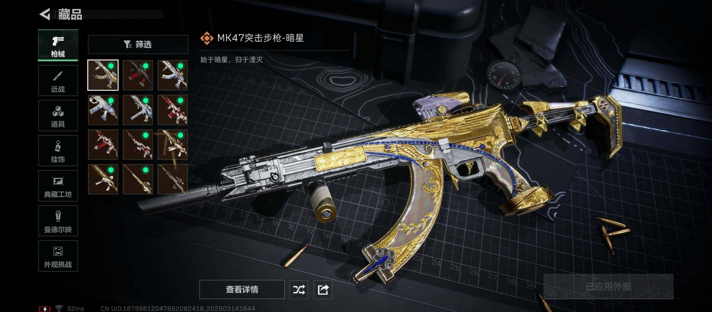 【传说外观】:AKM突击步枪-锦绣,SCAR-H战斗步枪-荼蘼,腾龙突击步枪-万金泪冠,K437突击步枪-锦绣,MK47突击步枪-暗星,SMG-45冲锋枪-锦绣,SR-3M紧凑突击步枪-暗星,SR-3M紧凑突击步枪-荼蘼,勇士冲锋枪-万金泪冠,PKM通用机枪-