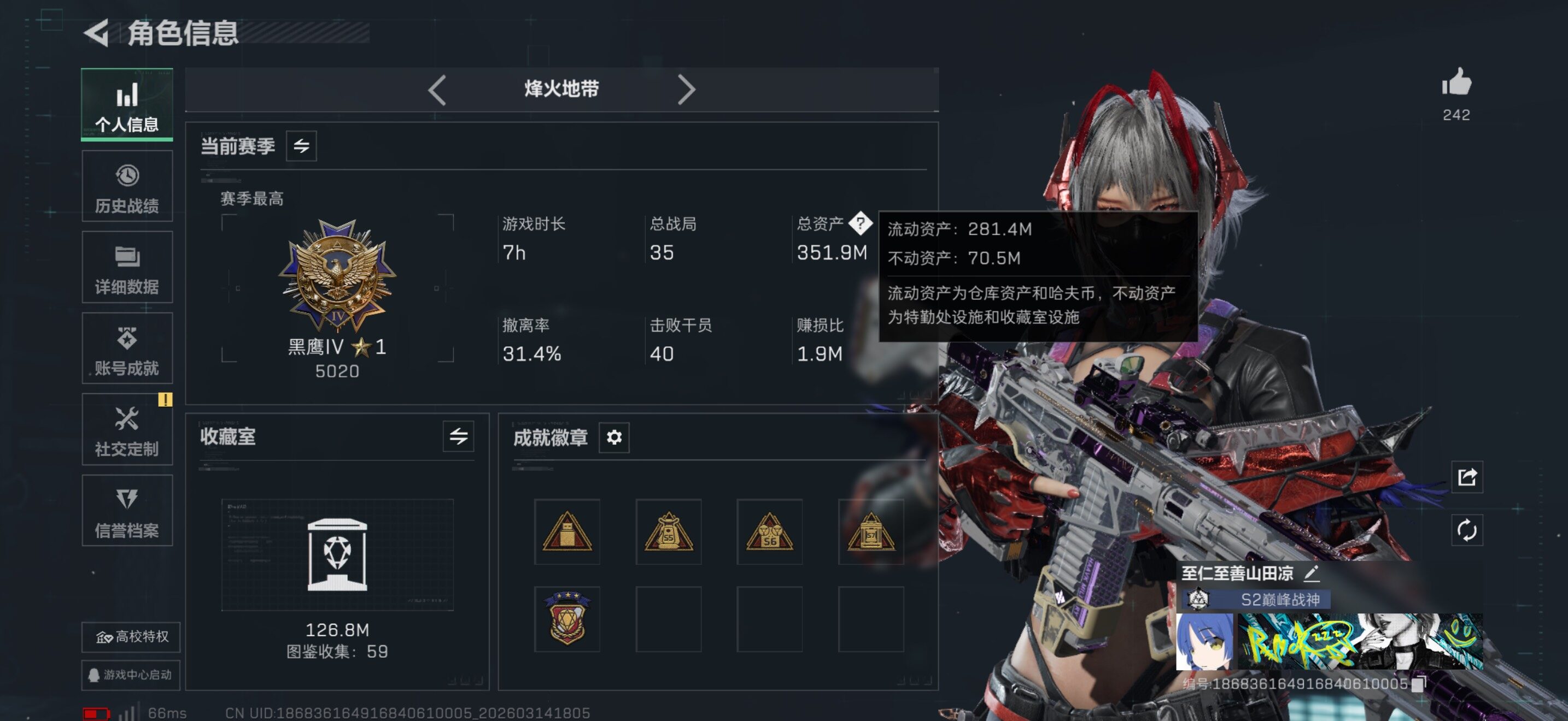 【高氪金土豪号-四红皮+四刀皮+一典藏皮肤+铁面判官】【Q区三端互通】【【无二次】】YXz9203-特勤处:仓库10级/靶场7级/训练中心7级-总资产351m-哈夫币532w-烽火等级:60级