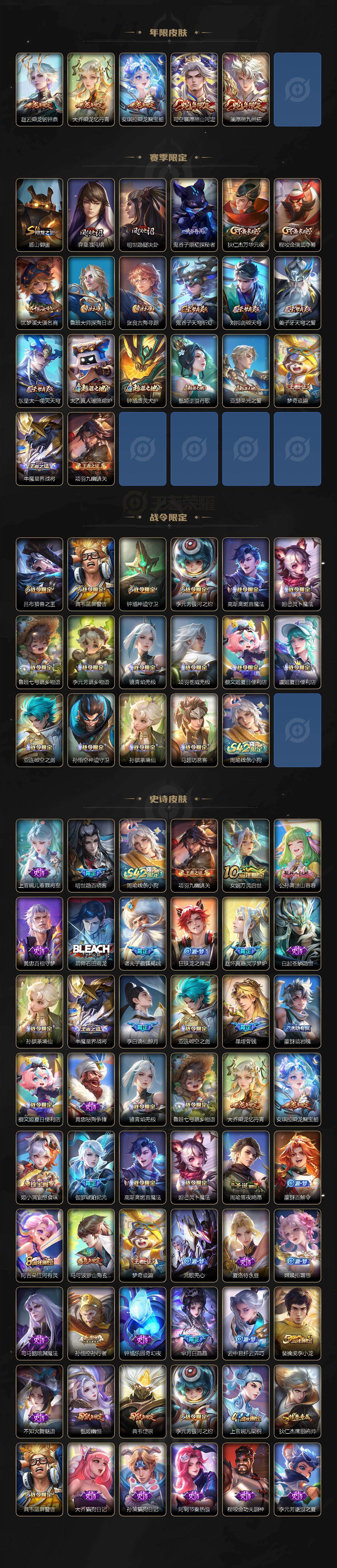 【传说皮肤】:后羿神树通天,司空震愿照山河定,澜愿照九州拓,桑启鸣野蒿,孙尚香乘龙问璇玑,孙策乘龙淬吴钩,赵云乘龙铭钟鼎,澜逐花归海,镜炽阳神光,虞姬启明星使,张良黄金白羊座,干将莫邪久胜战神,达摩黄金狮子座,梦奇胖达荣荣,后羿黄金射手座,宫本武藏地狱之眼,孙悟空地狱火