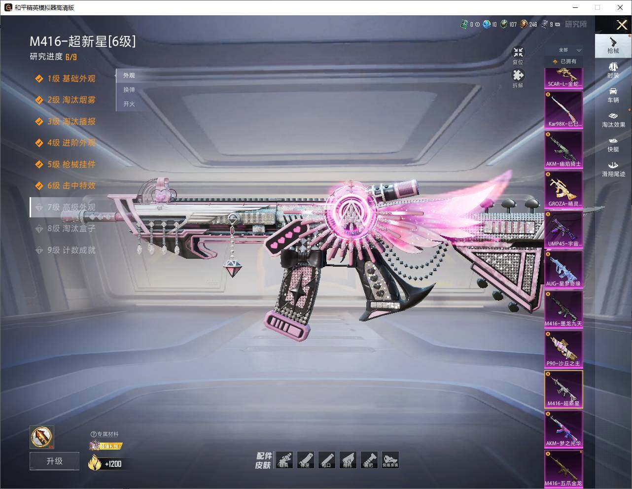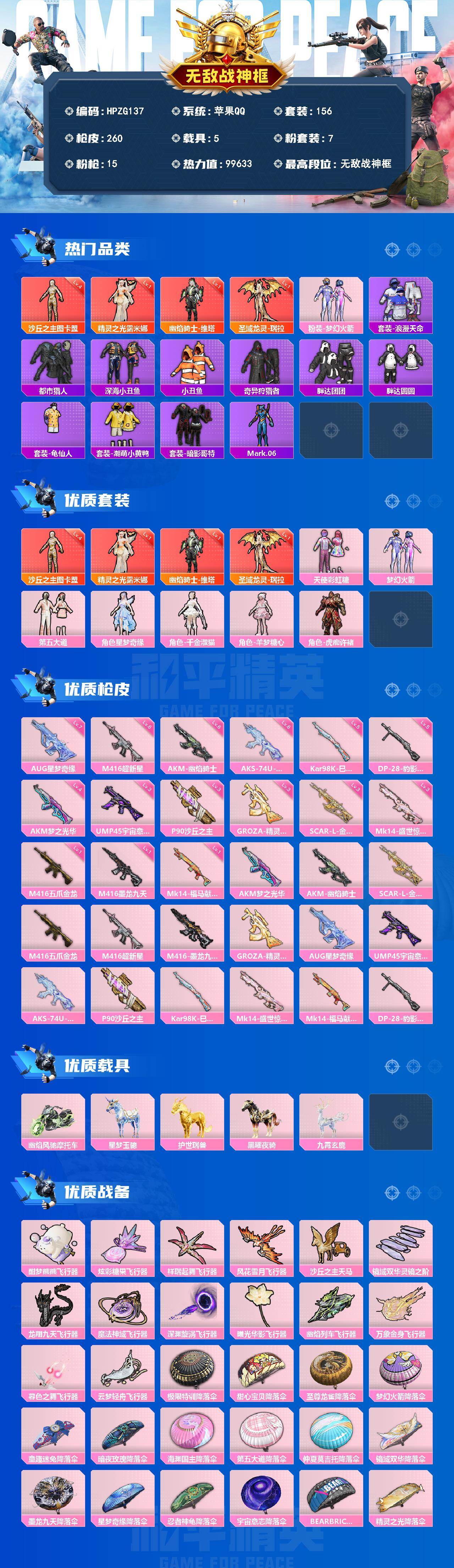 苹果 手Q-无敌战神框-4神装-7粉装-15特效枪-5载具-16粉色飞行器-99633热力值-14王牌印记-156套装-260枪皮