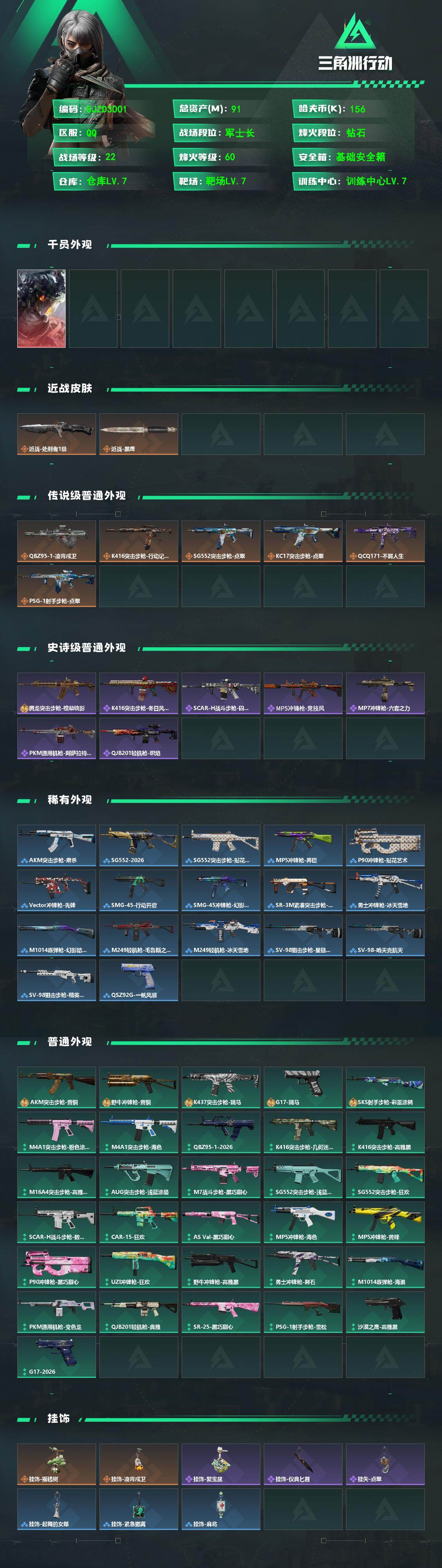 【SJZD3001】总资产(M):91M/哈夫币(K):156K/哈夫币(K):156K/传说枪皮数:6/全面战场等级:22_段位:军士长/烽火地带等级:60_段位:钻石/威龙-凌霄戍卫/近战-处刑者1级/近战-黑鹰/QBZ95-1突击步枪-凌霄戍卫/K416突击步枪-行动记录/SG552突击步枪-点翠/KC17突击步枪-点翠/QCQ171冲锋枪-不羁人生/PSG-1射手步枪-点翠/腾龙突击步枪-檀劫铳影/K416突击步枪-冬日风情/SCAR-H战斗步枪-囚徒/MP5冲锋枪-竞技风/MP7冲锋枪