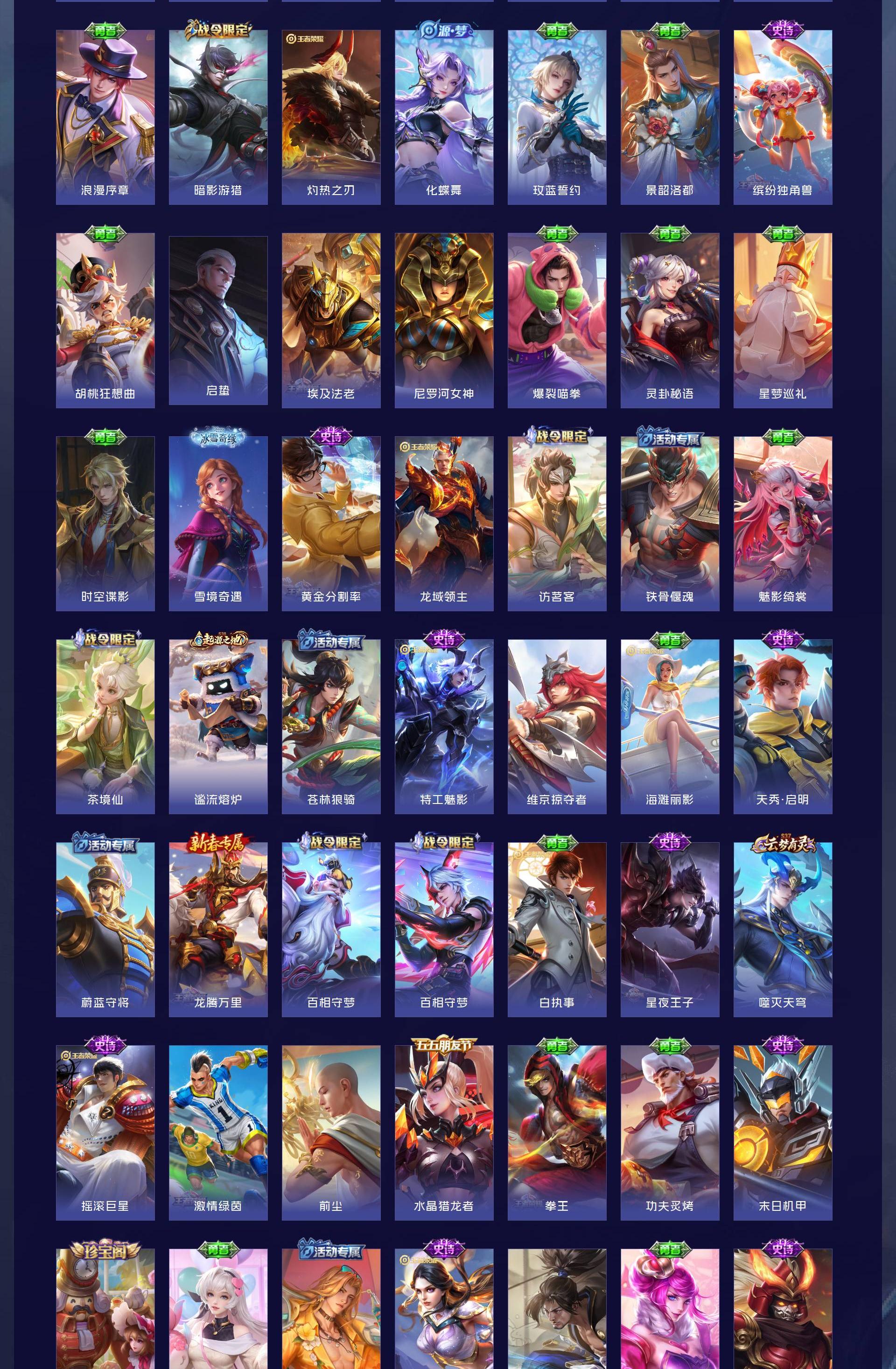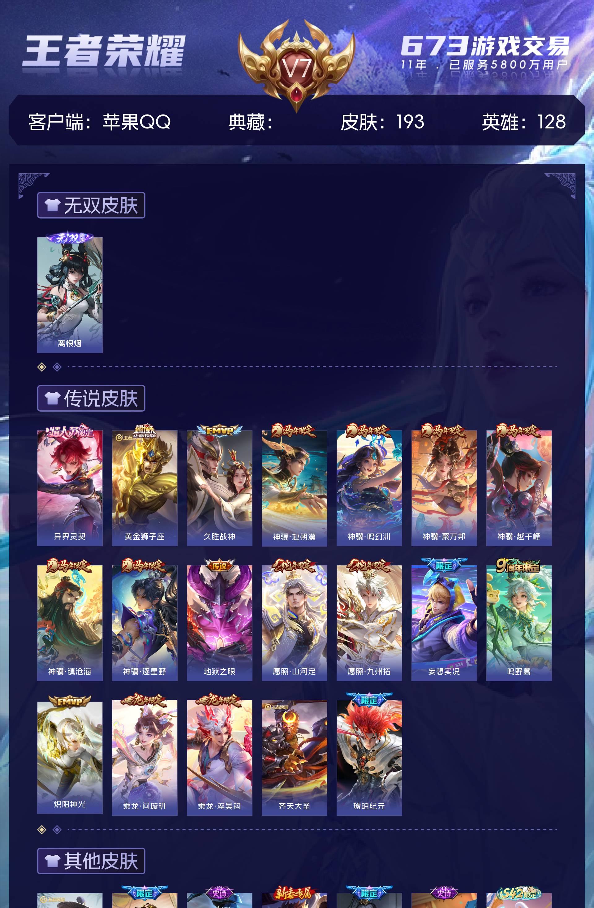 V7 皮肤193 英雄128 最强王者 无双皮肤1 星传说1 传说19 其他皮肤180