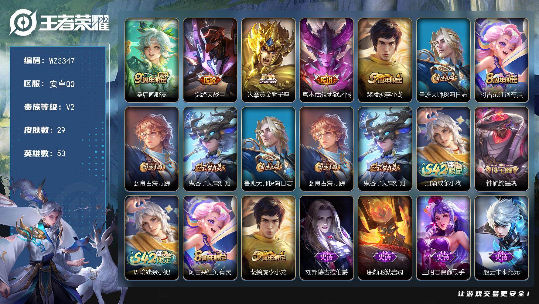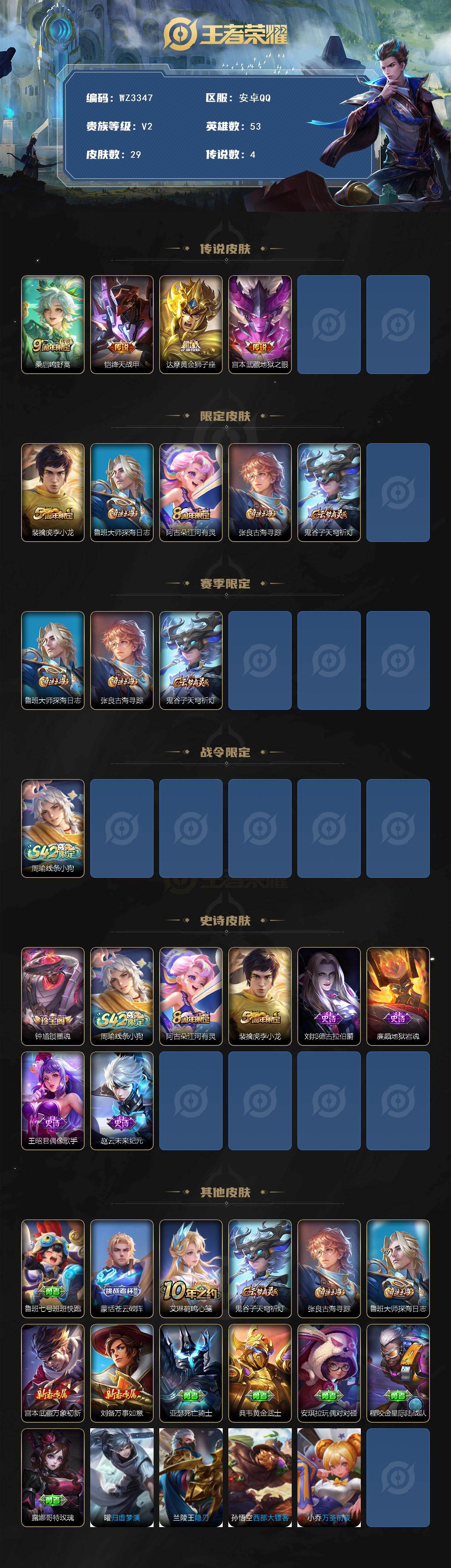 【秒换绑】安卓Q-V2-尊贵铂金I段位-53英雄-29皮肤-4传说-7史诗【