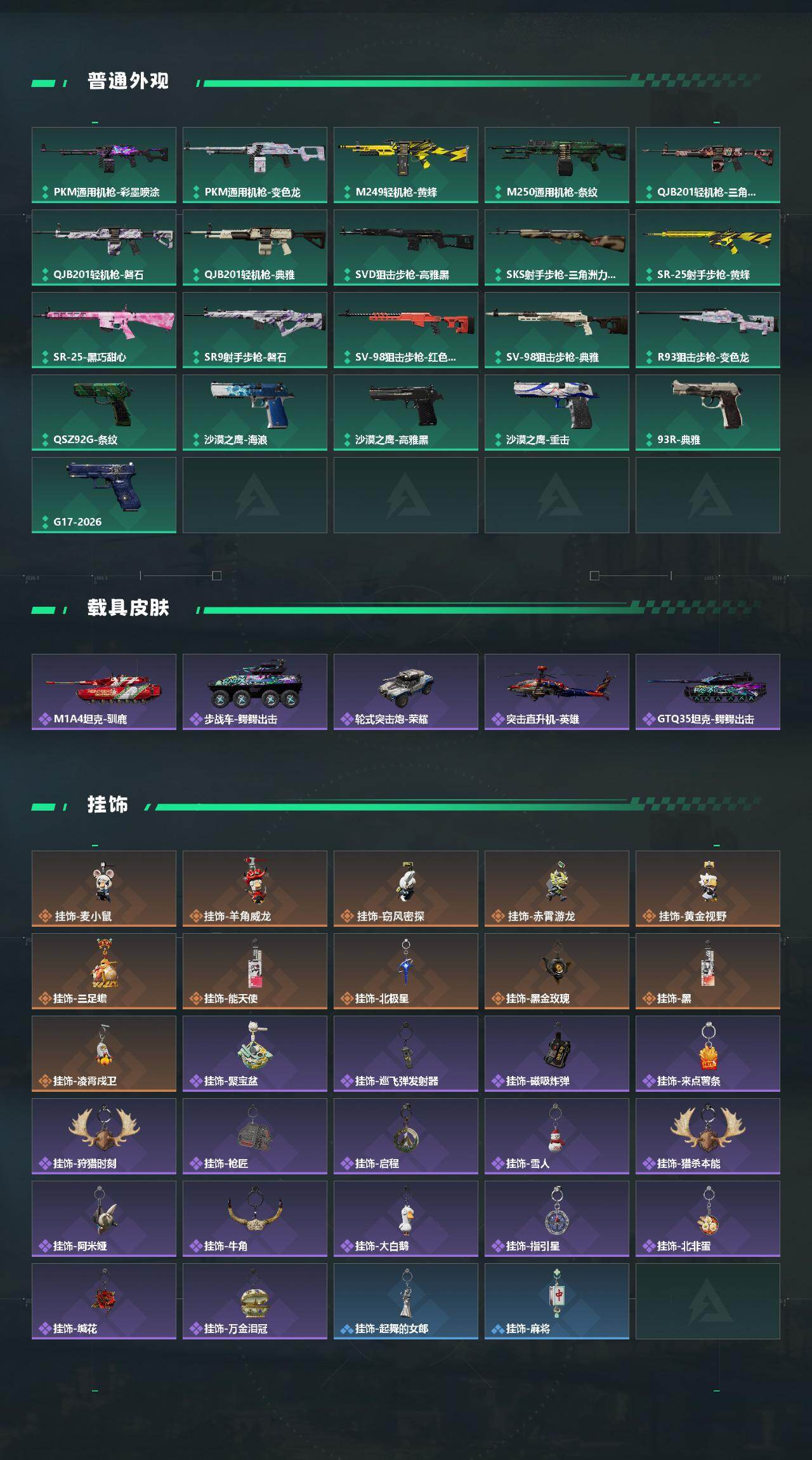 【传说外观】:M4A1突击步枪-蚀金玫瑰,M4A1突击步枪-阿米娅,QBZ95-1突击步枪-凌霄戍卫,ASh-12战斗步枪-鹅鸭杀,M16A4突击步枪-狩猎时刻,SG552突击步