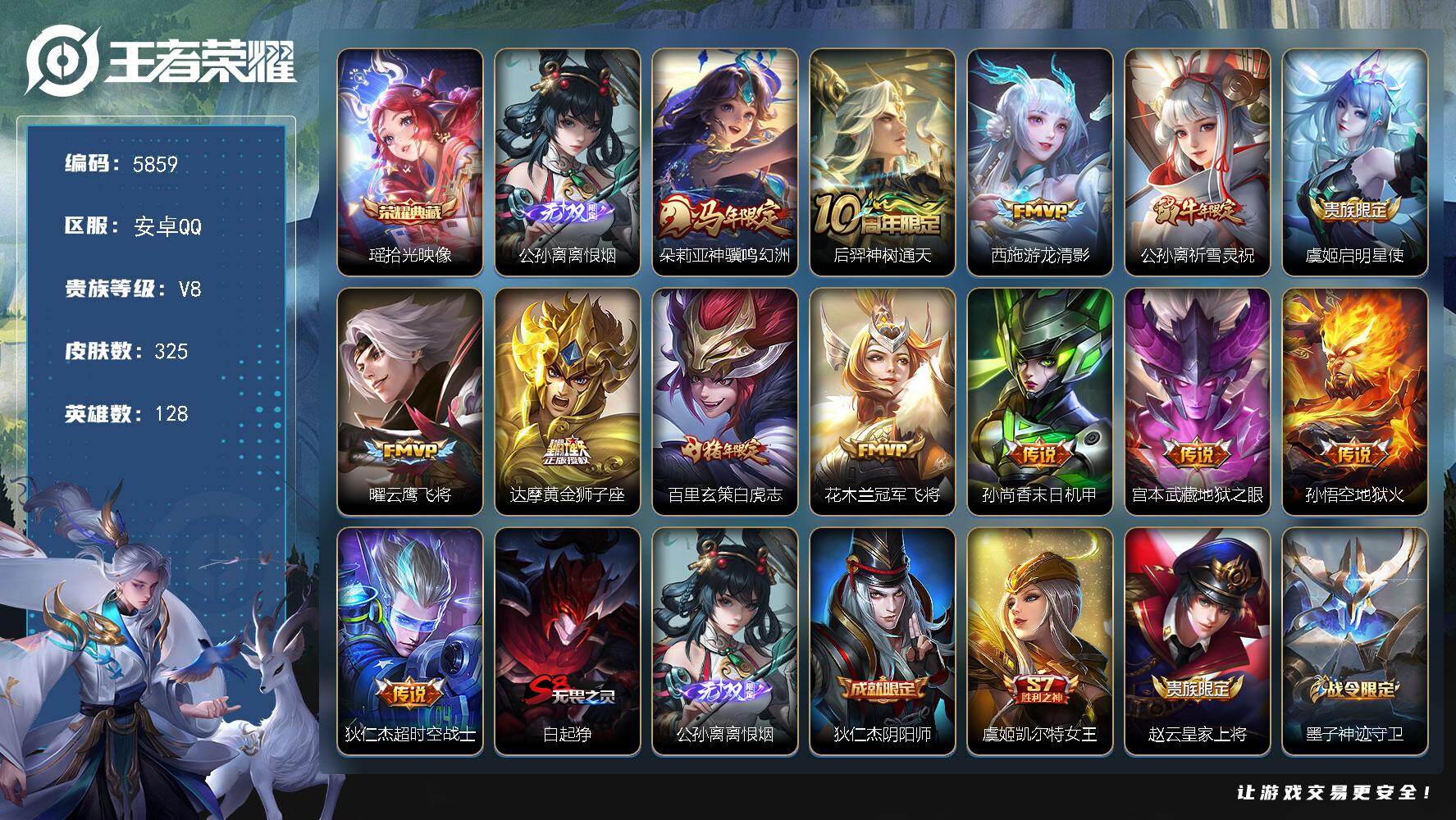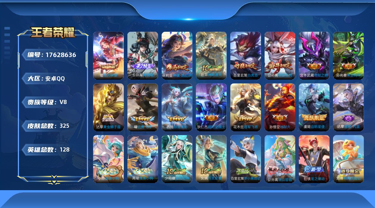339-[17628636]可二次 贵族8-金标虞姬-325皮-1典藏-1无双-13传说-猪八戒、达摩全皮-12改名卡 安卓手Q125区 营地ID220899219永恒钻石I【无双皮肤】:离恨烟【荣耀典藏】:拾光映像【优质限定皮肤】:祈雪灵祝,神威,白虎志【传说皮肤】:黄金狮子座,游龙清影,神骥·鸣幻洲,神树通天,祈雪灵祝,启明星使,云鹰飞将,地狱之眼,末日机甲,白虎志,冠军飞将,地狱火,超时空战士【史诗皮肤】:龙之律动,星君·亢金,线条小狗,罗小黑战记,妄想食味,猫狗日记,地狱岩魂,诗语江南,