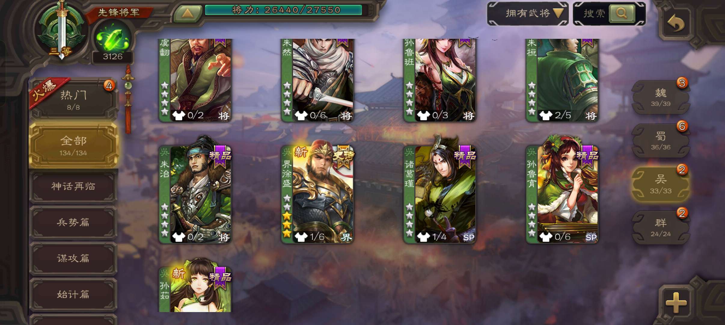 7史诗先锋,3100魂7万羽毛,大宝界徐盛傅佥神赵云神刘备花鬘沮授嵇康,霍峻谋韩当孙茹骥李典134将
