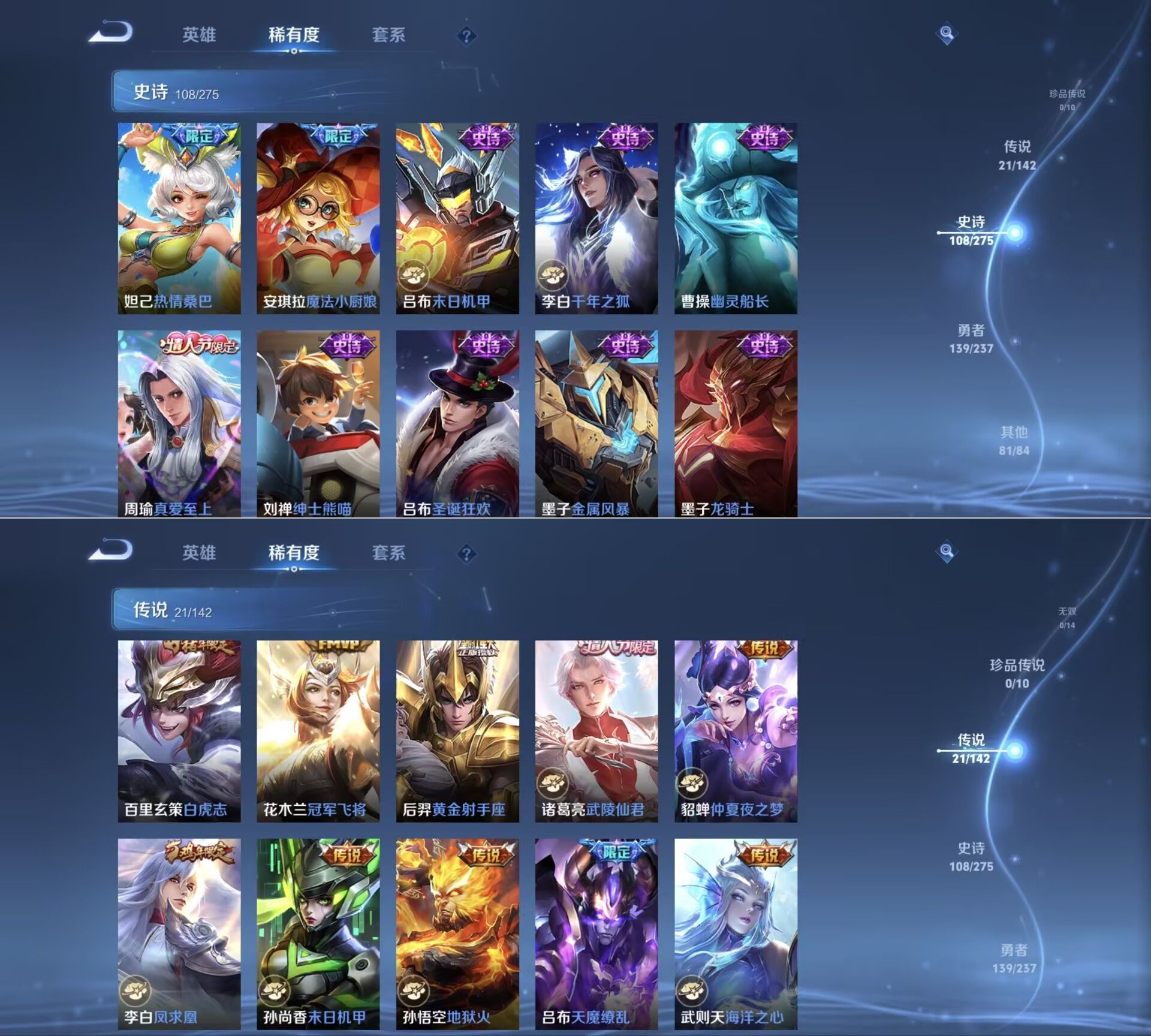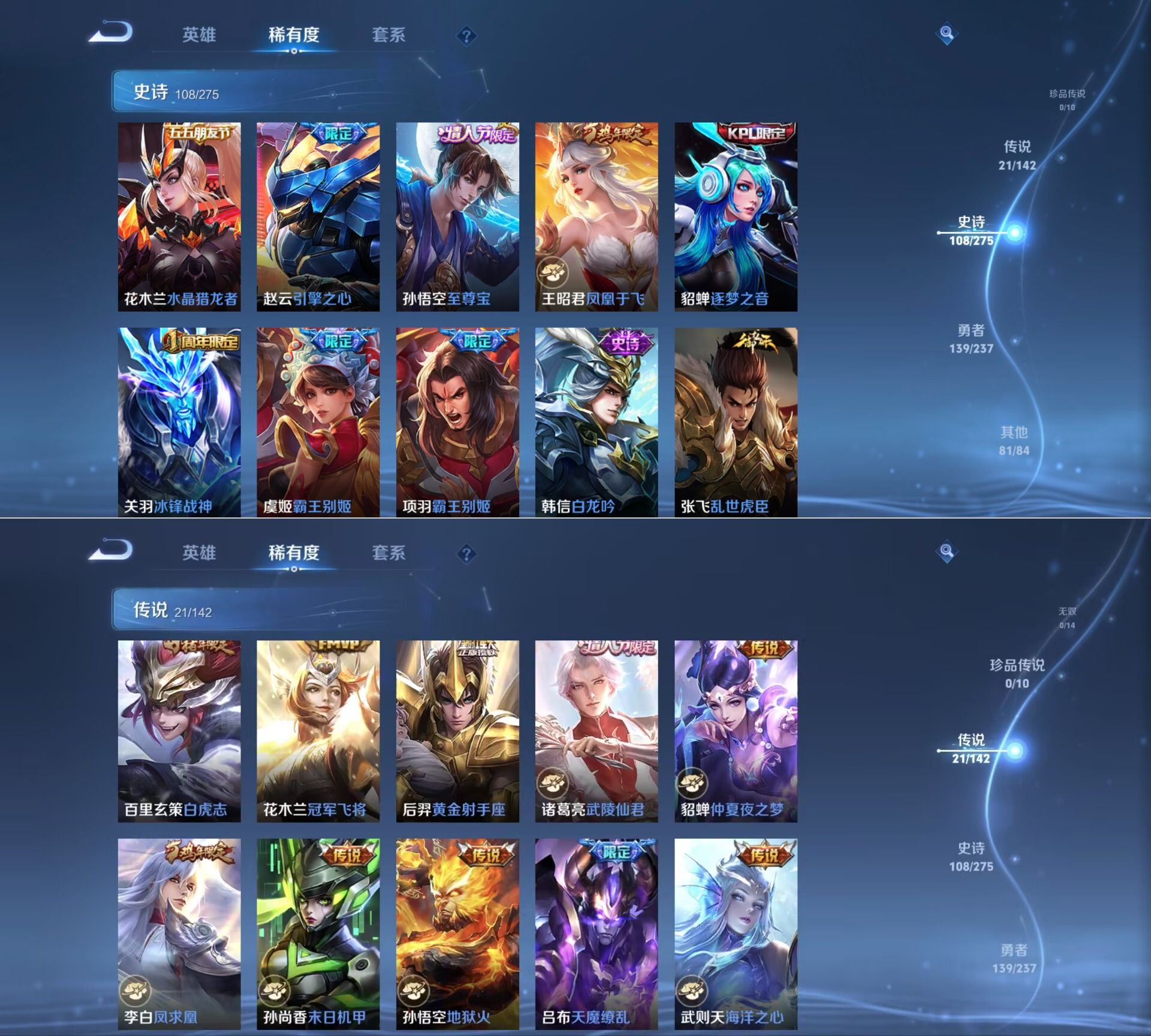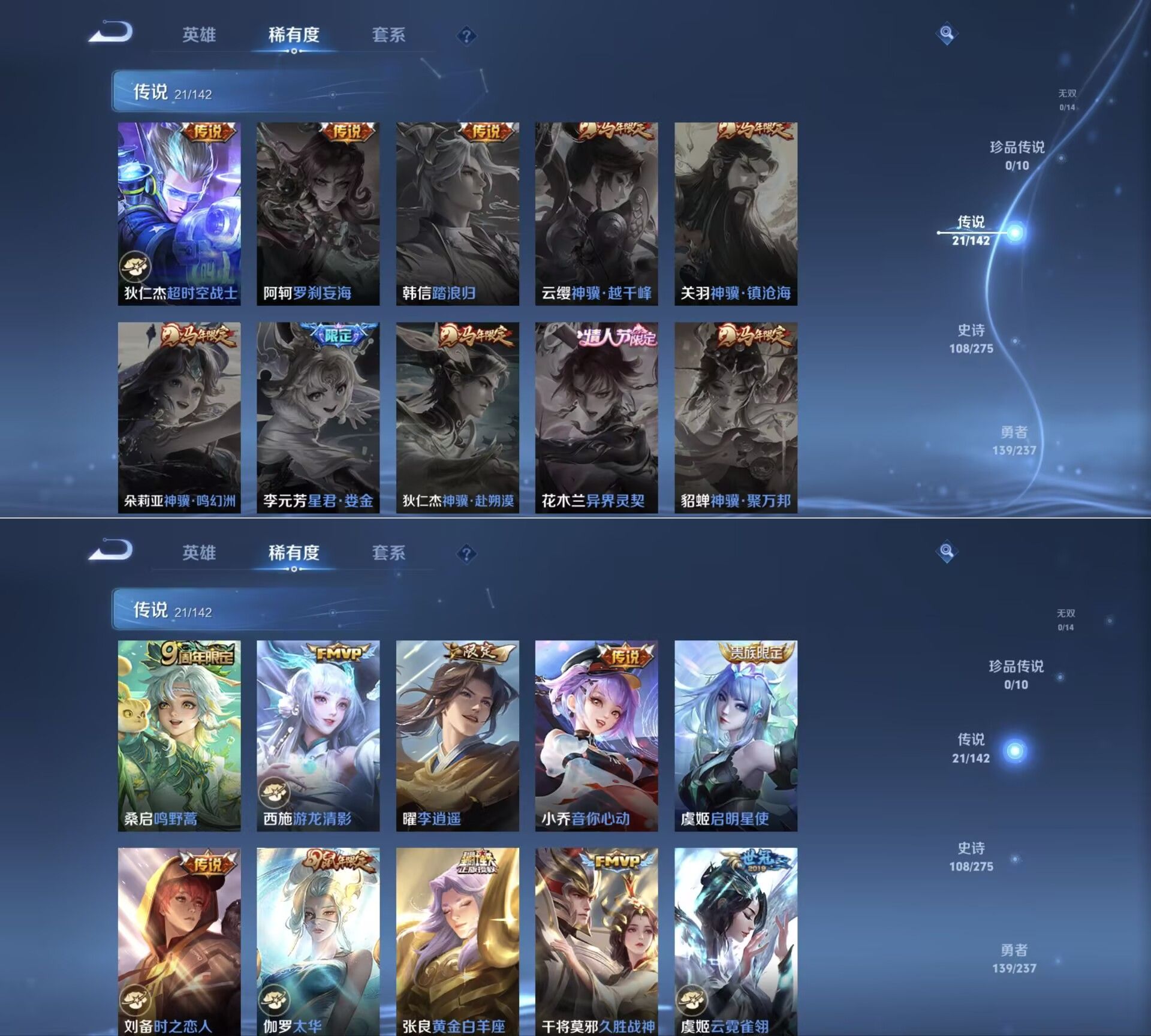 【传说皮肤】 鸣野蒿 白虎志 超时空战士 仲夏夜之梦 太华 久胜战神 黄金射手座 冠军飞将 凤求凰 时之恋人 天魔缭乱 末日机甲 地狱火 海洋之心 游龙清影 音你心动 李逍遥 云霓雀翎 启明星使 黄金白羊座 武陵仙君