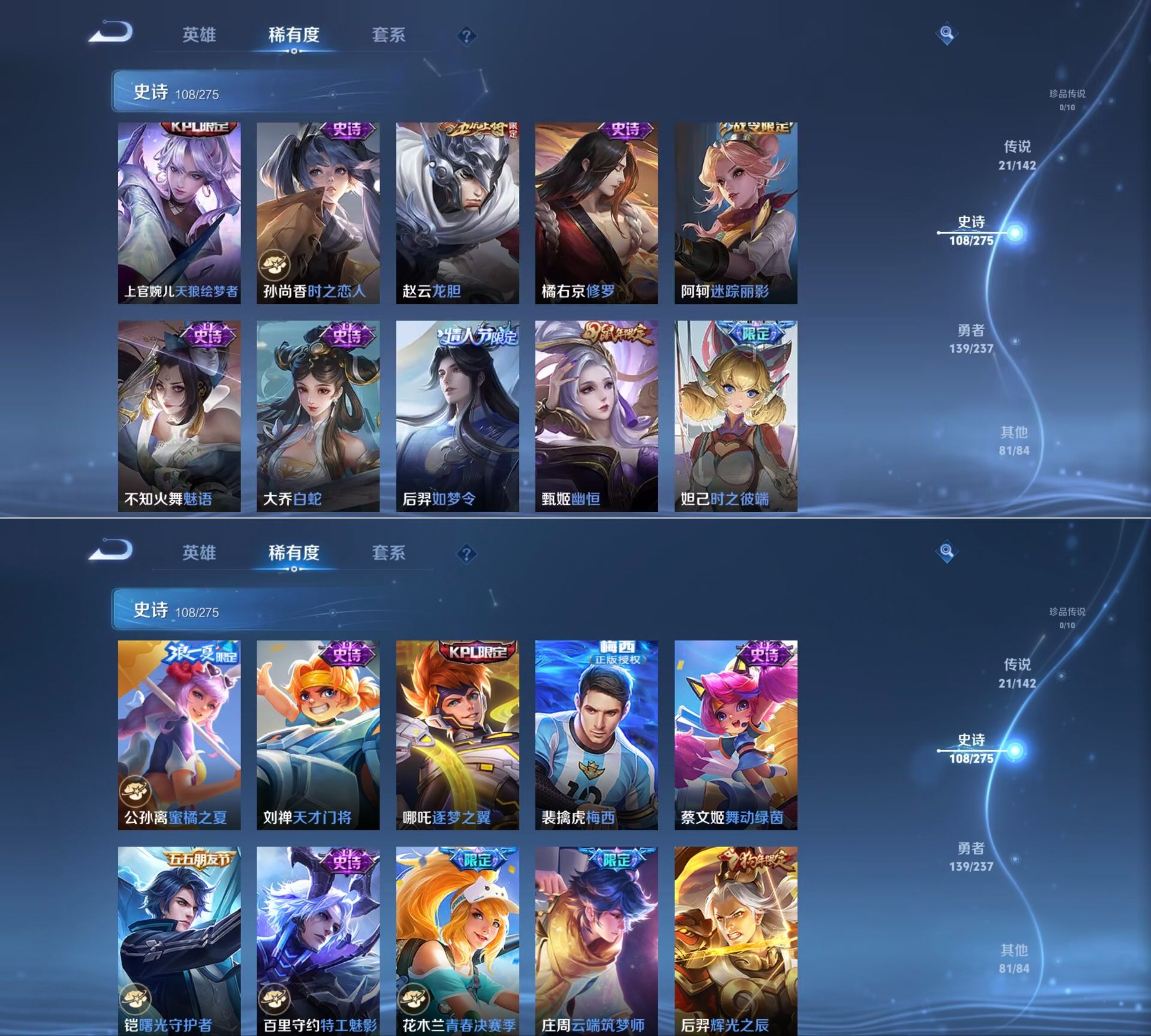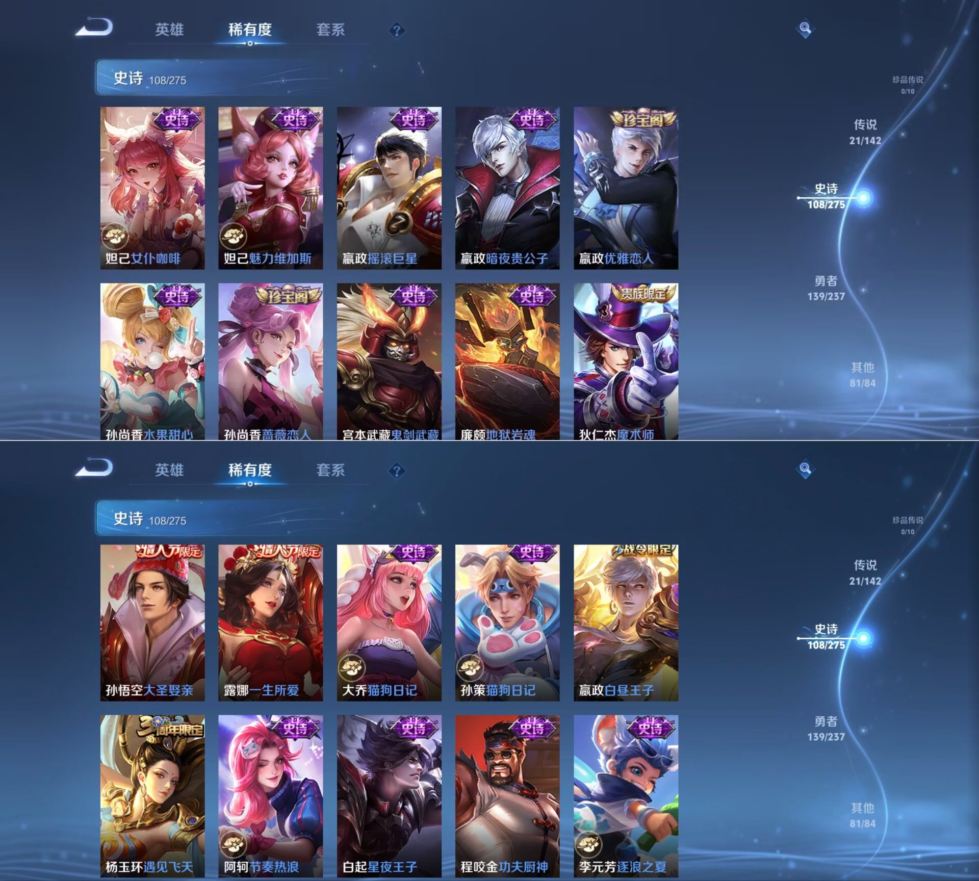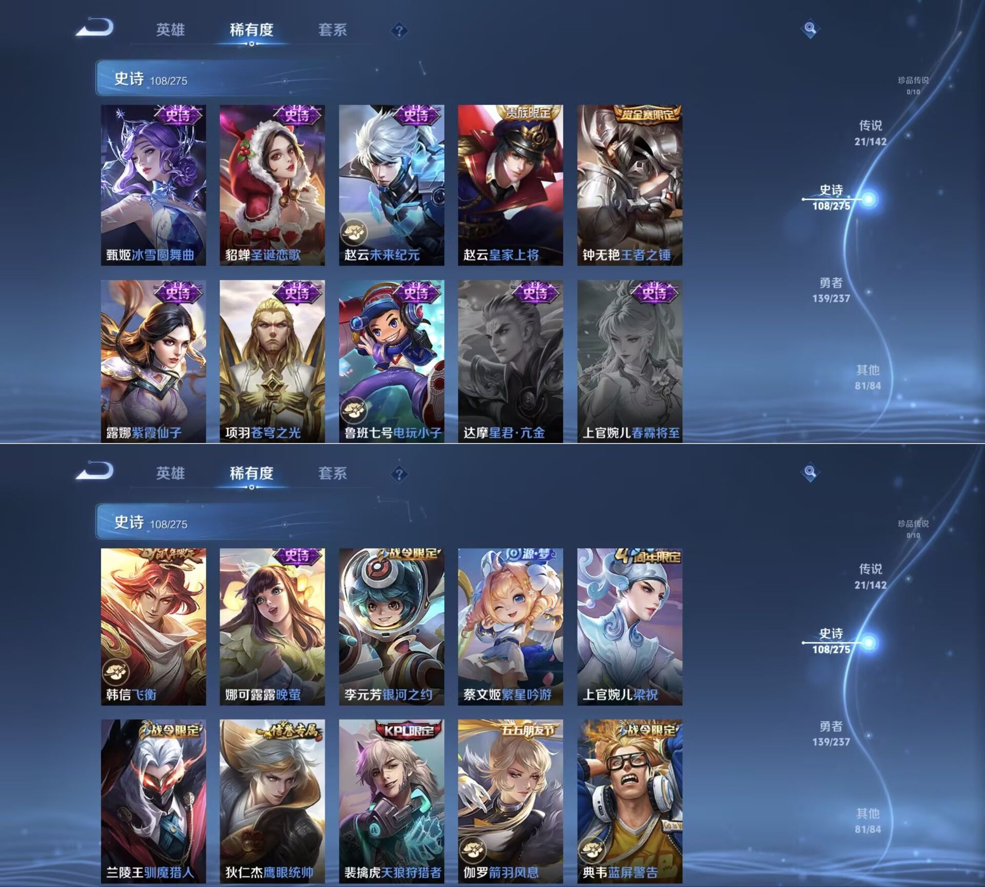 【传说皮肤】 鸣野蒿 白虎志 超时空战士 仲夏夜之梦 太华 久胜战神 黄金射手座 冠军飞将 凤求凰 时之恋人 天魔缭乱 末日机甲 地狱火 海洋之心 游龙清影 音你心动 李逍遥 云霓雀翎 启明星使 黄金白羊座 武陵仙君