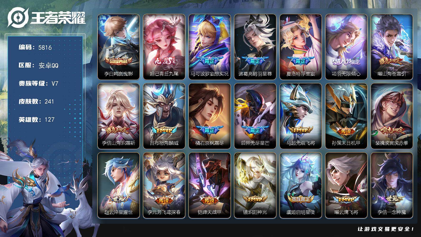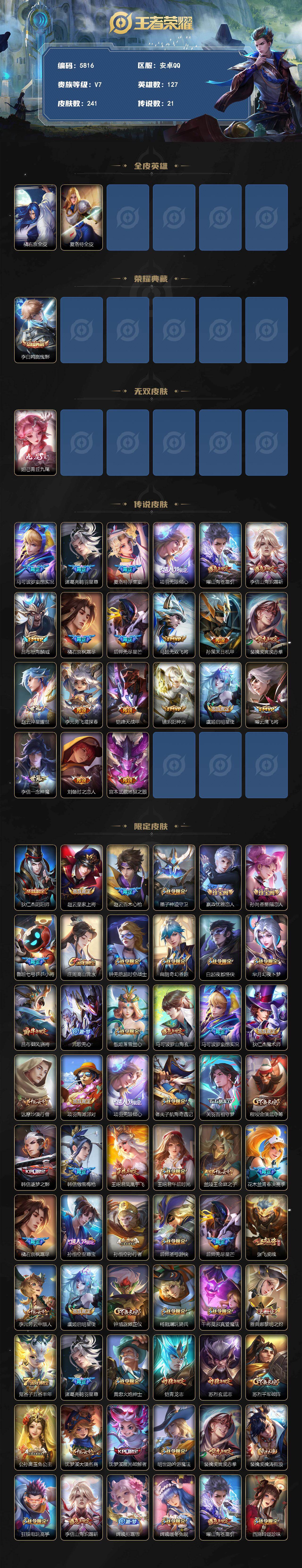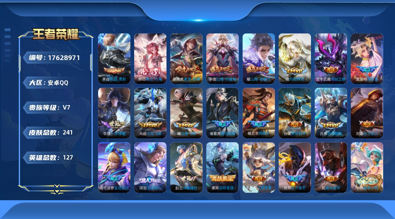 525-[17628971]贵族8-241皮-1典藏-1无双-21传说-2全皮-星传说幽冥之眼安卓手Q389区241皮1典藏21传说1无双V7 营地ID1766918128最强王者【无双皮肤】:青丘·九尾【荣耀典藏】:鸣剑·曳影【优质限定皮肤】:至尊宝,山海·苍雷引,山海·炽霜斩,无双飞将【传说皮肤】:妄想实况,鹤羽星尊,启明星使,炽阳神光,淬星耀世,绛天战甲,飞鸢探春,山海·苍雷引,浮生妄,怒海麟威,无限倾心,山海·炽霜斩,枫霜尽,无尽星芒,时之恋人,地狱之眼,无双飞将,云鹰飞将,寅虎·赤拳,