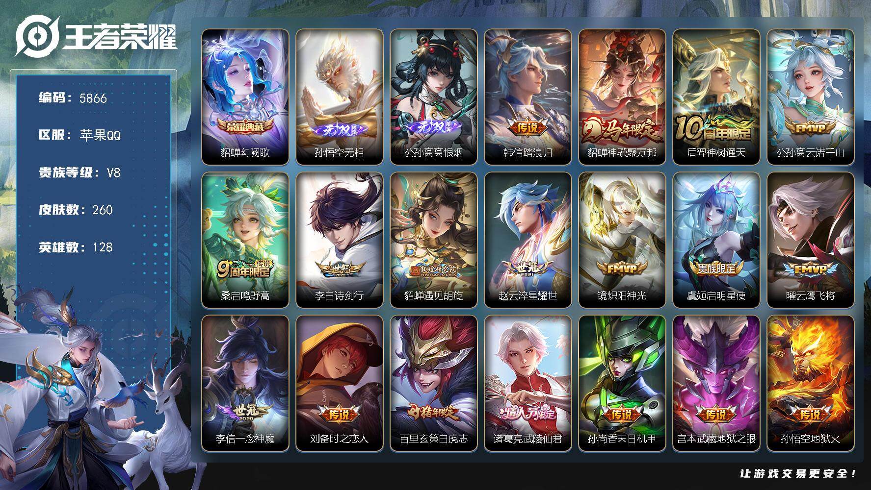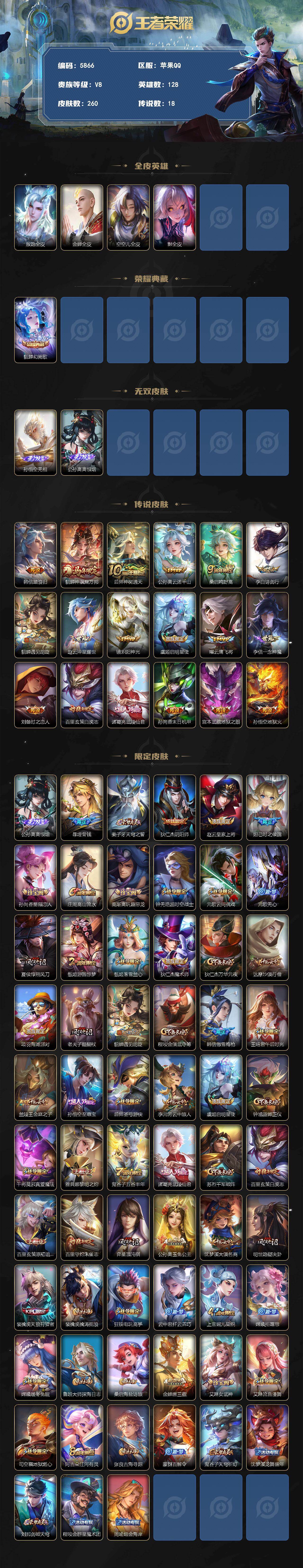 733-[17629067]花朝如约天幕贵族8-260皮-1典藏-2无双-18传说-5全皮-改名卡6-星传说破晓神光-幽冥火-幽冥之眼-未来机甲-金色仲夏夜苹果手Q122区260皮1典藏18传说2无双V8 营地ID1743690227无双王者【无双皮肤】:离恨烟,无相【荣耀典藏】:幻阙歌【优质限定皮肤】:白虎志,至尊宝【传说皮肤】:白虎志,启明星使,踏浪归,神骥·聚万邦,地狱之眼,神树通天,云诺千山,末日机甲,鸣野蒿,淬星耀世,云鹰飞将,一念神魔,炽阳神光,时之恋人,诗剑行,地狱火,武陵仙君,遇