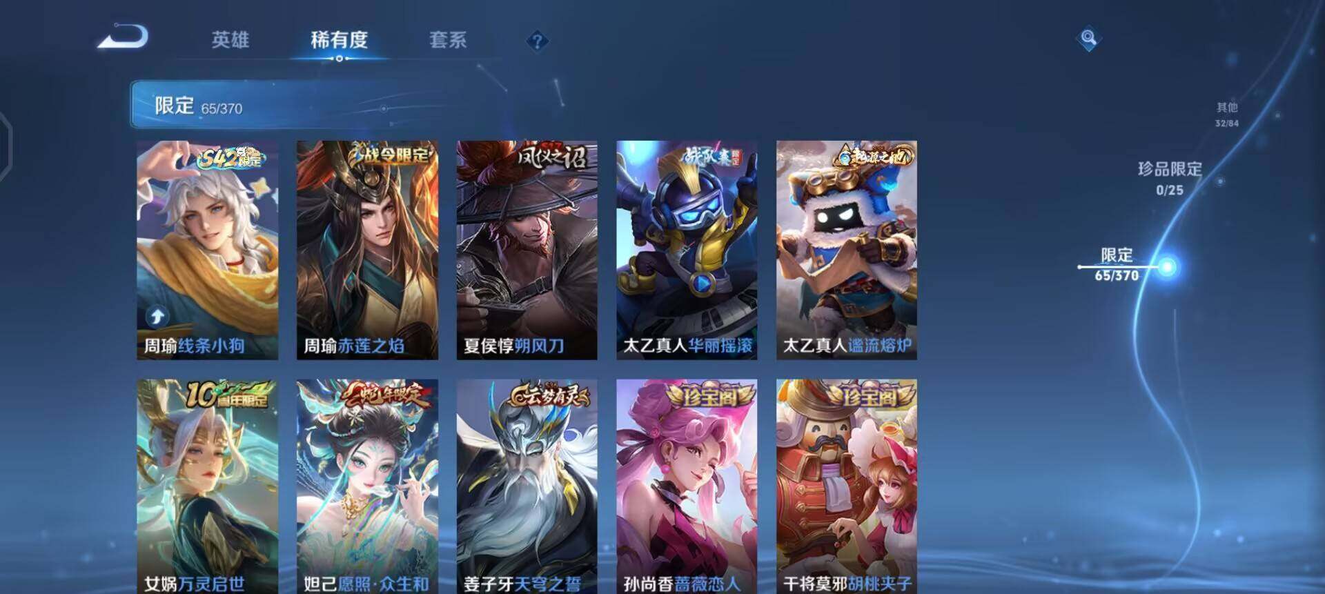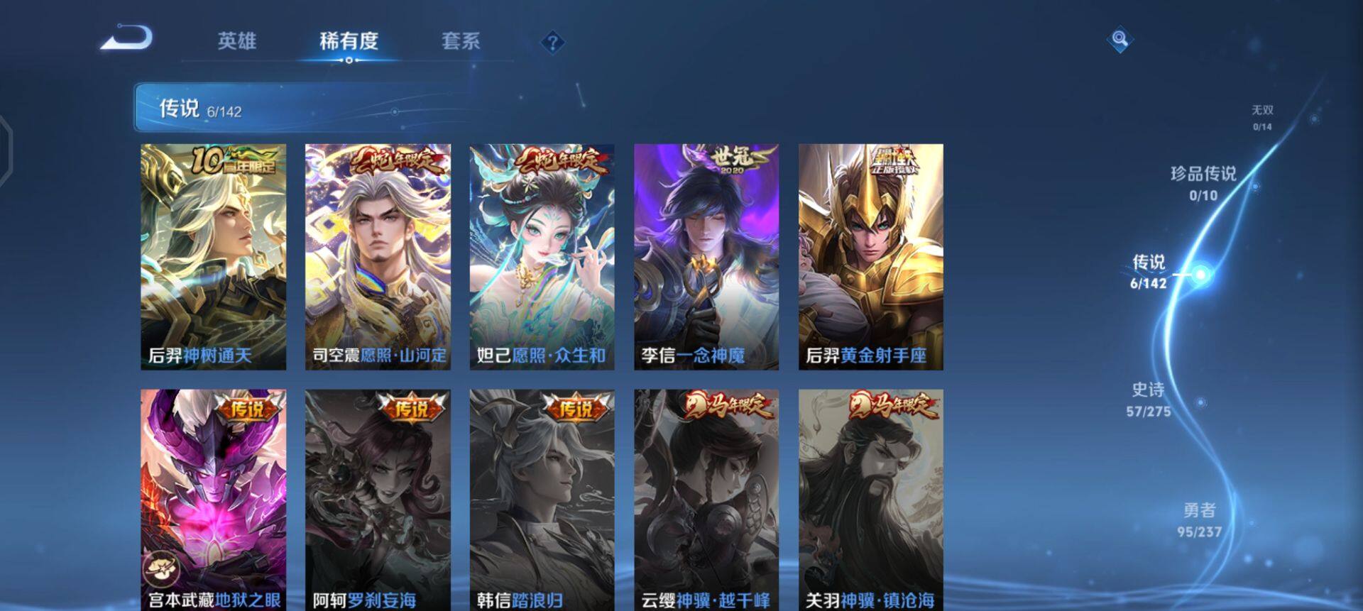 【传说皮肤】:后羿神树通天,司空震愿照山河定,妲己愿照众生和,李信一念神魔,后羿黄金射手座,宫本武藏地狱之眼