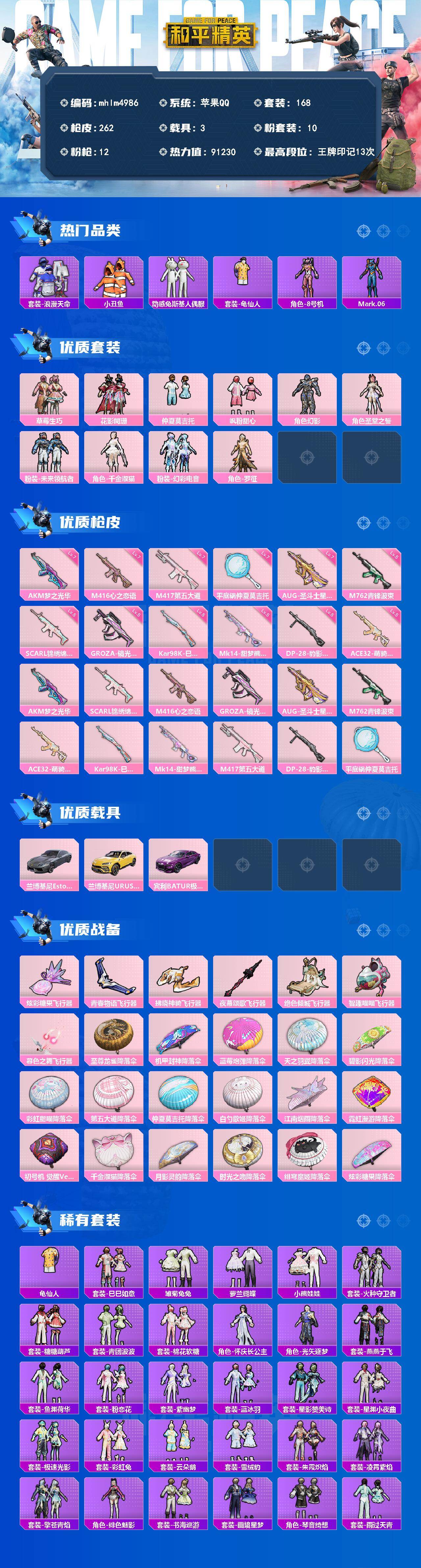 【mhlm4986】苹果 手Q-10粉装-12特效枪-3载具-7粉色飞行器-91230热力值-13王牌印记-168套装-262枪皮