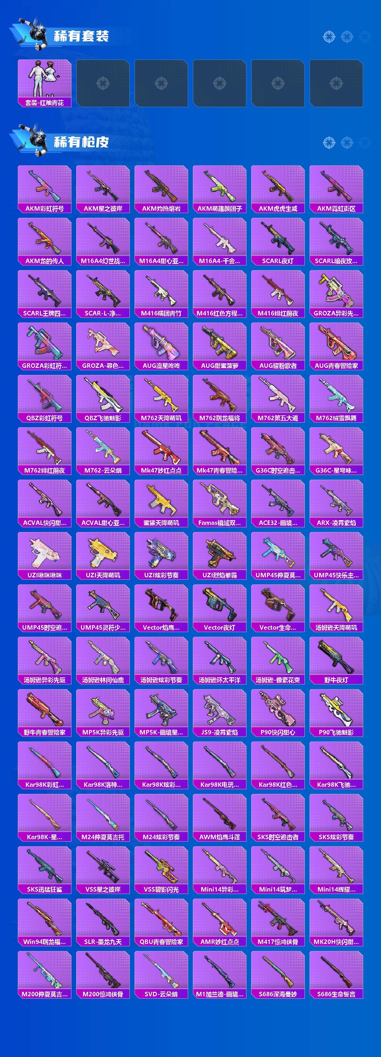 【粉色套装】:粉装-草莓生巧,粉装-花影阑珊,粉装-仲夏莫吉托,粉装-飒粉甜心,角色-幻影,角色-圣堂之誓,粉装-未来领航者,角色-千金淑猫,粉装-