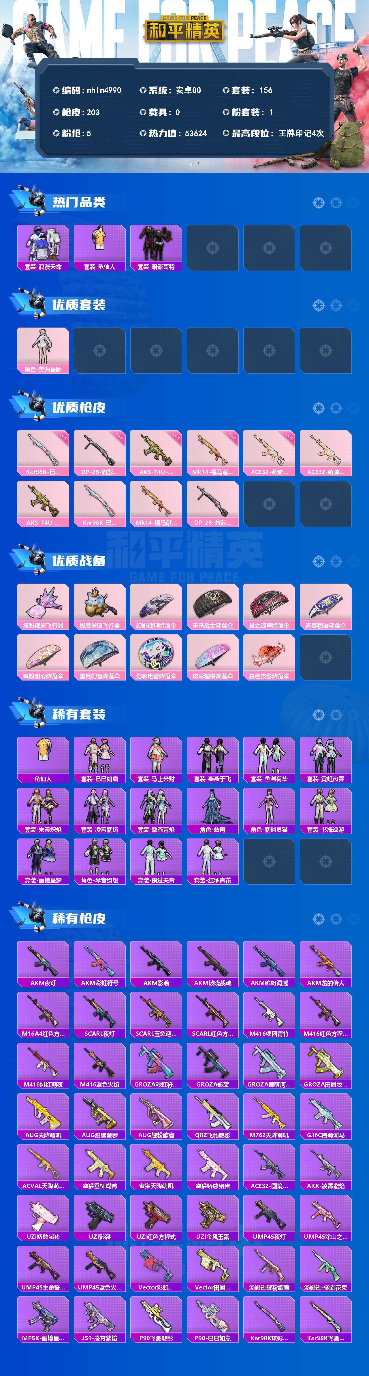 【mhlm4990】安卓 手Q-1粉装-5特效枪-0载具-2粉色飞行器-53624热力值-4王牌印记-156套装-203枪皮