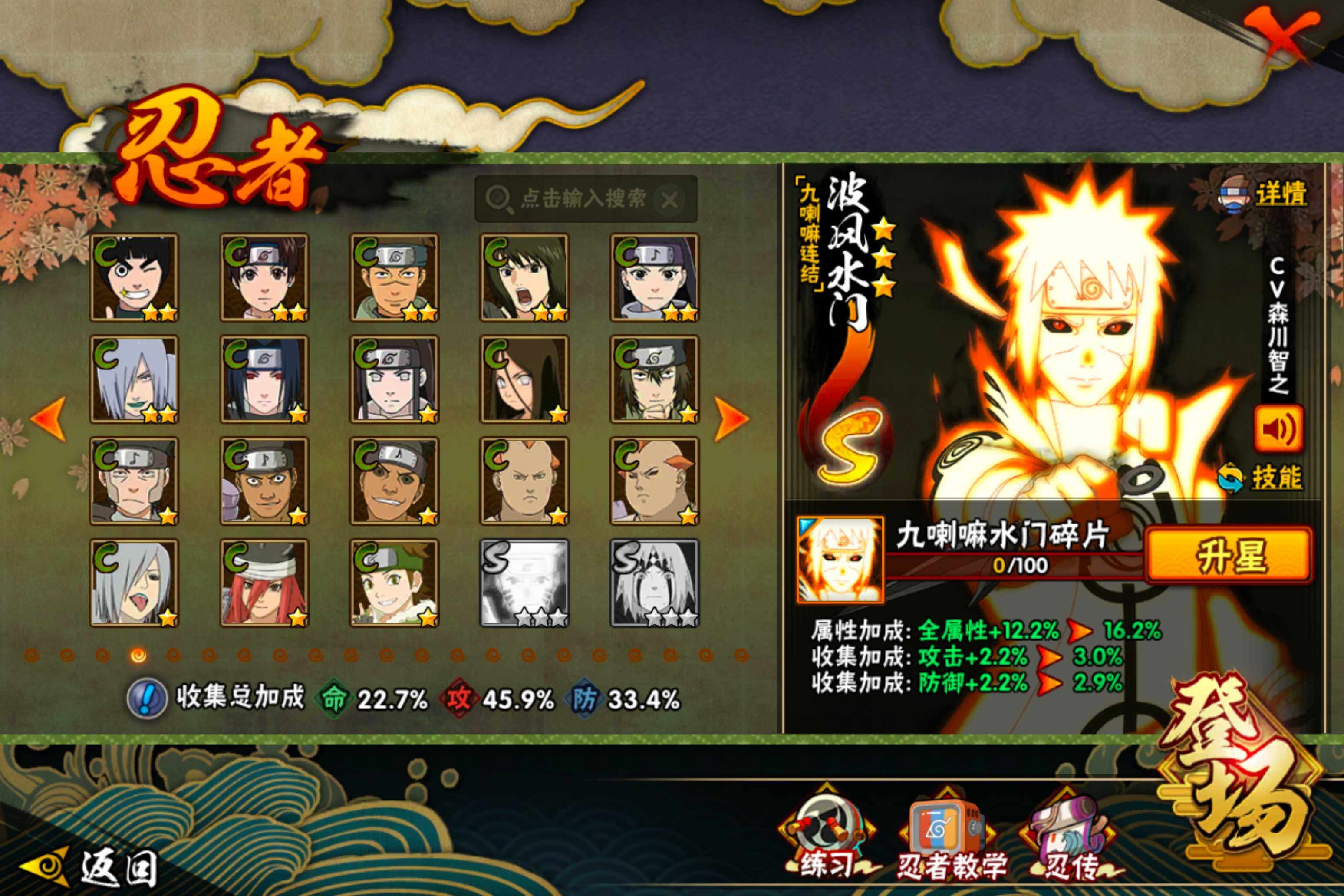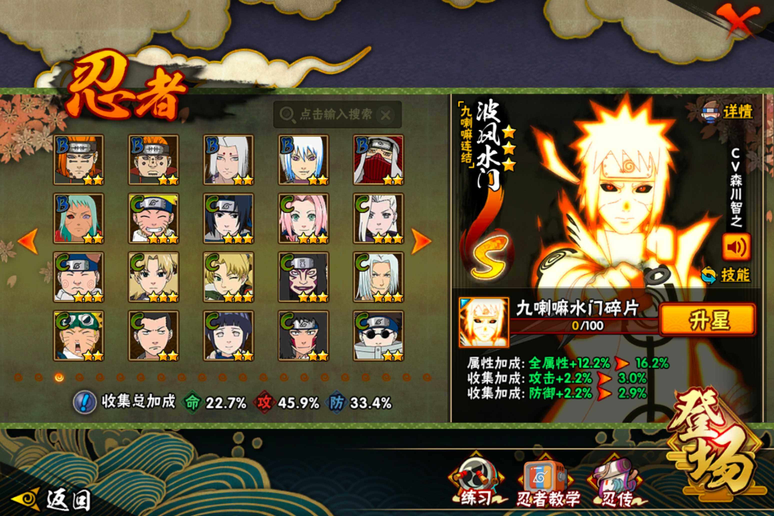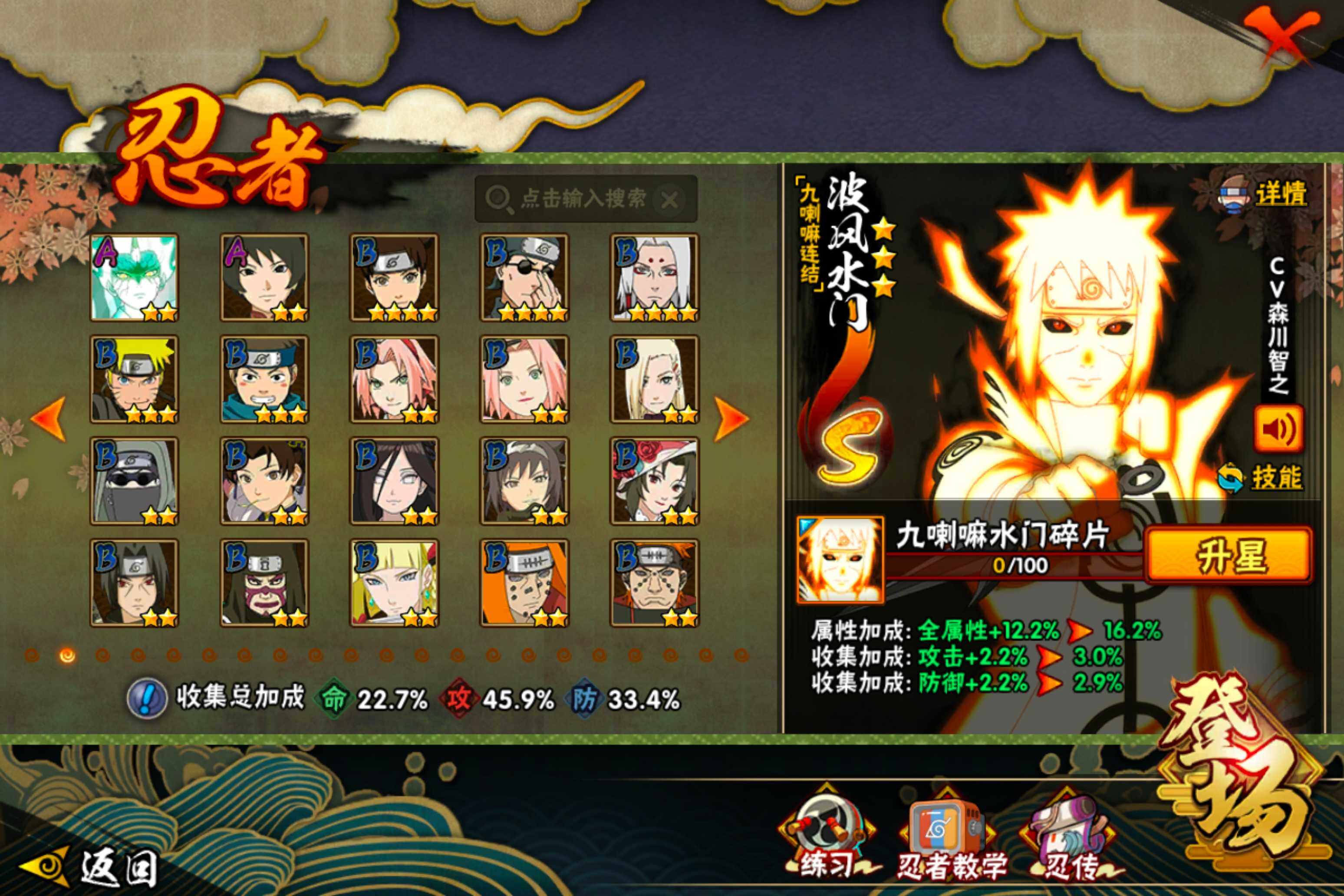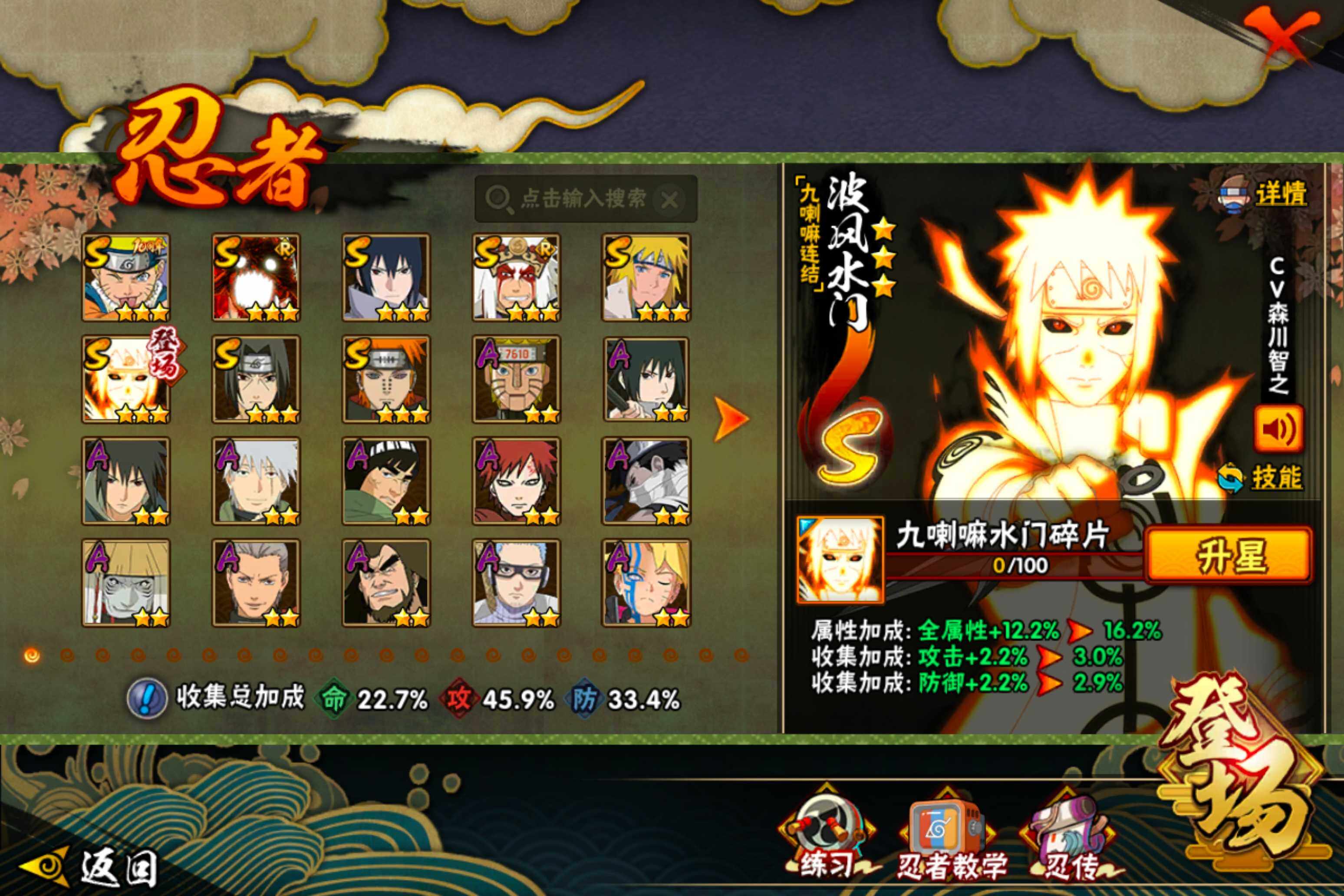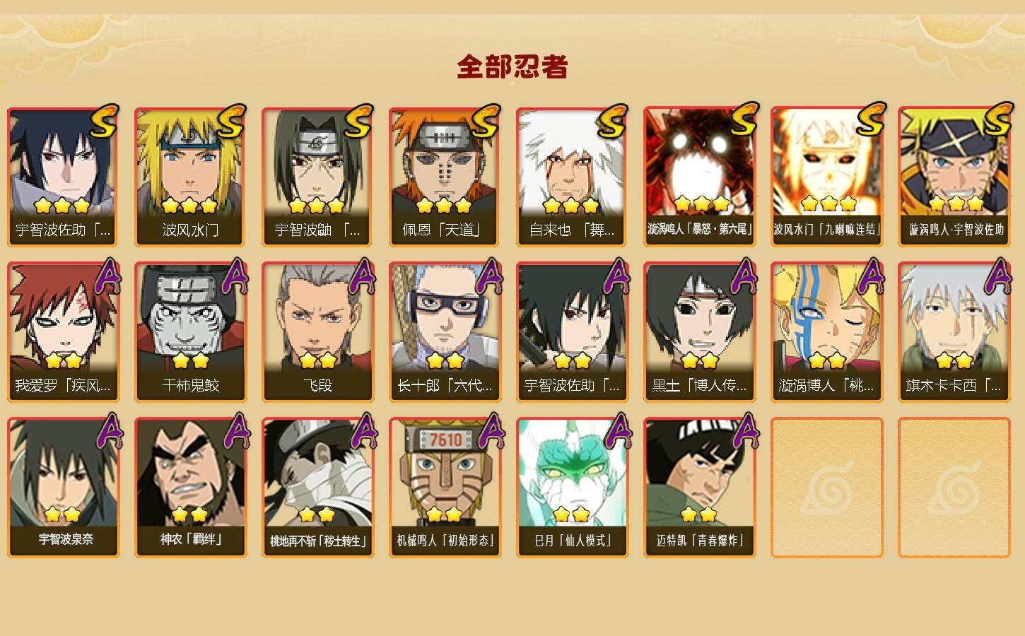 【S级忍者】:宇智波鼬「须佐能乎」(3星),自来也「舞之豪杰」(3星),波风水门(3星),佩恩「天道」(3星),宇智波佐助「永恒万花筒」(3星),漩涡鸣人「暴怒·第六尾」(3星),波风水门「九喇嘛连结」(3星),漩涡鸣人·宇智波佐助(3星)