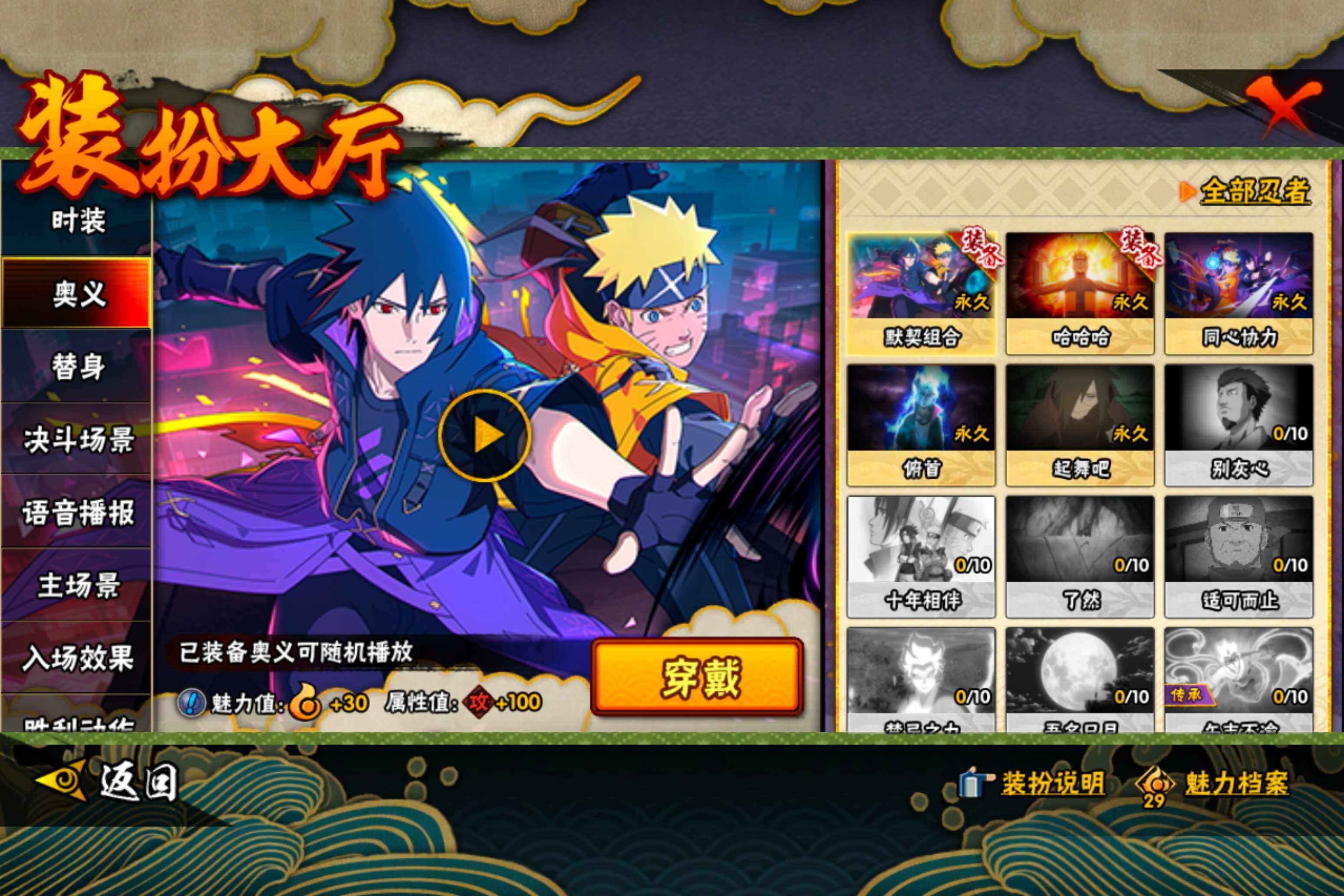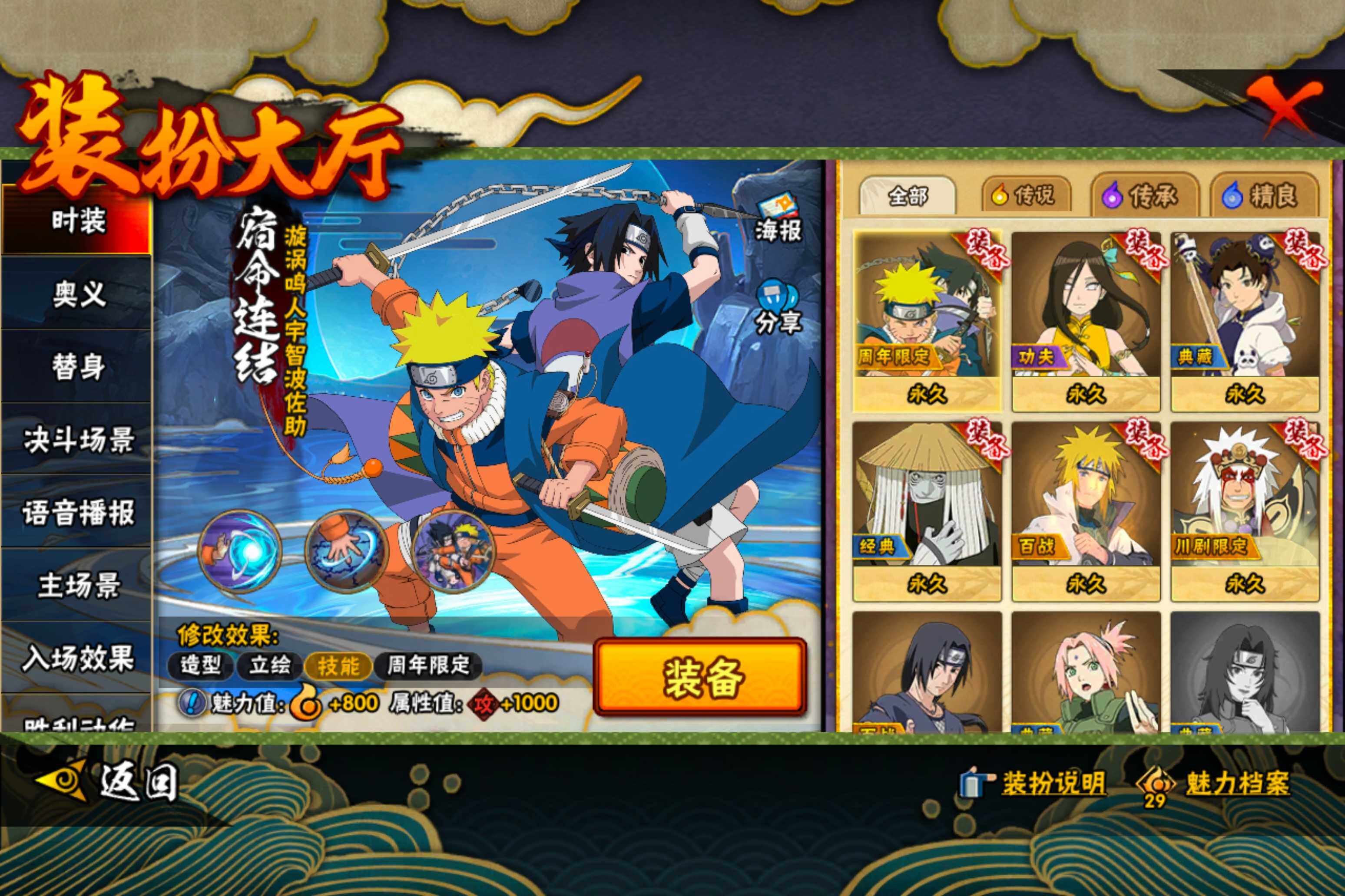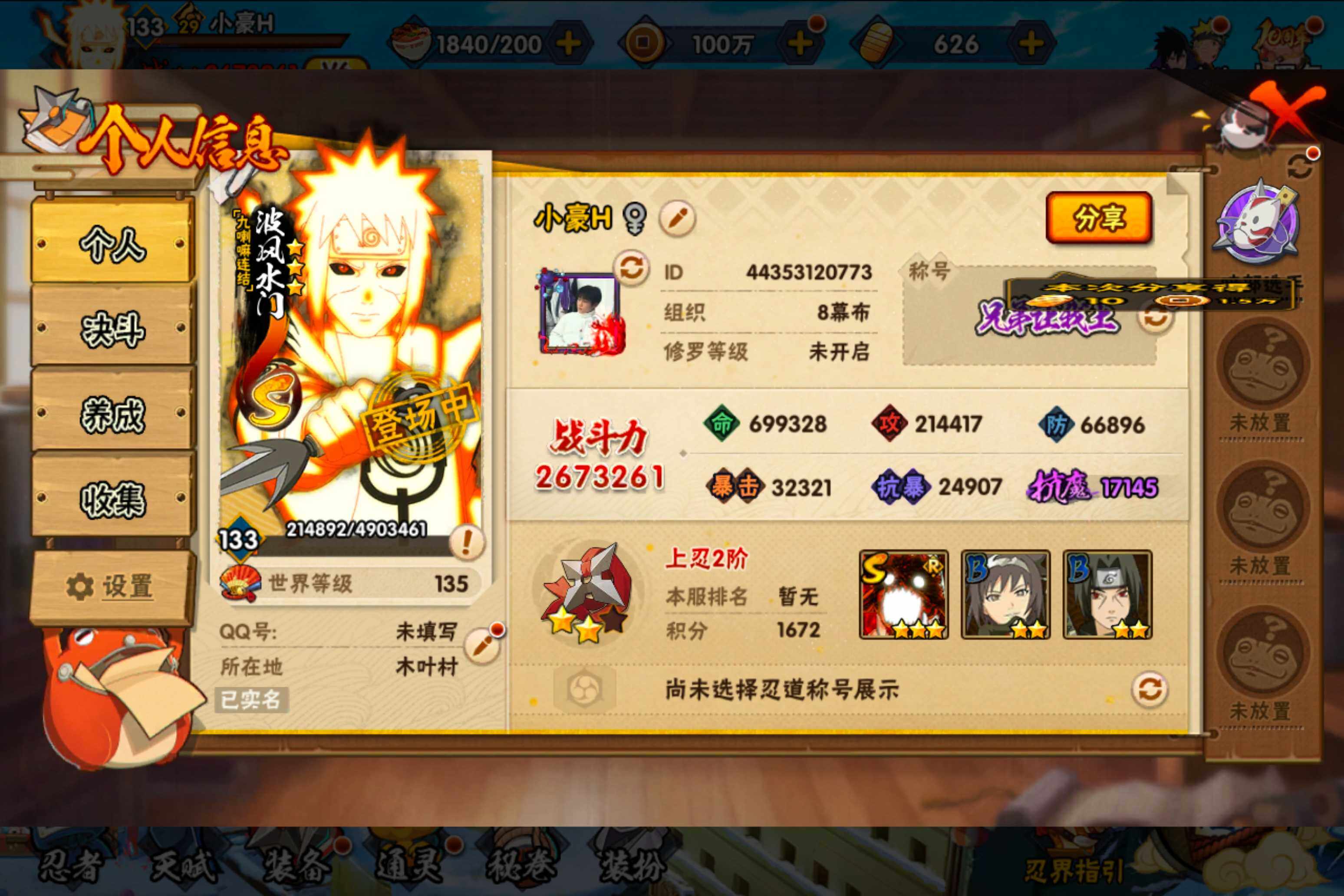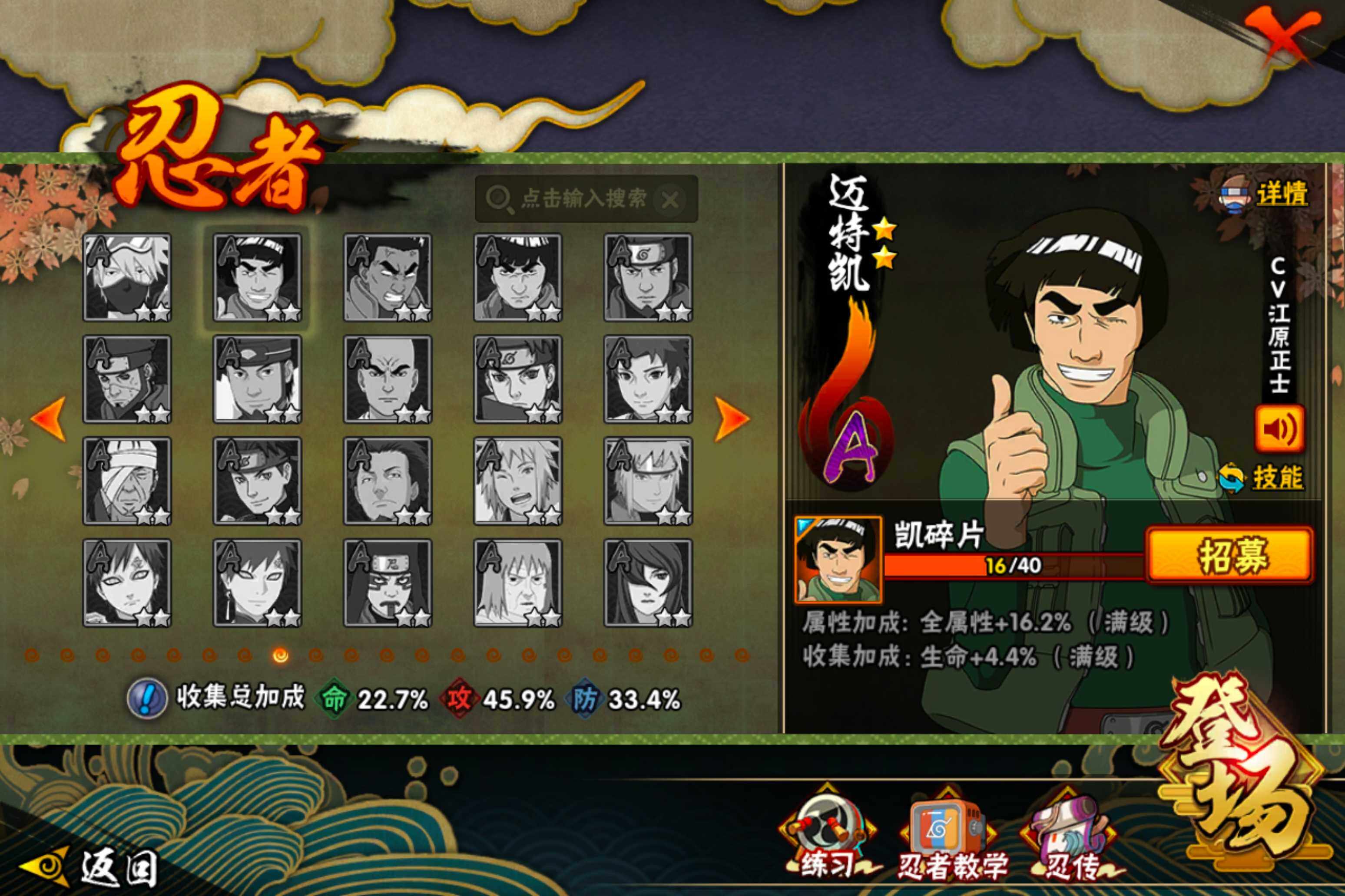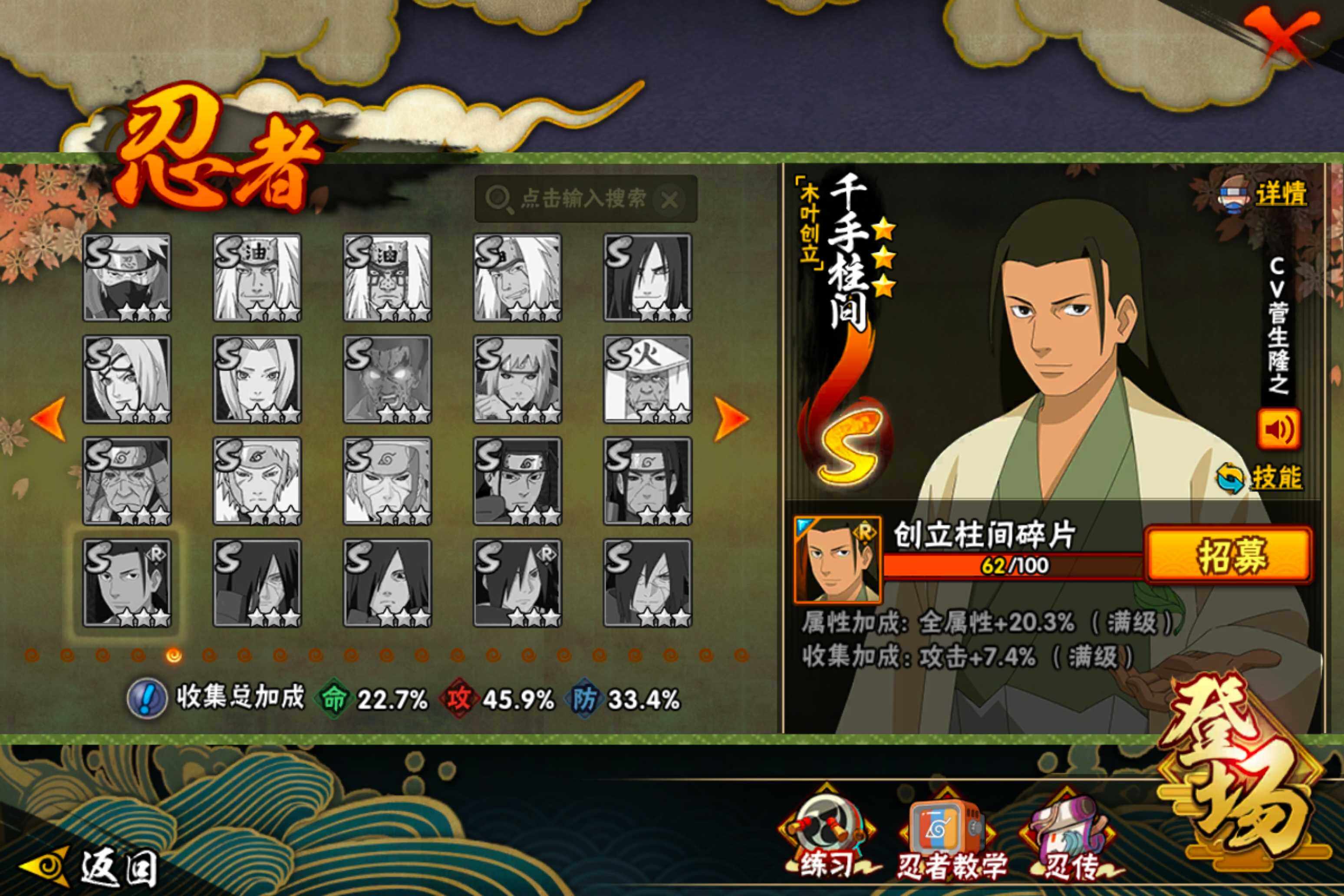 【S级忍者】:宇智波鼬「须佐能乎」(3星),自来也「舞之豪杰」(3星),波风水门(3星),佩恩「天道」(3星),宇智波佐助「永恒万花筒」(3星),漩涡鸣人「暴怒·第六尾」(3星),波风水门「九喇嘛连结」(3星),漩涡鸣人·宇智波佐助(3星)