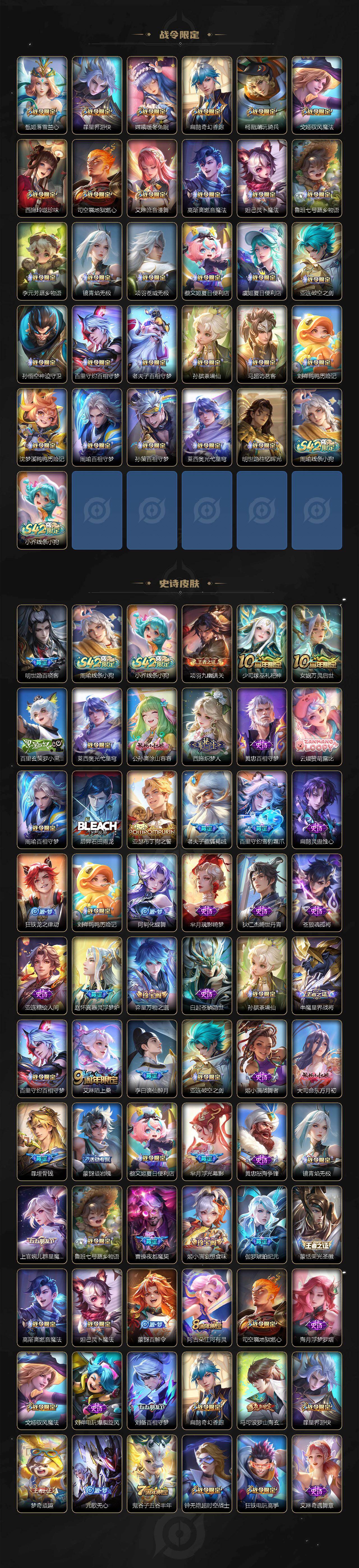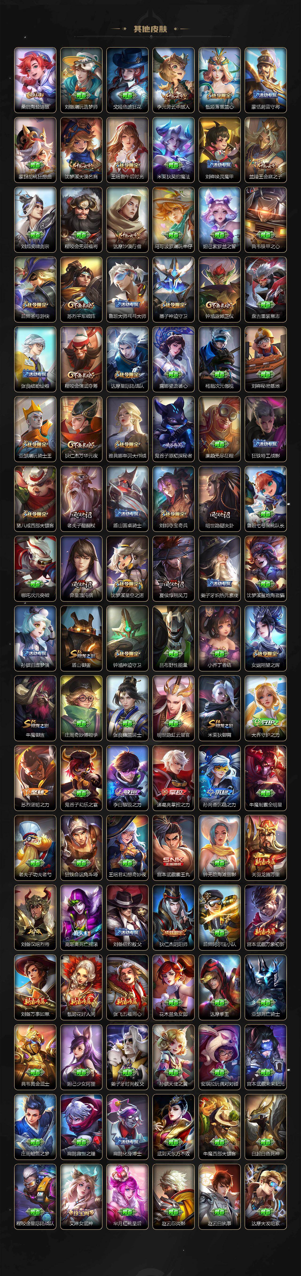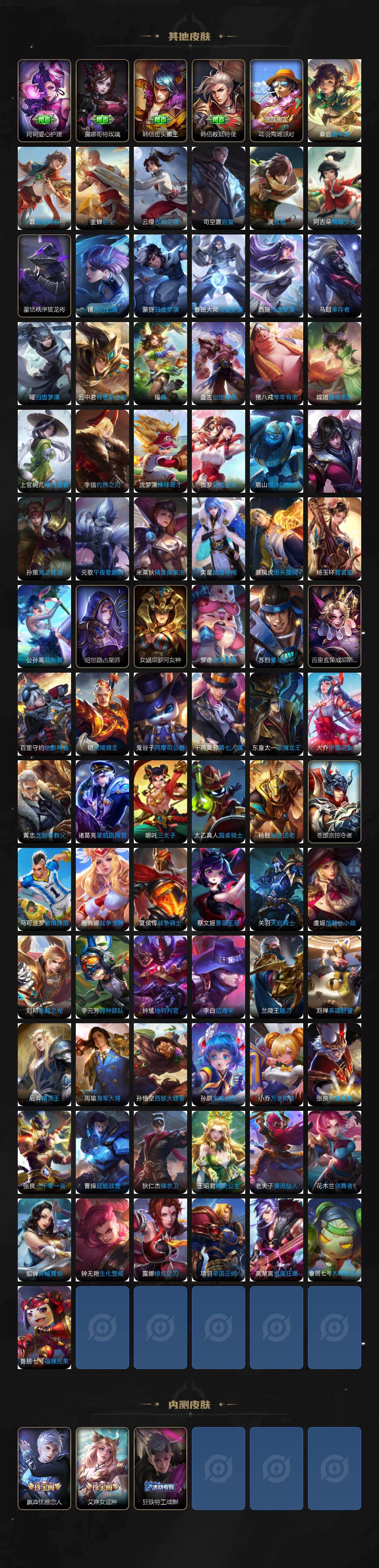 【英雄全皮】:刘禅全皮,元歌全皮,宫本武藏全皮,李白全皮,老夫子全皮,刘邦全皮,孙权全皮,艾琳全皮,刘备全皮,苍全皮,鬼谷子全皮,敖隐全皮,蒙恬全皮,司空震全皮,戈娅全皮,空空儿全皮,影全皮