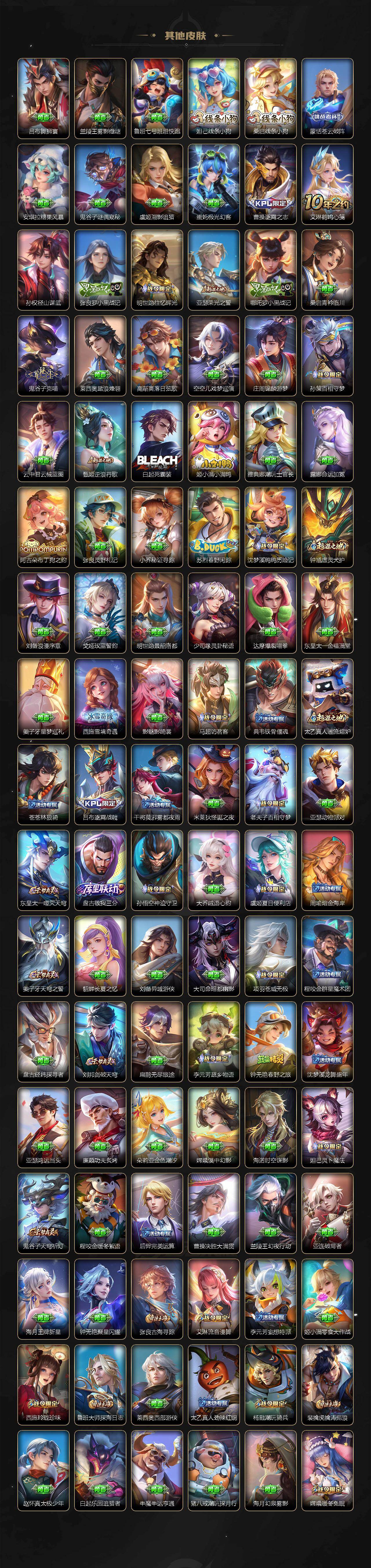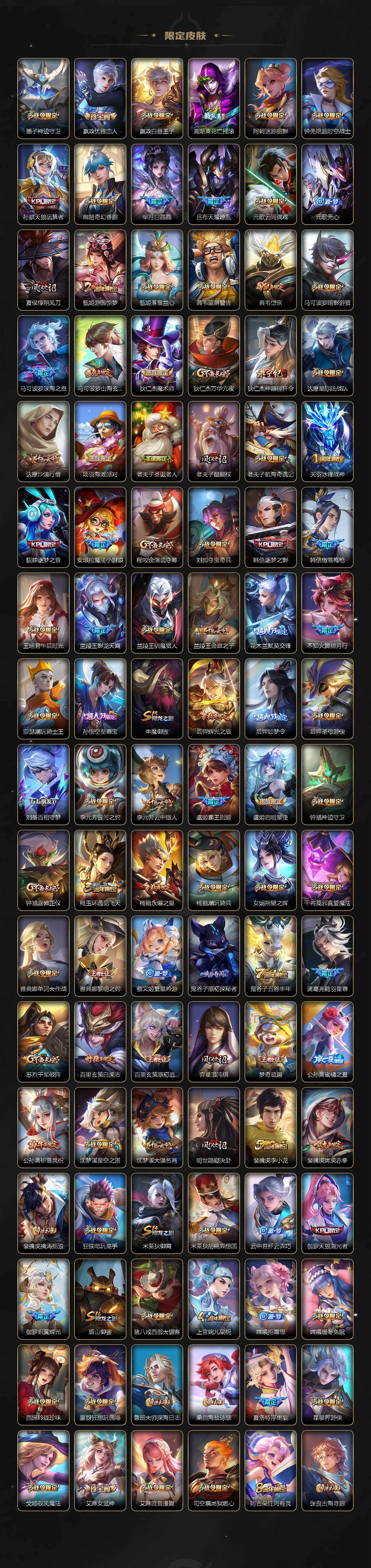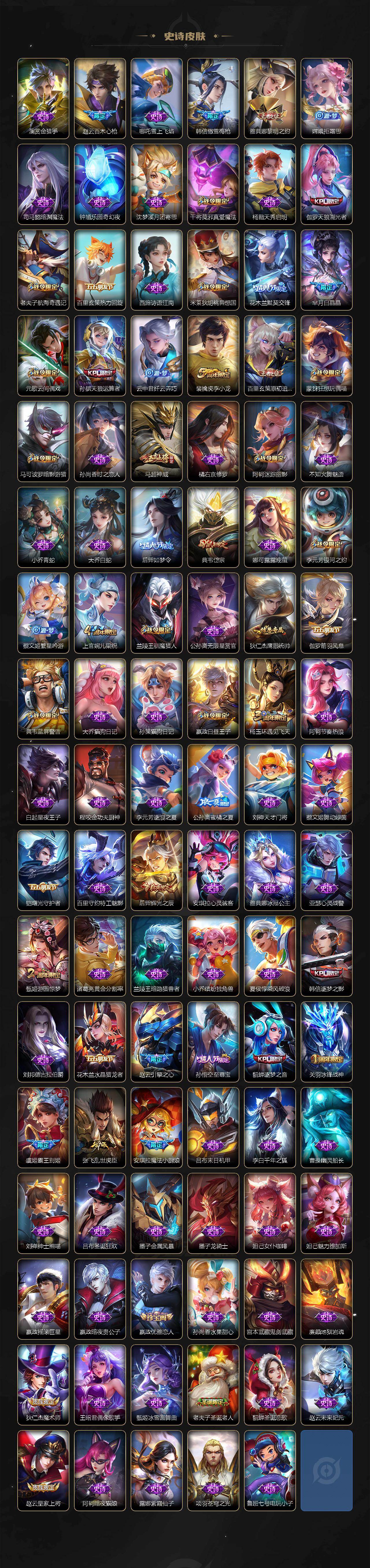 【英雄全皮】:刘禅全皮,元歌全皮,宫本武藏全皮,李白全皮,老夫子全皮,刘邦全皮,孙权全皮,艾琳全皮,刘备全皮,苍全皮,鬼谷子全皮,敖隐全皮,蒙恬全皮,司空震全皮,戈娅全皮,空空儿全皮,影全皮