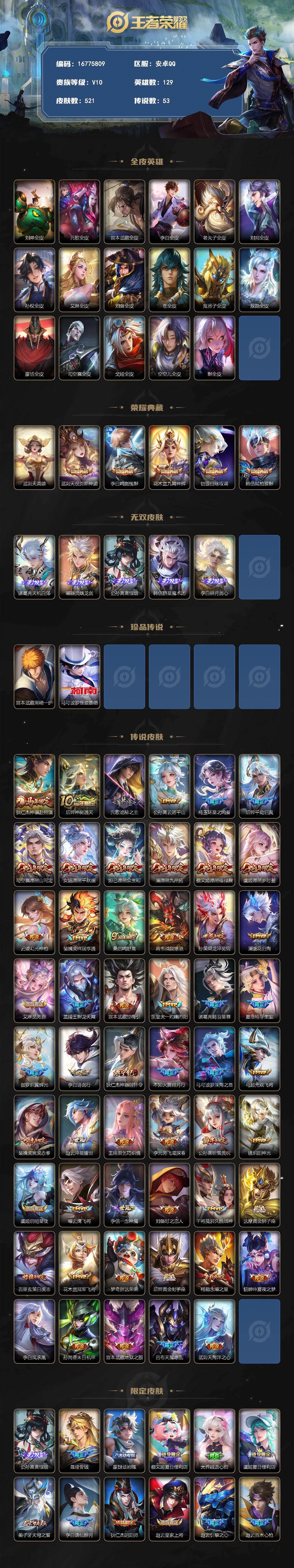 安卓Q-V10-最强王者段位-129英雄-521皮肤-5典藏皮肤-1典藏英雄-5无双-2珍品传说-53传说-165史诗
