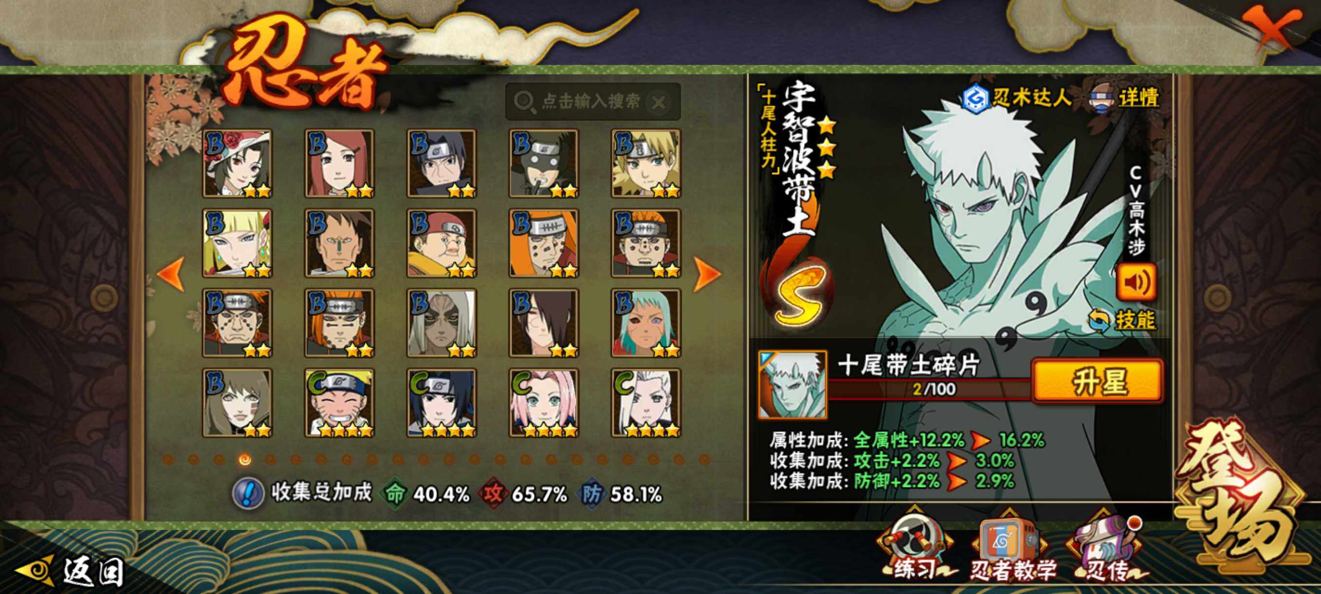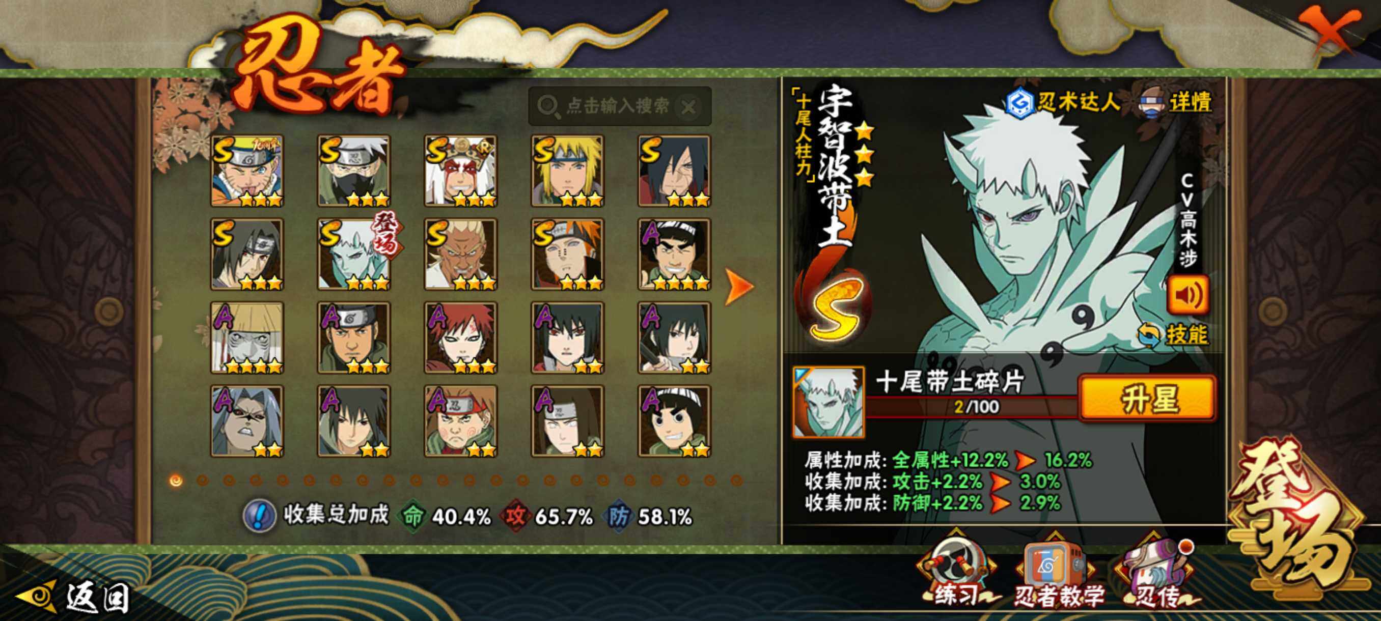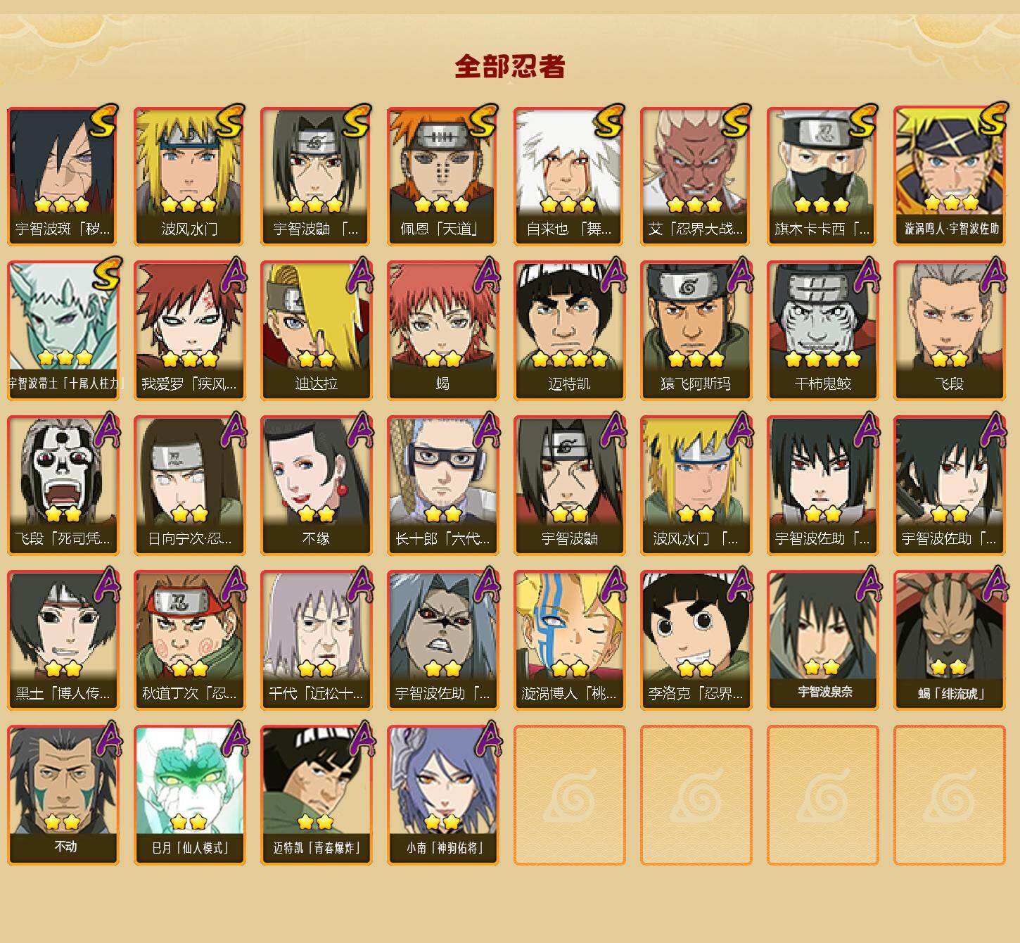 【S级忍者】:宇智波斑「秽土转生·解」(3星),艾「忍界大战」(3星),宇智波鼬「须佐能乎」(3星),旗木卡卡西「须佐能乎」(3星),自来也「舞之豪杰」(3星),波风水门(3星),佩恩「天道」(3星),漩涡鸣人·宇智波佐助(3星),宇智波带土「十尾人柱力」(3星)
