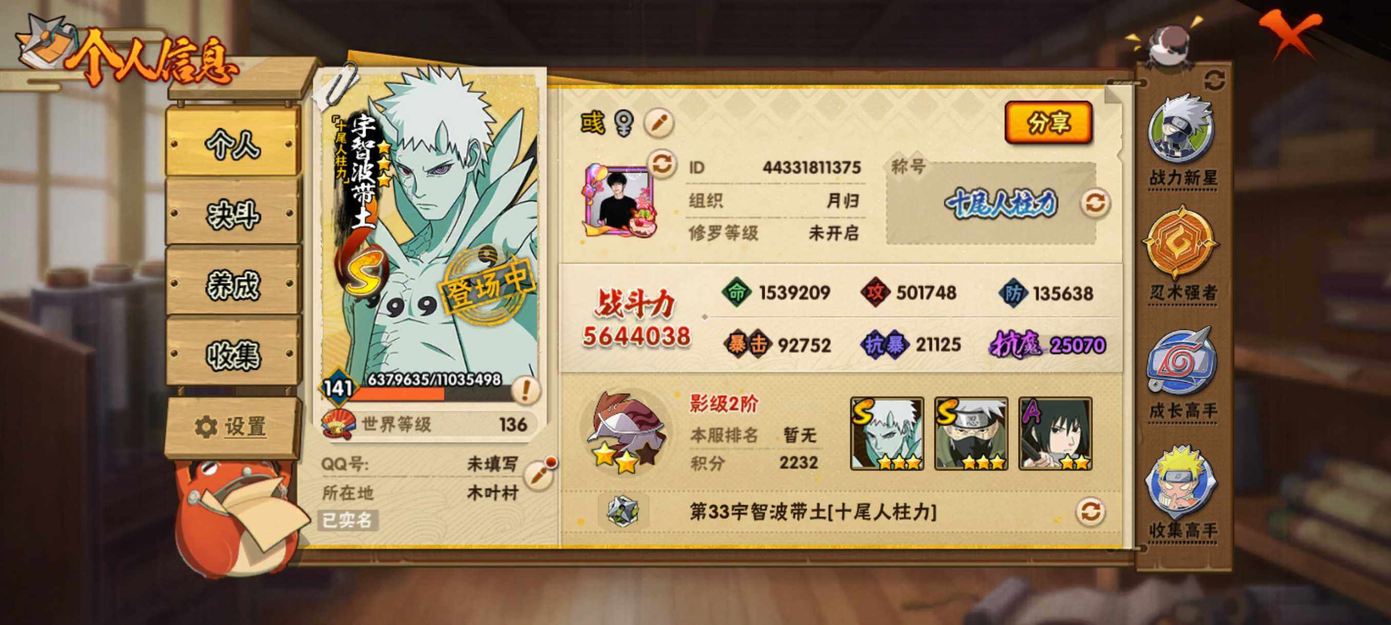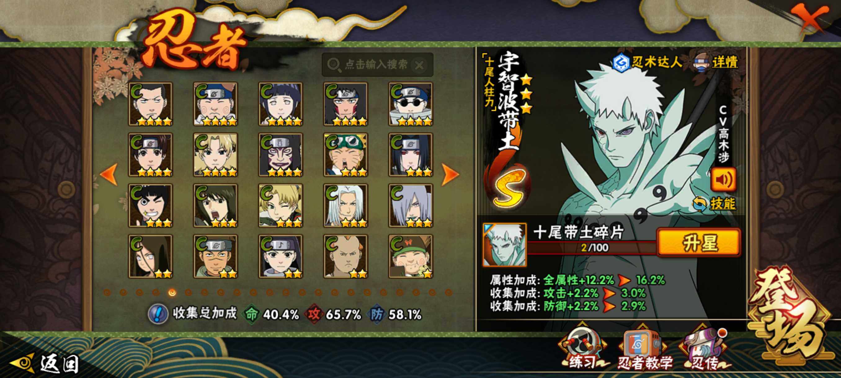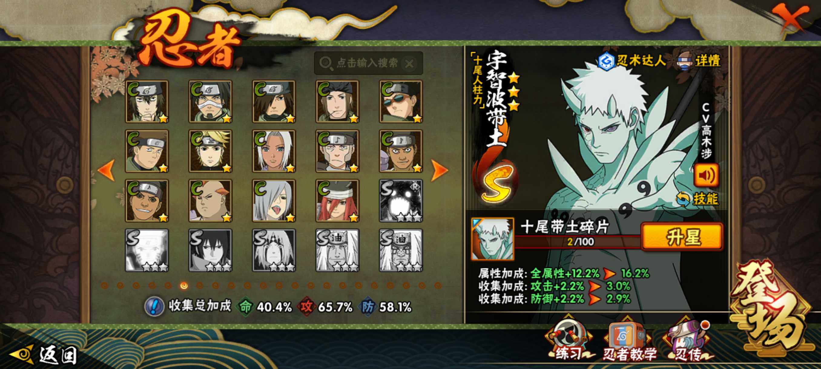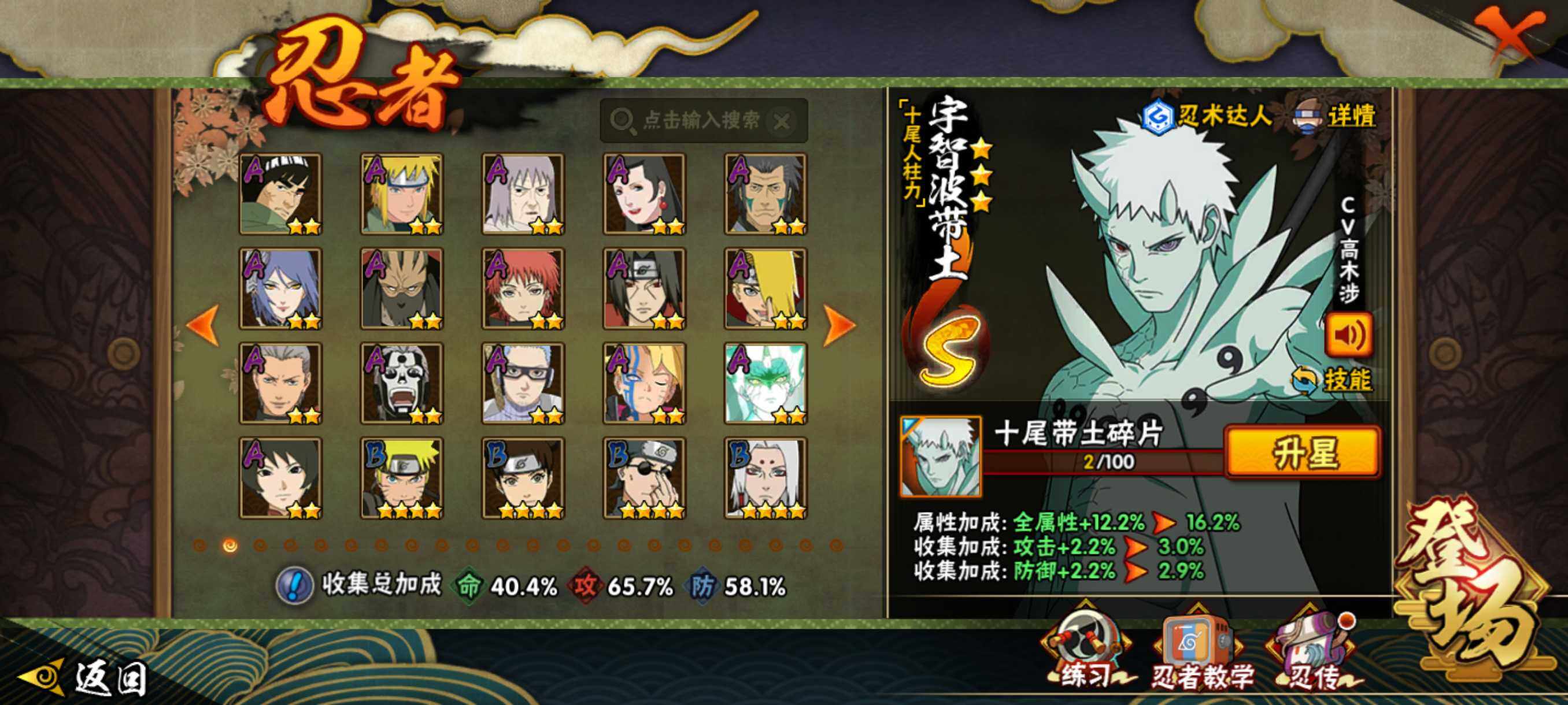 【S级忍者】:宇智波斑「秽土转生·解」(3星),艾「忍界大战」(3星),宇智波鼬「须佐能乎」(3星),旗木卡卡西「须佐能乎」(3星),自来也「舞之豪杰」(3星),波风水门(3星),佩恩「天道」(3星),漩涡鸣人·宇智波佐助(3星),宇智波带土「十尾人柱力」(3星)