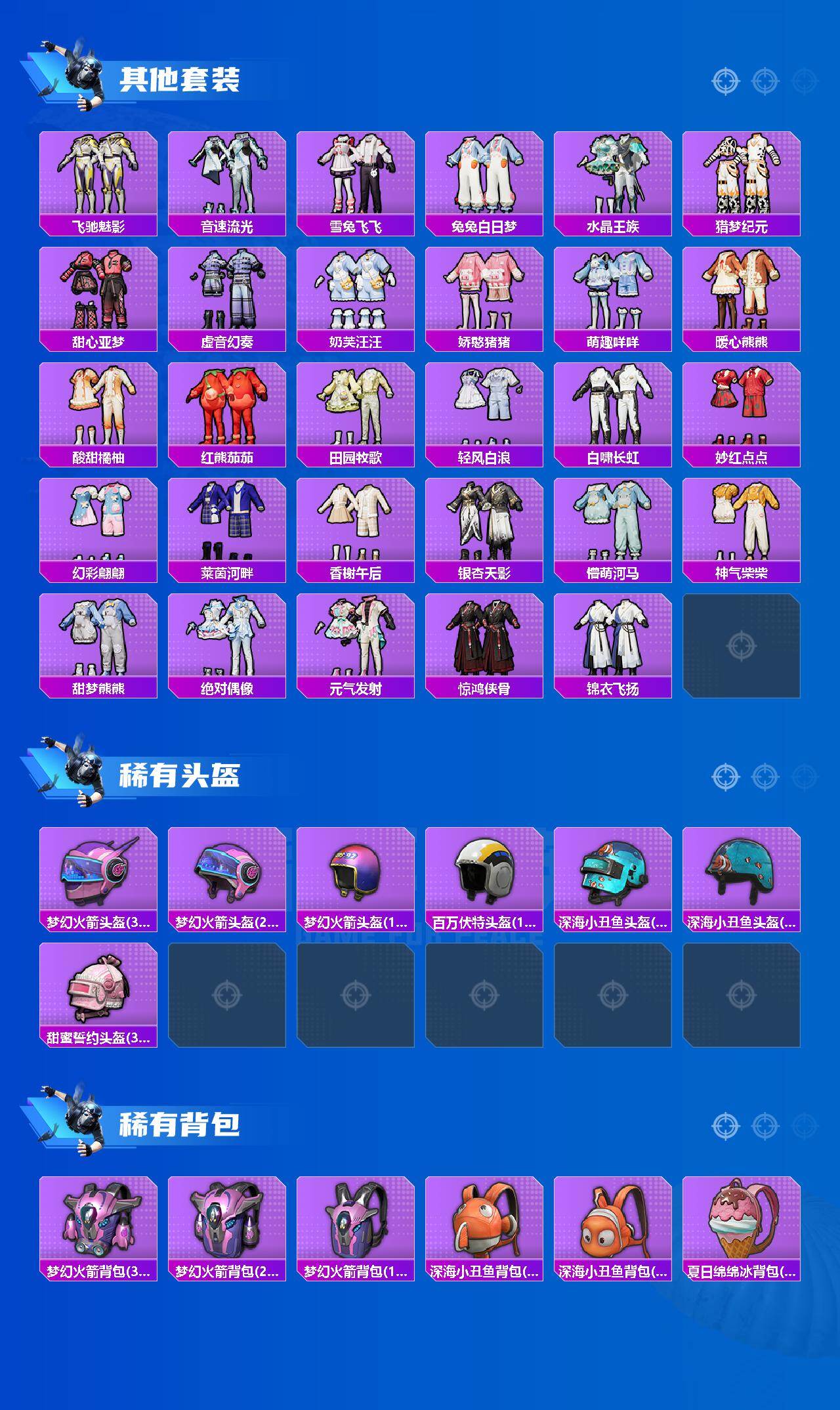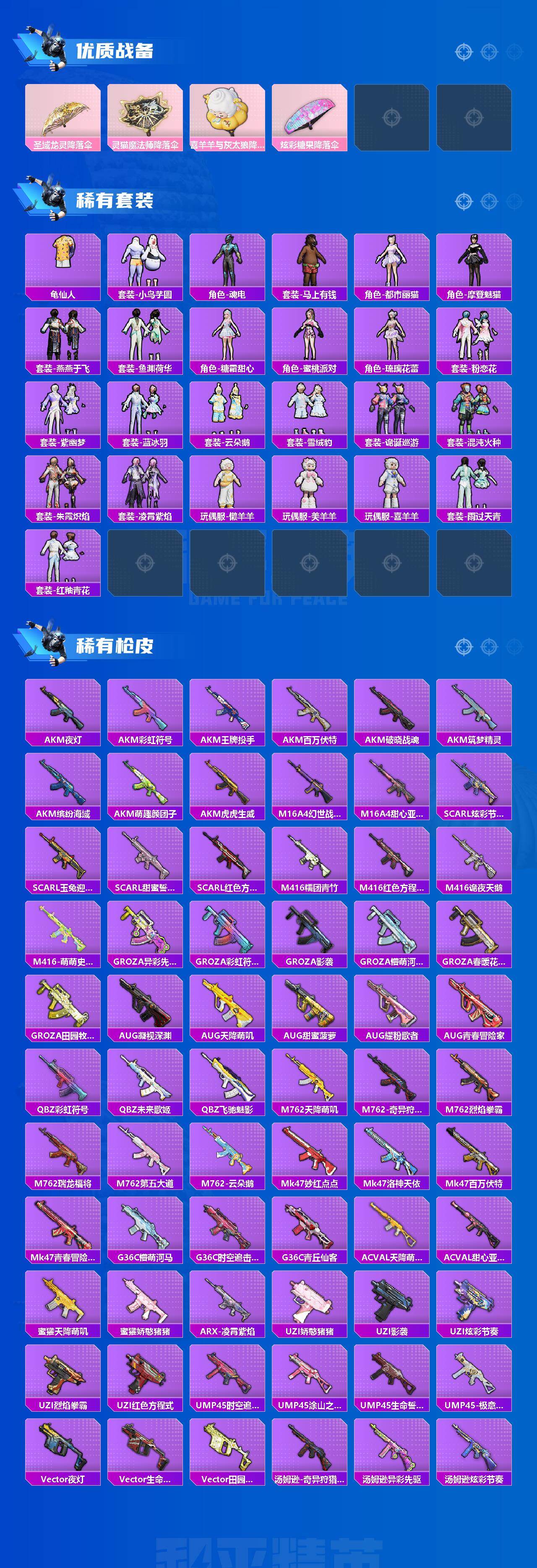 【稀有套装】:套装-龟仙人,套装-小鸟芋圆,角色-魂电,套装-马上有钱,角色-都市丽猫,角色-摩登魅猫,套装-燕燕于飞,套装-鱼渊荷华,角色-糖霜甜心,角色-蜜桃派对,角色-琉璃花蕾,套装-粉恋花