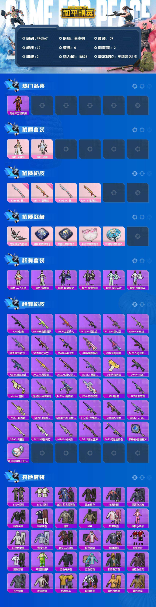 典娜-角色-萨利娅-角色-冰魄-2粉装2特效枪1飞行器-身法素材号】安卓 手Q-2粉装-2特效枪-0载具-1粉色飞行器-18895热力值-1王牌印记-59套装-72枪皮 【热门品类】:角色-军刀雅典娜 【粉色套装】:角色-萨利娅,角色-冰魄 【粉色枪皮等级】:Kar98K-巳巳如意(五级),Mk14-福马献瑞(一级) 【粉色枪皮】:Kar98K-巳巳如意,Mk14-福马献瑞 【