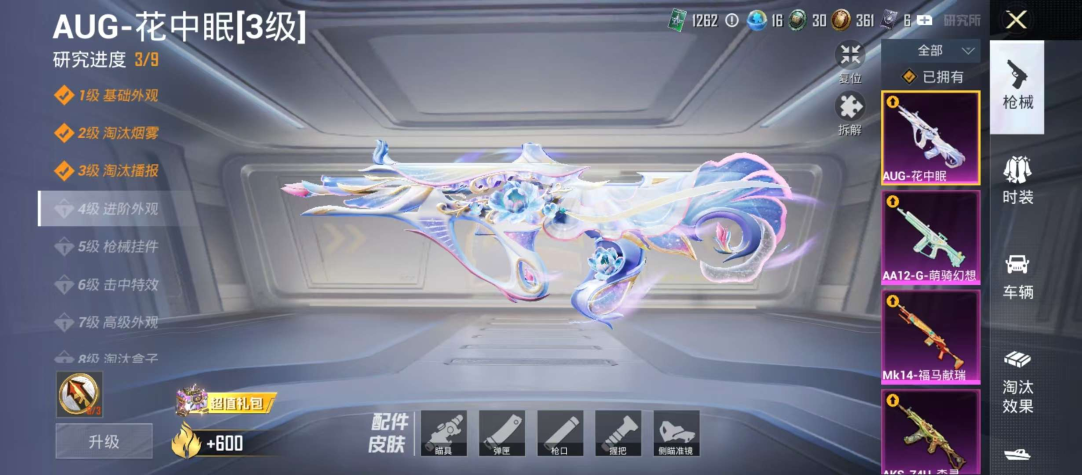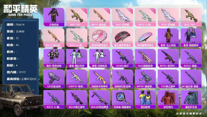 -花中眠-忍者信条-AUG-冰晶雪宝-4特效枪-身法素材号】安卓 手Q-0粉装-4特效枪-0载具-0粉色飞行器-10122热力值-1王牌印记-22套装-45枪皮 【热门品类】:套装-忍者信条 【粉色枪皮等级】:AUG-花中眠(三级),AKS-74U-森灵之息(五级),Mk14-福马献瑞(五级),AA12-G-萌骑幻想(一级) 【粉色枪皮】:AUG-花中眠,AKS-74U-森灵之