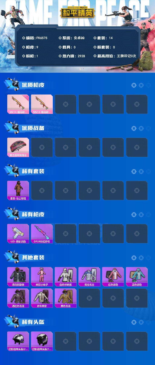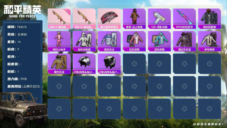 Q-0粉装-1特效枪-0载具-0粉色飞行器-2928热力值-14套装-9枪皮 【粉色枪皮等级】:Mk14-福马献瑞(四级) 【粉色枪皮】:Mk14-福马献瑞 【粉色降落伞】:星之彼岸降落伞 【稀有套装】:套装-马上有钱 【稀有枪皮】:UZI-月影灵韵,DP-28-彩虹符号 【其他套装】:套装-海岛探路者,套装-疯狂小兔子,套装-白色伏地魔,套装-竞技名士,套装-红色运动,套装-