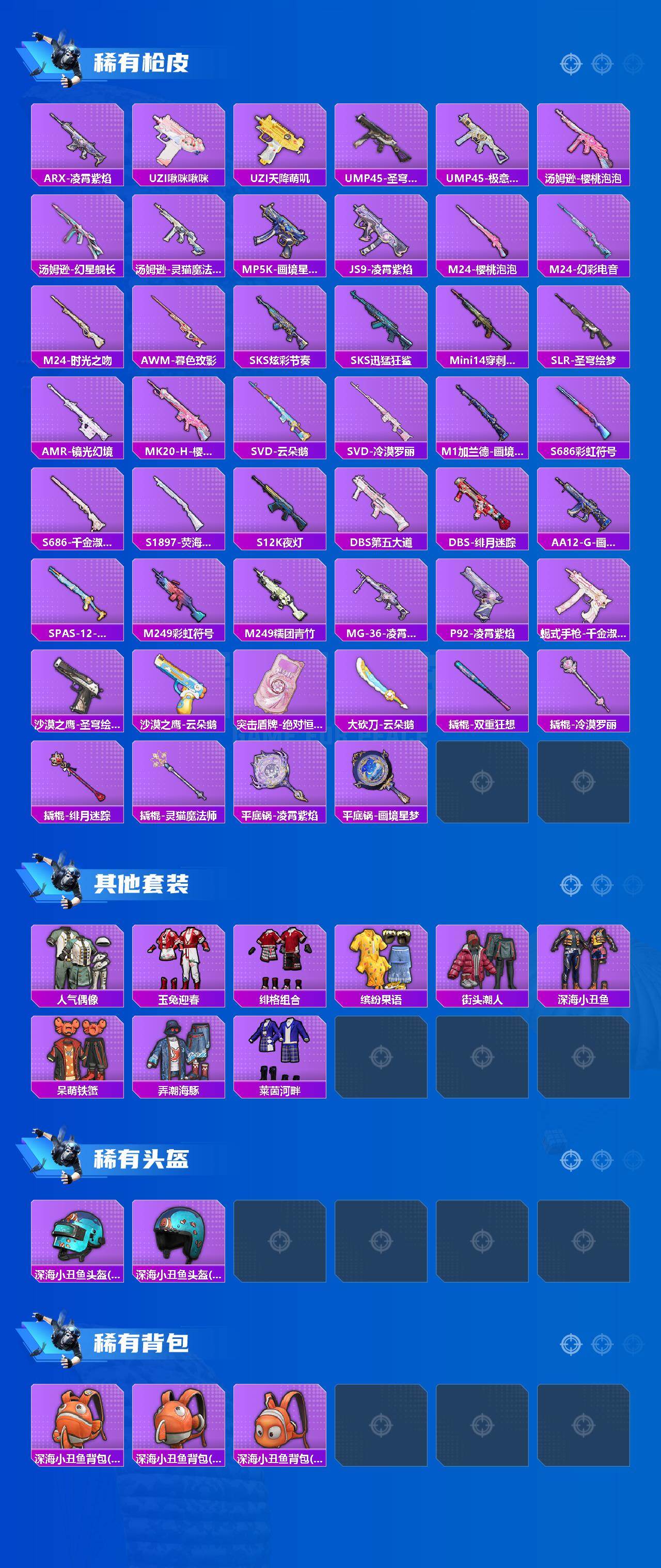 【粉色枪皮等级】:野牛-绯月迷踪(二级),P90-冷漠罗丽(七级),Mk14-樱桃泡泡(一级),DP