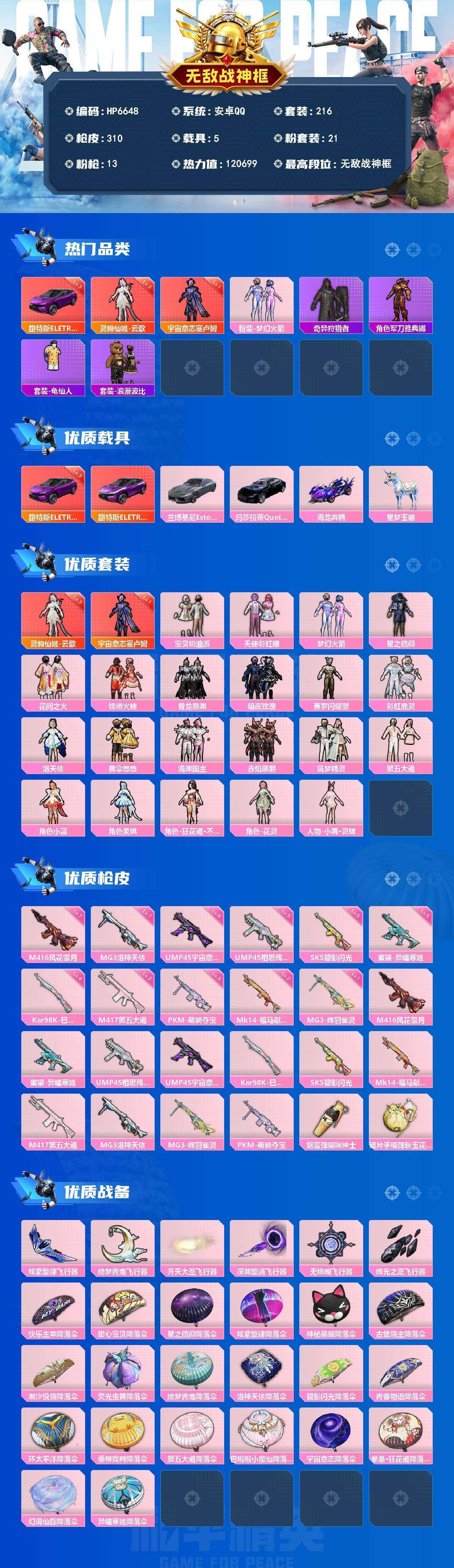 无敌战神号(2红套21粉套13粉枪5载具)云歌3级/塞卢姆1级 /宝贝奶油派/天使彩虹糖/梦幻火箭/星之信仰/花间之火/锦绣火鲤/骨龙祭渊/暗夜玫瑰/赛罗闪耀型/彩虹鹿灵/洛天依/黄伞悠悠/海渊国主/赤焰黑爵/筑梦精灵/第五大道/小蓝/美琪/不知火舞/花灵/小舞·灵珑/路特斯电光紫3级/兰博基尼银翼灰/玛莎拉蒂夜幕蓝/海龙奔腾/星梦玉骢/HP6648-6粉色飞行器-120699热力值-17王牌印