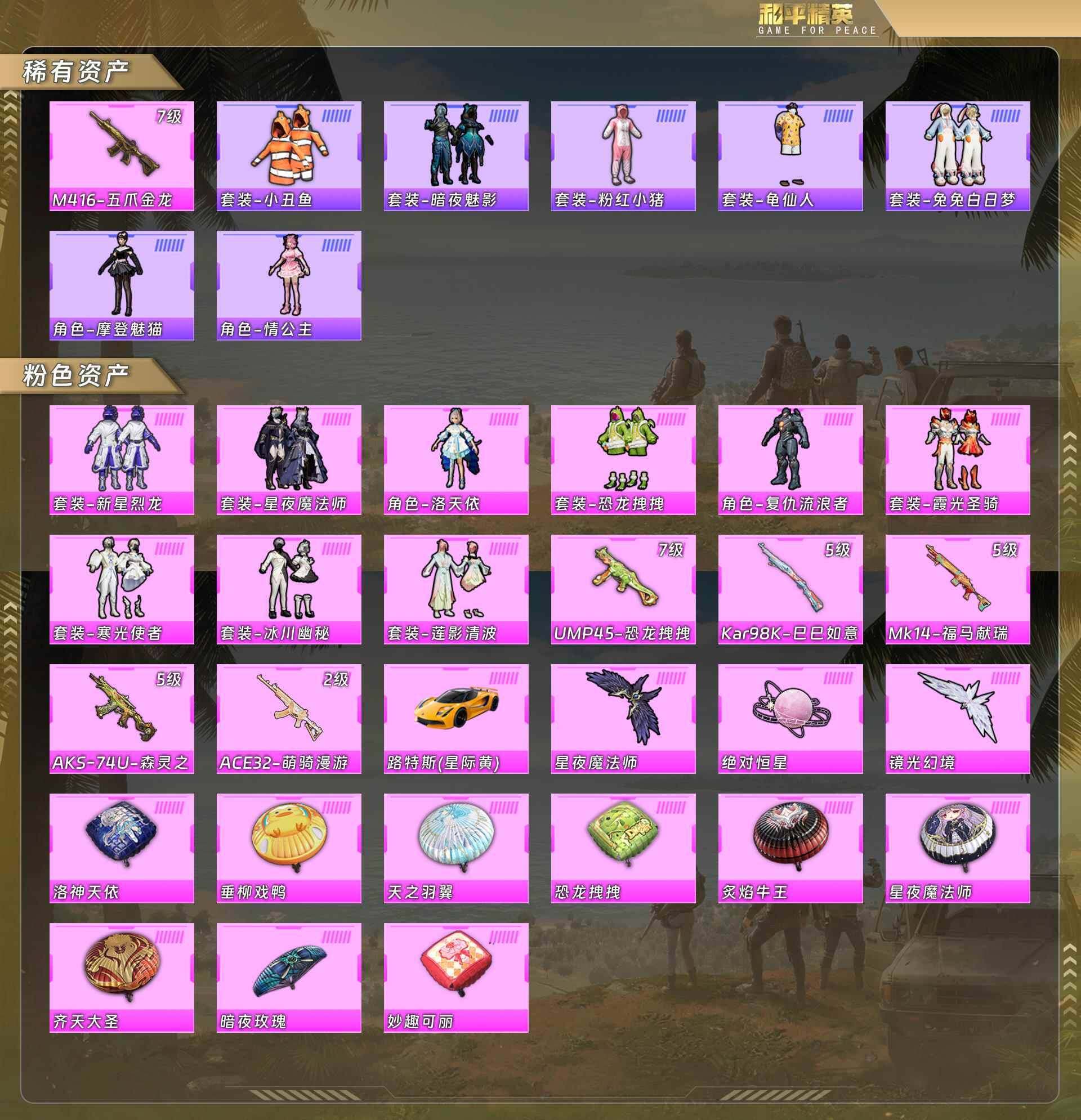 公主号-M4五爪金龙7级/小丑鱼/暗夜魅影/粉红小猪/兔兔白日梦/摩登魅猫/情公主/新星烈龙/星夜魔法师/洛天依/恐龙拽拽/复仇流浪者/霞光圣骑/寒光使者/冰川幽秘/莲影清波/UMP45恐龙拽拽7级/路特斯(黄) (9粉装6粉枪1载具)没战神框 HP6420-3粉色飞行器-59054热力值-13王牌印记-144套装-171枪皮