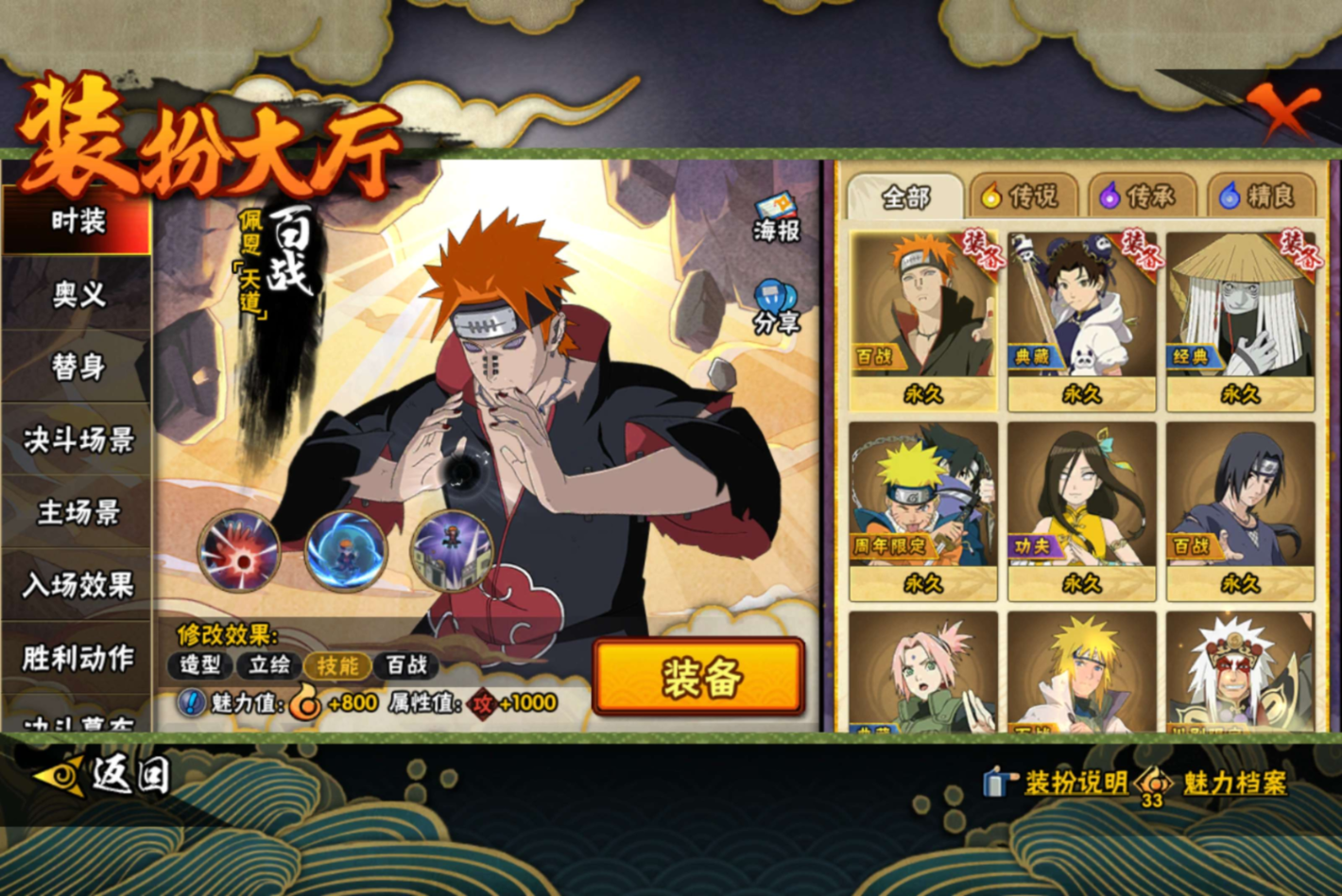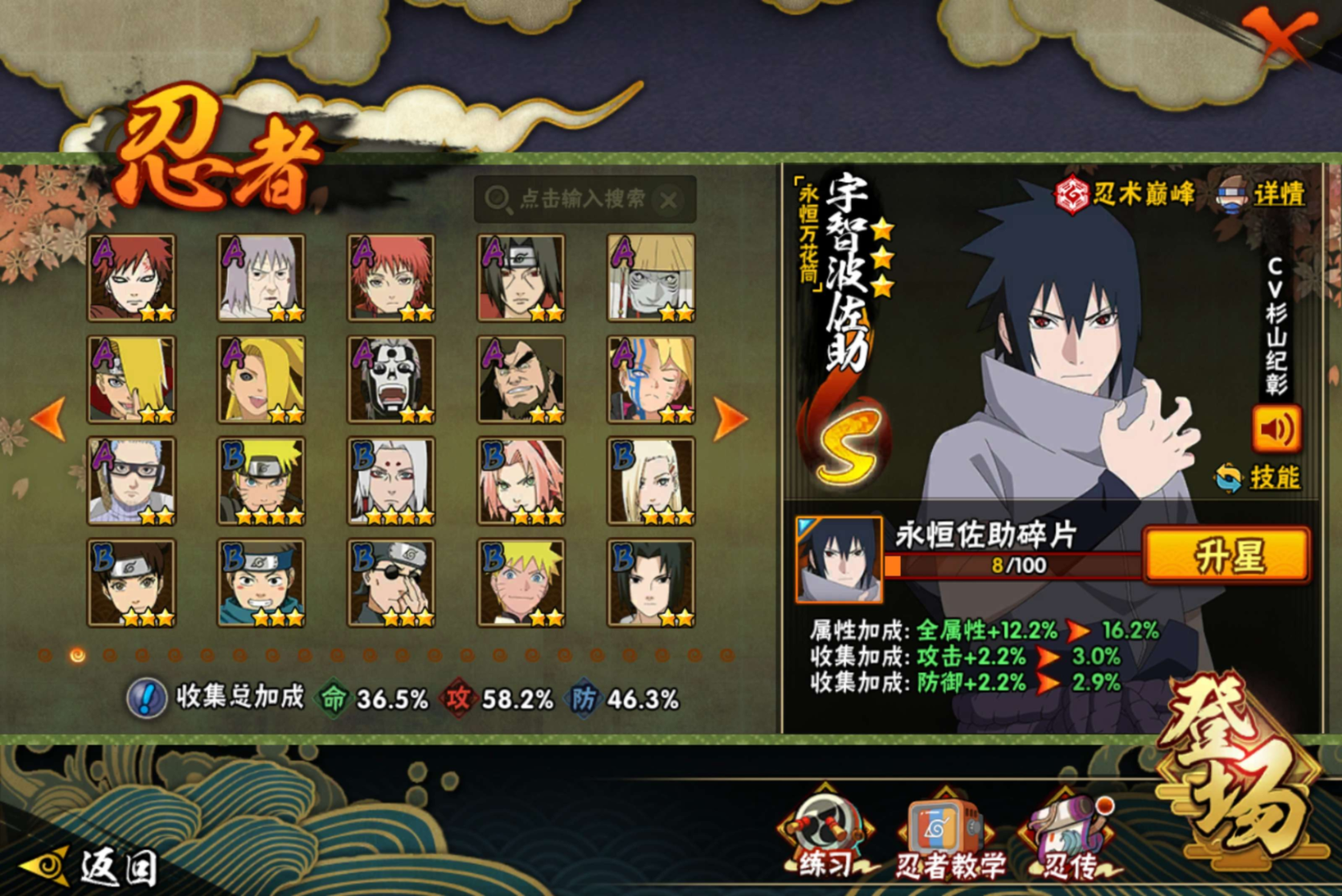【S级忍者】宇智波带土「忍界大战」(3星),自来也「传说中的三忍」(3星),宇智波佐助「永恒万花筒」(3星),漩涡鸣人「九喇嘛连结」(3星),自来也「舞之豪杰」(3星),宇智波鼬「秽土转生」(3星),宇智波鼬「须佐能乎」(3星),漩涡鸣人·宇智波佐助(3星),佩恩「天道」(3星),波风水门(3星),