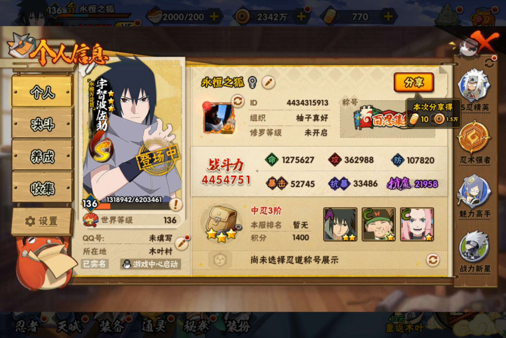 安卓QQ-可二次-免肝免氪成品号-S忍者数:10- A忍者