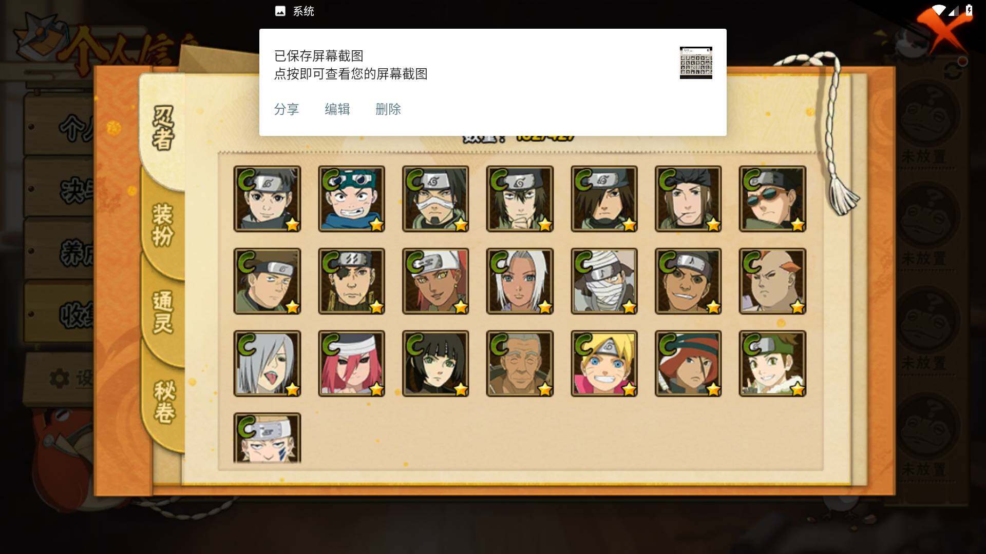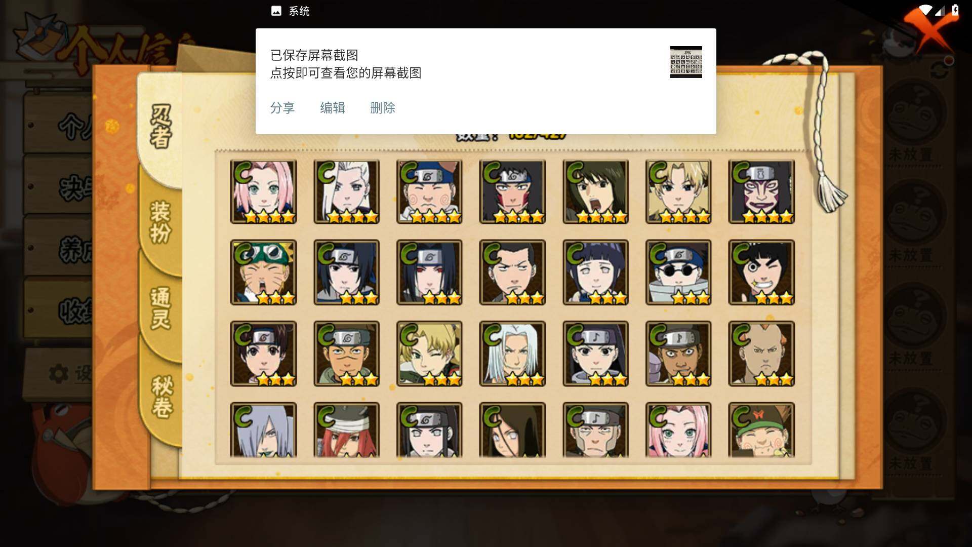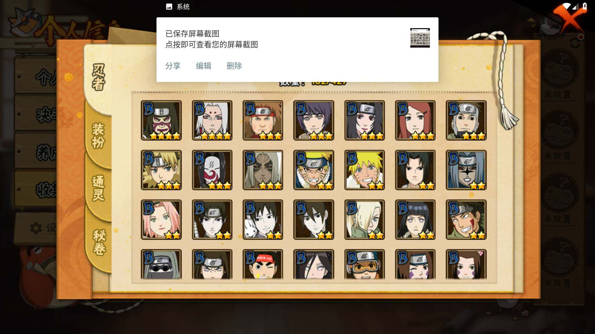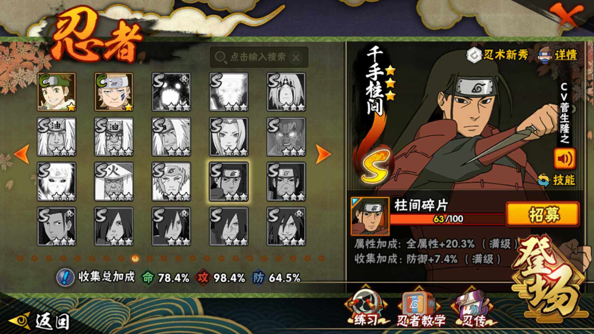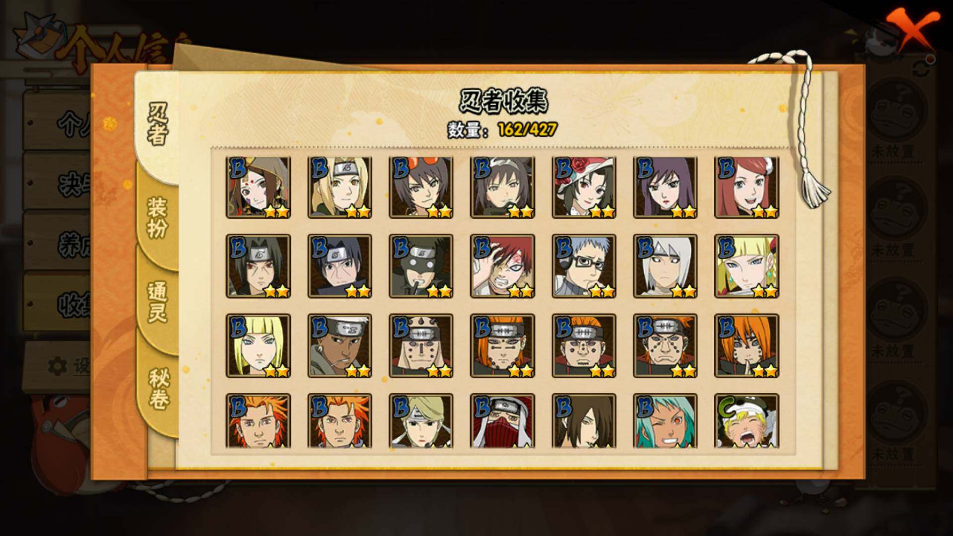 【S级忍者】:长门「秽土转生」(3星),猿飞日斩「秽土转生」(3星),波风水门「秽土转生」(3星),千手扉间「秽土转生」(3星),宇智波斑「秽土转生」(3星),宇智波鼬「须佐能乎」(3星),旗木卡卡西「须佐能乎」(3星),自来也「舞之豪杰」(3星),大蛇丸(3星),纲手「百豪」(3星),波风水