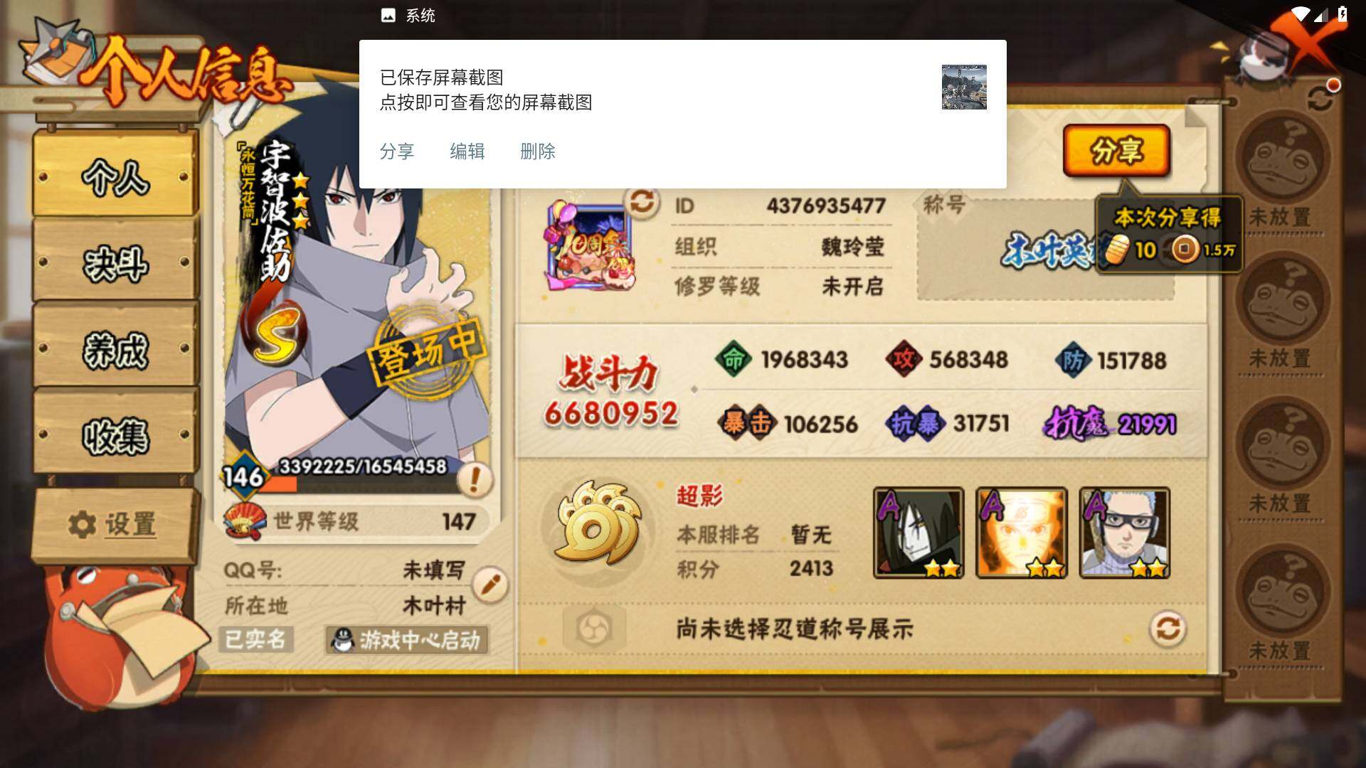 (可免费转苹果)v8 15S 32A 668万战力 1100金币 柱间63片 十尾51片 zp3509