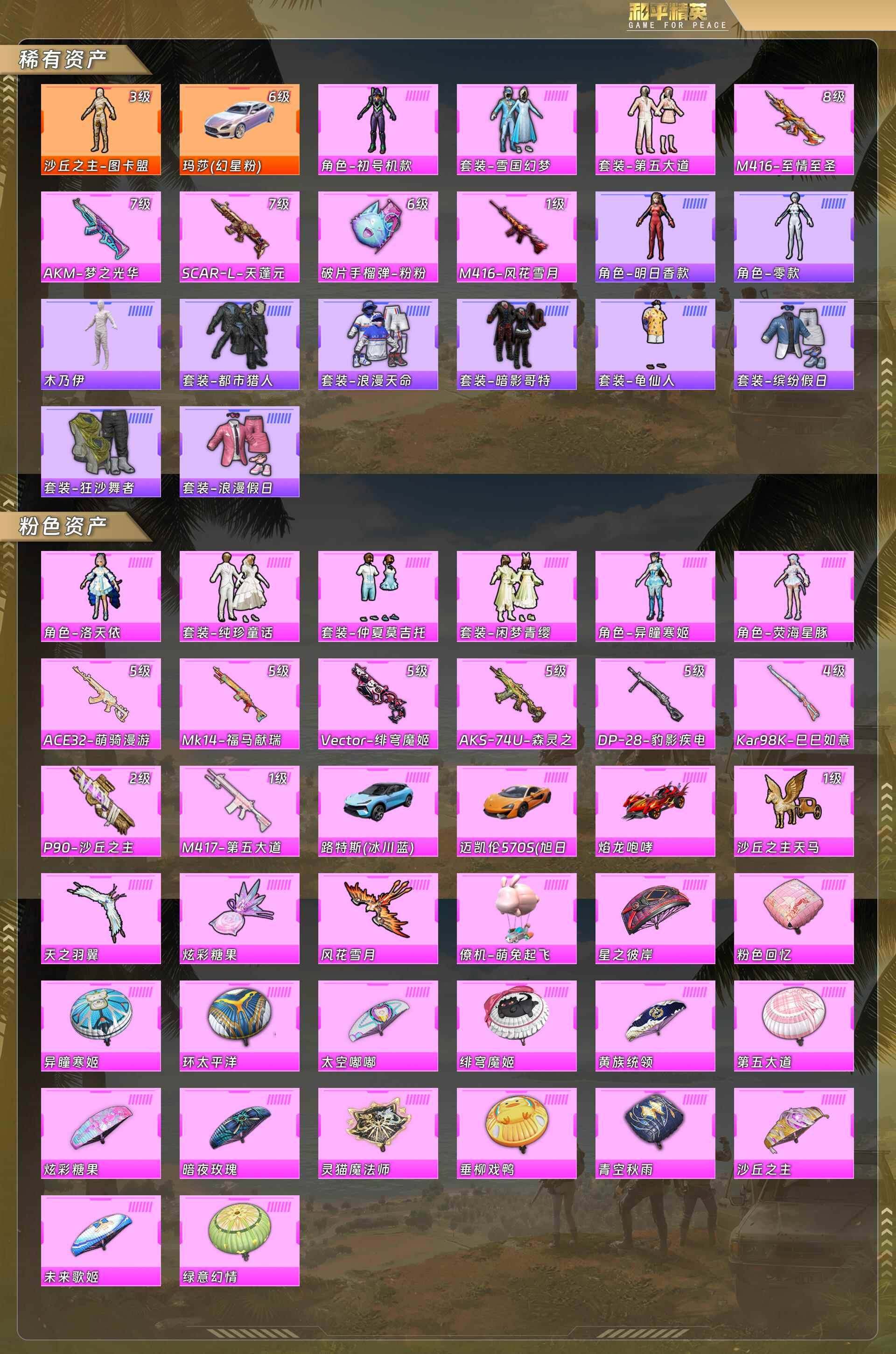 素材号-地铁满天赋-3级图卡盟/满级玛莎拉蒂(幻星粉)/紫螳螂/雪国/木乃伊/都市/浪漫天命/红眼罩/洛天依/纯珍童话/仲夏莫吉托/闲梦青缨/荧海星豚/ACE萌骑漫游5级/P90沙丘之主2级/M4第五大道1级/路特斯(蓝)/迈凯伦(黄)/焰龙咆哮(1神装9粉套13粉枪4载具)没战神框HP6453-4粉色飞行器-100655热力值-23王牌印记-172套装-305枪皮