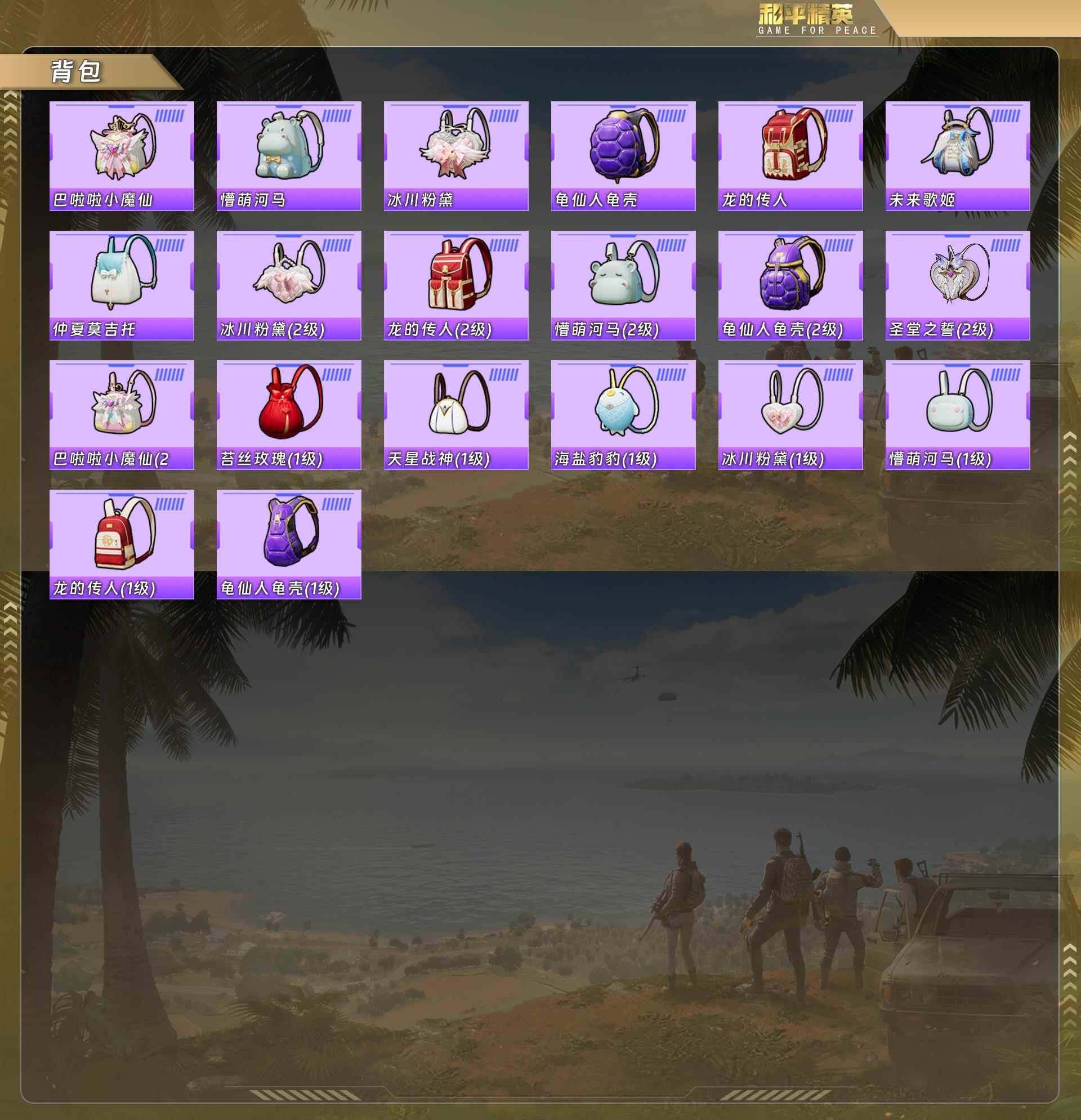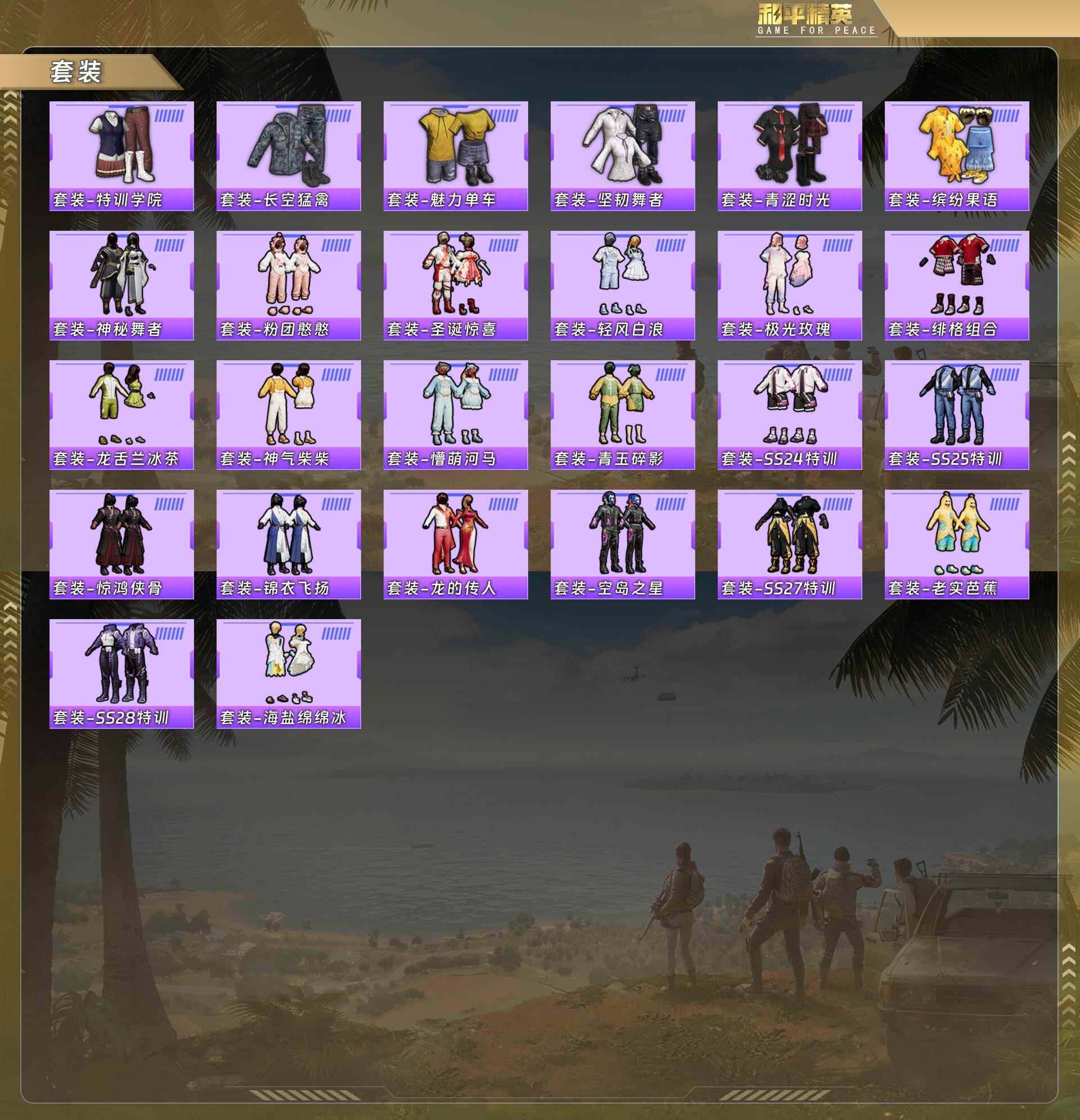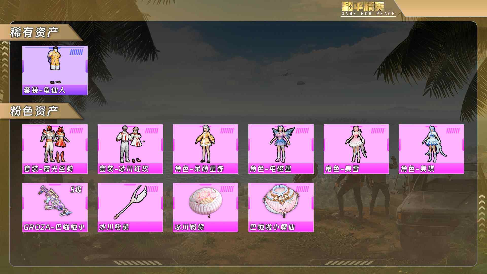 【粉色套装】:粉装-冰川红玫,粉装-霞光圣骑,角色-呆萌星弥,角色-美雪,角色-美琪,角色-电磁星