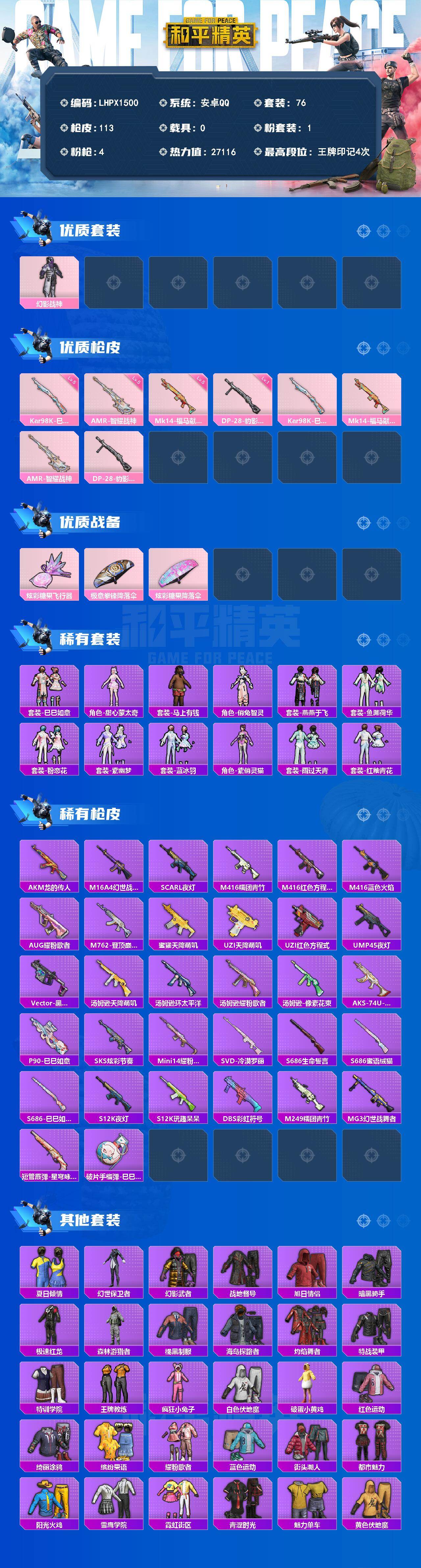 可二次【特价出售/店主推荐】安卓 手Q-1粉装-4特效枪-1粉色飞行器-27116热力值-4王牌印记-76套装-113枪皮【粉色套装】:粉装-幻影战神【粉色枪皮等级】:Kar98K-巳巳如意(五级),Mk14-福马献瑞(五级),AMR-智耀战神(五级),DP-28-豹影疾电(一级)【粉色枪皮】:Kar98K-巳巳如意,Mk14-福马献瑞,AMR-智耀战神,DP-28-豹影疾电【粉色飞行器】:炫彩糖果飞行器